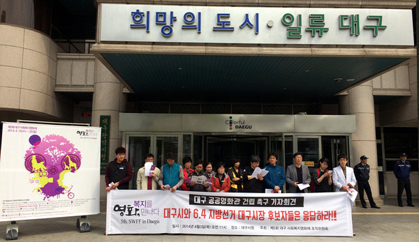 Á¦5ȸ ´ë±¸»çȸº¹Áö¿µÈÁ¦°¡ ¶¹´Ù ~ !! - 6.4 Áö¹æ¼±°Å ´ë±¸½ÃÀå Èĺ¸¿¡°Ô ¿ä±¸ÇÏ´Â ´ë±¸ °ø°ø¿µÈ°ü °Ç¸³ °ø¾àÈ ¹× ´ë¿ÜÀûÀ¸·Î 2014³â Á¦5ȸ ´ë±¸»çȸº¹Áö¿µÈÁ¦ °³ÃÖ¸¦ ÃÖÃÊ·Î ¾Ë¸®´Â ±âÀÚȸ°ßÀÌ 2014³â 4¿ù 3ÀÏ(¸ñ), ¿µÈÁ¦ °³¸·À» 2ÁÖ ¾ÕµÎ°í ¿·È´Ù. À̳¯ ±âÀÚȸ°ßÀº ÀÌÀü±îÁö ¾ð·Ð °£´ãȸ¸¸ ÁøÇàÇØ¿Ô´ø °ÍÀ» ´ëÆø È®´ëÇØ 1ºÎ´Â ´ë±¸½Ãû ¾Õ¿¡¼ ¿µÈÁ¦ °³ÃÖ °øÁö¿Í ´ë±¸ °ø°ø¿µÈ°ü °Ç¸³ Ã˱¸ ³»¿ëÀ¸·Î ¾ß¿Ü ±âÀÚȸ°ßÀ¸·Î, 2ºÎ´Â ½Ç³»¿¡¼ 5ȸ ¿µÈÁ¦ ÇÁ·Î±×·¥ ÇØ¼³ ¹× »ó¿µÀÛ ¼Ò°³ Áß½ÉÀÇ ±âÀÚ °£´ãȸ·Î ³ª´©¾î ÁøÇàÇß´Ù. ´ë±¸»çȸº¹Áö¿µÈÁ¦°¡ ¾ß¿Ü ±âÀÚȸ°ßÀ» ¿¬ °ÍÀº À̹øÀÌ Ã³À½ÀÌ´Ù.