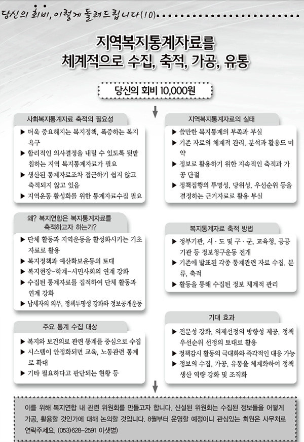 ´ÜüÀÇ Áö¿ª¿îµ¿ Ȱ¼ºÈ, º¹Áö¿¹»êÈ®º¸ÀÇ Åä´ë, º¹ÁöÇöÀå-Çаè-½Ã¹Î»çȸÀÇ ¿¬°è °È, Á¤Ã¥Åõ¸í¼º °È¸¦ À§ÇØ ¿ì¸®º¹Áö½Ã¹Î¿¬ÇÕÀÌ Áö¿ªÀÇ º¹ÁöÅë°è¸¦ È®º¸ÇϰڽÀ´Ï´Ù. °ü½ÉÀÖÀ¸½Å ȸ¿øÀº »ç¹«Ã³·Î ¿¬¶ôÁÖ¼¼¿ä~ |