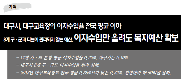 ¡á Àڱݰü¸®°èȹ¸¸ À־ Ãß°¡ ¿¹»ê È®º¸, º¹ÁöºÐ¾ß ¿¡ »ç¿ëÇØ¾ß... - ´ë±¸½Ã¿Í ´ë±¸±³À°Ã»Àº Àü±¹ Æò±Õ¿¡ °¡±î¿î ÀÌÀÚ¼öÀÔ·üÀ» ¿Ã·Áµµ ¾à 17¾ïÀ» È®º¸ÇÒ ¼ö ÀÖ´Ù. ±×¸®°í Àڱݰü¸®¸¸ Á¦´ë·Î ÇÑ´Ù¸é ±× ÀÌ»óµµ ÃæºÐÈ÷ ¿Ã¸± ¼ö ÀÖ´Ù. ¿¹»êÀÌ ¾ø´Ù´Â Çΰè´Â ¾Æ¹«³ª ÇÒ ¼ö ÀÖ´Ù. ±¹¹ÎÀÇ ¼¼±ÝÀ¸·Î ÀÌ·ç¾îÁø ¿¹»êÀ» ¾î¶»°Ô Çϸé ÀÌÀÚ¼öÀÔÀ» ´õ ¿Ã¸±¼ö ÀÖ´ÂÁö, ±× ¿¹»êÀ¸·Î ºÎÁ·ÇÑ ºÎºÐÀÌ ¾îµðÀÎÁö¸¦ ã´Â ³ë·ÂÀ» °ø¹«¿øµéÀÌ ÇØ¾ß ÇÒ Àϵé Áß ÇϳªÀÌ´Ù.