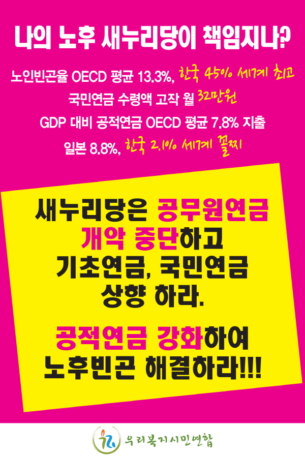 <¿¬±ÝÀº ¿¬±Ý´ä°Ô, °øÀû¿¬±ÝÀ» °ÈÇÏÀÚ. Á¤ºÎ´Â °øÀû¿¬±Ý ÀüüÀÇ ±Þ¿©¼öÁØÀ» ³·Ãß·Á°í ÇÑ´Ù> ¿ì¸®³ª¶ó »çȸº¸ÀåÁ¦µµÀÇ °¡Àå Å« ¹®Á¦Á¡Àº »ç°¢Áö´ë°¡ ³Ð´Ù´Â °ÍÀÌ´Ù. ÀÌÁß ±¹¹Î¿¬±ÝÀº »ç°¢Áö´ë°¡ °¡Àå ³Ð´Ù. °Ç°º¸ÇèÀº ´çÀå º´¿ø¿¡ °¡¾ß ÇÏ´Â ÀÌÀ¯ µîÀ¸·Î »ç°¢Áö´ë°¡ ±×¸® ¸¹Áö ¾ÊÁö¸¸, ´çÀå Áö±Ý ¸Ô°í »ì±âµµ Èûµçµ¥, ³ëÈĸ¦ »ý°¢ÇÏ¸ç ±Þ¿©ÀÇ 9%¸¦ ±¹¹Î¿¬±ÝÀ¸·Î ¸Å´Þ ²¿¹Ú²¿¹Ú ³Ö´Â °Í ÀÚü°¡ Èûµé »Ó ¾Æ´Ï¶ó ºñÁ¤±ÔÁ÷ÀÇ ´ëºÎºÐÀº ±¹¹Î¿¬±Ý¿¡ °¡ÀÔÁ¶Â÷ ¸øÇϰí Àֱ⠶§¹®ÀÌ´Ù. ±×·±µ¥ ´çÀåÀº ÀÌ·± Àú·± ¹æ¹ýÀ¸·Î ³Ñ¾î°£´Ù°í ÇÏÁö¸¸, ³ëÈÄ¿¡ ´ëÇÑ ¾Æ¹«·± ´ëºñÃ¥ÀÌ ¾ø´Ù´Â °ÍÀº ¹Ì·¡ÀÇ Àç¾ÓÀÌ µÉ ¼ö ÀÖ´Ù. ¼¼°è ÃÖ°íÀÇ ³ëÀκó°ïÀ²°ú ¼¼°è ÃÖ°íÀÇ ³ëÀÎÀÚ»ìÀ²Àº ¿ì¸® »çȸÀÇ µ¿ÀüÀÇ ¾ç¸éÀÌ´Ù. Á¤ºÎ´Â ´ë´Ù¼ö ±¹¹ÎµéÀÌ °¡ÀÔÇÑ ±¹¹Î¿¬±Ý ¼ö·É¾×°ú ºñ±³Çϸç, °ø¹«¿ø¿¬±ÝÀÇ ÇüÆò¼ºÀ» ³»¼¼¿ö Å« ÆøÀ¸·Î Ãà¼ÒÇÏ·Á°í ÇÑ´Ù. ±×¸®°í ½Å±Ô °ø¹«¿øÀº ±¹¹Î¿¬±Ý°ú µ¿ÀÏÇÏ°Ô ¼³°èÇÏ·Á ÇÑ´Ù. ±×·±µ¥, 2007³â ±¹¹Î¿¬±Ý ±Þ¿© ¼öÁØÀ» Æò±Õ¼Òµæ ±âÁØÀ¸·Î 1/3À̳ª Ãà¼ÒÇß´Ù. Áï, 40³â °¡ÀԽà Æò±Õ¼ÒµæÀÚÀÇ ±Þ¿©¼öÁØÀÇ ¼Òµæ´ëüÀ²À» 60%¿¡ 40%·Î ³·Ãá °ÍÀÌ´Ù. ÀÌ·¸°Ô µÇ¾î »ç½Ç»ó °ø¹«¿ø¿¬±Ý°ú ±¹¹Î¿¬±ÝÀÇ °ÝÂ÷´Â ´õ¿í ´õ ¹ú¾îÁö°Ô µÇ¾ú´Ù. ±×·±µ¥ °ÝÂ÷¸¦ ´õ¿í ´õ ¹ú¾îÁö°Ô ÇØ³õ°í, Áö±Ý ¿Í¼ ´À´å¾øÀÌ ÀÌ °ÝÂ÷¸¦ ÁÙ¿©¾ß ÇÑ´Ù°í ÇÑ´Ù. ¶ÇÇÑ 65¼¼ ÀÌ»ó ³ëÀο¡°Ô ¿ù 20¸¸¿øÀ» ÁÖ°Ú´Ù´Â ±âÃÊ¿¬±Ýµµ ±¹¹Î¿¬±Ý °¡ÀԱⰣ°ú ¿¬µ¿½ÃÄÑ ±Þ¿©¸¦ »è°¨Çß´Ù. ¹°·Ð °¢ ¿¬±Ý¸¶´Ù °³ÇõÇØ ³ª°¡¾ß ÇÒ °Íµµ ¸¹´Ù. ±×·¯³ª Á¤ºÎ°¡ Àڽŵ鿡°Ô À¯¸®ÇÑ ÀڷḸ Âñ²ûÂñ²û ³»¸é¼ ±¹¹ÎµéÀ» ºÐ¿½ÃŰ´Â °ÍÀº °Ç°ÇÑ Á¤ºÎÀÇ Åµµ°¡ ¾Æ´Ï´Ù. ¿ì¸®°¡ ¸Å´Þ ³»´Â °øÀû¿¬±Ý¿¡ ´ëÇØ ÇÑ ¸¶µðµµ ¸øÇؼ´Â µÇ°Ú´Â°¡? |