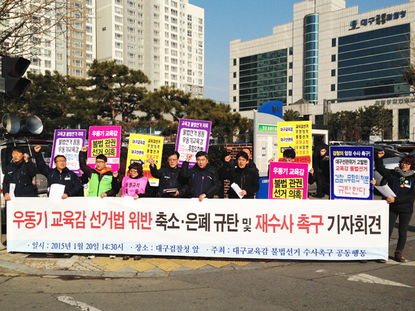 ¿ì¸®º¹Áö½Ã¹Î¿¬ÇÕ, Àü±³Á¶ ´ë±¸ÁöºÎ, ¹ÎÁÖ³ëÃÑ ´ë±¸Áö¿ªº»ºÎ µî ´ë±¸Áö¿ª 30°³ ½Ã¹Î»çȸ³ëµ¿´ÜüµéÀº 1¿ù20ÀÏ ¿ÀÈÄ ´ë±¸Áö°Ë ¾Õ¿¡¼ ±âÀÚȸ°ßÀ» ¿°í, ¿ìµ¿±â ±³À°°¨ÀÇ ¼±°Å°³ÀÔ ÀÇȤÀ» Àç¼ö»çÇØ¾ß ÇÑ´Ù°í Ã˱¸Çß´Ù. °ËÂûÀÇ ¿ìµ¿±â ±³À°°¨ °øÁ÷¼±°Å¹ý ¹«ÇøÀÇ Ã³ºÐÀº ±êÅи¸ ±â¼ÒÇÑ ²¿¸®ÀÚ¸£±â Ãà¼Ò ¼ö»ç·Î ÀÇȤ¸¸ Ű¿ì°í ÀÖ´Ù°í ¸Íºñ³Çß´Ù. ÃÖ±Ù ¼±°Å±âȹ ¸ðÀÇ Àå¼Ò¿´´ø ¿ÀÇǽºÅÚÀÇ ¼ÒÀ¯ÁÖ¿Í ¿ìµ¿±â ±³À°°¨°úÀÇ °ü°è, ¿ì ±³À°°¨¿¡ ´ëÇØ º¸°íÇÑ »ç½Ç µîÀÌ ¾ð·Ð µîÀ» ÅëÇØ ¾Ë·ÁÁö¸é¼ ½Ã¹Î»çȸ´ÜüµéÀº °ËÂûÀÌ ±×µ¿¾È ¿ì ±³À°°¨ÀÇ °ü·Ã ¿©ºÎ°¡ µå·¯³ª¸é ¾ðÁ¦µçÁö ¼ö»çÇÒ ¼ö ÀÖ´Ù°í ¸»ÇؿԱ⠶§¹®¿¡ ¼¼È÷ µå·¯³ª°í ÀÖ´Â ½Çü¿Í ºÒ¹ý °ü±Ç¼±°Å¿¡ ´ëÇØ Àü¸éÀûÀÎ Àç¼ö»ç¸¦ ÇØ¾ß ÇÑ´Ù°í ÁÖÀåÇß´Ù. ÀÌ¿¡ ¾Õ¼ ´ë±¸KBS´Â 1¿ù13ÀϺÎÅÍ 1¿ù16ÀϱîÁö ÃÑ 5Â÷·Ê³ª ¸®Æ÷Æ® º¸µµ¸¦ ÅëÇØ °ËÂûÀÇ ºÁÁֱ⠼ö»ç¿Í Ãà¼Ò ÀºÆó ÀÇȤ µîÀ» ÁýÁß º¸µµÇß´Ù. ´ë±¸KBS´Â 1¿ù13ÀÏ ¡®¼±°Åµµ¿î °ø¹«¿ø °¨½Î±â?¡¯ ¸®Æ÷Æ®¸¦ ³» º¸³»¸é¼ ¡°±¹°¡°ø¹«¿ø¹ý »ó Çü»ç »ç°ÇÀ¸·Î ±â¼ÒµÇ¸é ÀÓ¿ë±ÇÀÚ°¡ Á÷À§ÇØÁ¦¸¦ ÇÒ ¼ö Àִµ¥, ¹Î»ç»ç°ÇÀÌ ¾Æ´Ñ ¼±°Å¹ý À§¹Ý ÇøÀÇ·Î ±â¼ÒµÇ¾úÁö¸¸ À¢ ÀÏ ÀÎÁö ¿ìµ¿±â ±³À°°¨Àº ¾Æ¹«·± Á¶Ä¡¸¦ ÃëÇÏÁö ¾Ê°í ÀÖ´Ù¡±¸ç ù º¸µµ¸¦ ³Â°í, °°Àº ³¯ ¿¬¼Ó ¸®Æ÷Æ®¿¡¼´Â ¡°³»ºÎ ºñ¹Ð¹®¼±îÁö À¯ÃâÇØ ¼±°Å°ø¾àÀ» ¸¸µå´Â µî »ç½Ç»ó ¼±°ÅÄ·ÇÁ¸¦ ¿î¿µÇß´Ù¡±°í º¸µµÇß´Ù. µÎ ¹øÂ° ¸®Æ÷Æ®¿¡¼´Â ¡°Áö³ÇØ 4¿ù17ÀϺÎÅÍ 5¿ù2ÀϱîÁö ÃÑ 7Â÷·Ê³ª ´ë±¸¼±°üÀ§¿¡ Àû¹ßµÉ ¶§±îÁö °è¼ÓµÇ¾ú´Ù¡±°í ÁöÀûÇß´Ù. 1¿ù14ÀÏ ¸®Æ÷Æ®¿¡¼´Â ¡°ÇØ´ç °ø¹«¿ø°ú ÀÛ°¡ µî ±â¼ÒµÈ 4¸íÀº ¼ö½Ã·Î ¹®ÀÚ µîÀ¸·Î ±³À°°¨¿¡°Ô º¸°íÇßÀ¸¸ç, ¿ìµ¿±â ±³À°°¨Àº Áö³ÇØ °ËÂûÁ¶»ç¿¡¼ ºñ¼°¡ ÈÞ´ëÀüȸ¦ °¡Áö°í ÀÖ¾ú°í ÀϺθ¸ º¸°íÇØ ¸ô¶ú´Ù°í ÇØ¸íÇÑ °ÍÀ¸·Î ¾Ë·ÁÁ³´Ù¡±´Â ±â»ç¸¦ º¸µµÇß´Ù. ¸®Æ÷Æ® ¸»¹Ì¿¡´Â °ø¹«¿øÀÇ ¼±°Å Ä·ÇÁ Âü¿©¸¦ ¸ô¶ú´Ù´Â ¿ìµ¿±â ±³À°°¨ÀÇ ÇØ¸í¿¡µµ À̵éÀÌ º¸³½ ¹®ÀÚ¸Þ½ÃÁö´Â ÀÇȤ¸¸ ³²±â°í ÀÖ´Ù°í ÁöÀûÇß´Ù. »ç½Ç»ó ¿ìµ¿±â ±³À°°¨ÀÇ Áö½Ã³ª ¼±°Å°³ÀÔÀ» È®ÀÎÇÑ ¼ÀÀÌ´Ù.