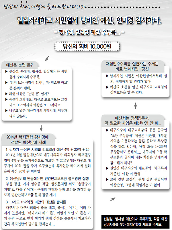 ´ç½ÅÀÇ È¸ºñ, ÀÌ·¸°Ô µ¹·Áµå¸³´Ï´Ù. ¿¼¼¹øÂ°. ¹Ð½Ç°Å·¡ÇÏ°í ½Ã¹ÎÇ÷¼¼ ³¶ºñÇÑ ¿¹»ê, Çö¹Ì°æ °¨½ÃÇÏ´Ù. ¼±½É¼º, Çà»ç¼º ¿¹»êÀÌ ¼öµÎ·èÇÑ ´ë±¸½Ã. ´«¸Õ µ·À¸·Î ¹æÄ¡, º¹Áö¿¬ÇÕÀÌ °¨½ÃÇÕ´Ï´Ù. |