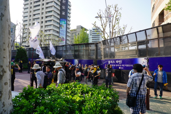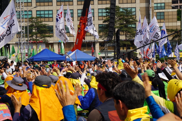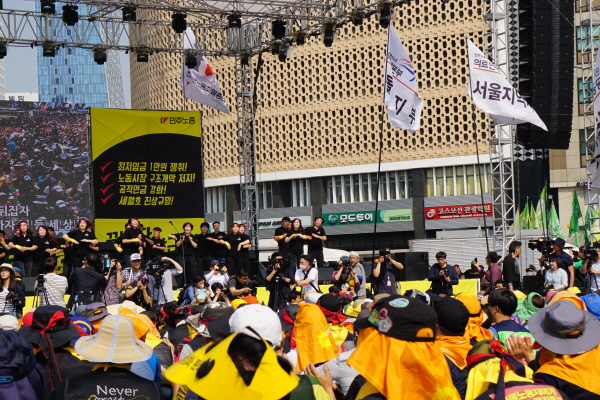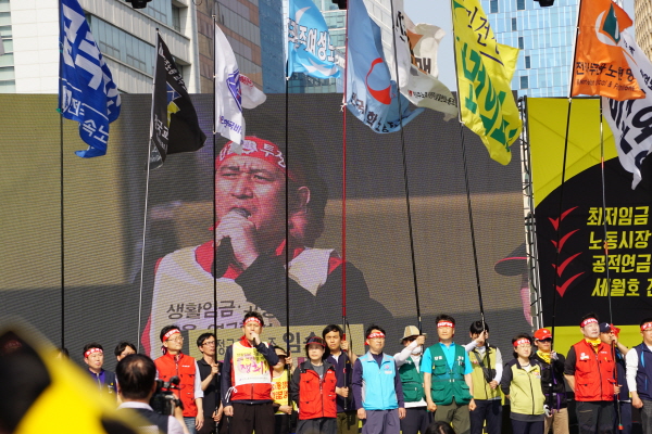 2015³â 5¿ù1ÀÏ, 125Áֳ⠳뵿Àý. ¿©ÀüÈ÷ ¡®»§°ú Àå¹Ì¡¯¸¦ ¿ÜÄ¡´Ù. ÀÌ»ûº° / º¹Áö¿¬ÇÕ »ó±ÙÀÚ ¸Å³â °¢ Áö¿ª¸¶´Ù ³ëµ¿Àý Áýȸ¸¦ °¡Á³Áö¸¸, ¿ÃÇØ 125Áֳ⠳뵿Àý Áýȸ´Â ÃÖ±Ùµé¾î óÀ½À¸·Î ¼¿ï¿¡¼ ¿·È´Ù. ³ëµ¿Àý Áýȸ¿¡ ÀÌ¾î ¼¼¿ùÈ£ Áø»ó±Ô¸í ¹®ÈÁ¦°¡ À̾îÁö´Â 1¹Ú2ÀÏ ÀÏÁ¤À̾ú´Ù. À̹ø ³ëµ¿Àý »ó°æÁýȸ¿¡ º¹Áö¿¬ÇÕ »ó±Ù°¡ ¸ðµÎ°¡ ´çÀÏ ÀÏÁ¤À¸·Î Âü¿©Çß´Ù. ¿ÀÈÄ 3½Ã º» Áýȸ Âü¿©¸¦ À§ÇØ ¾ÆÄ§ 9½Ã¿¡ ¹Ý¿ù´ç¿¡¼ °ø°ø¿î¼ö³ëÁ¶ ´ë°æº»ºÎ°¡ Á¦°øÇÑ ¹ö½º¸¦ ÅÀ´Ù. 125¹øÂ°¸¦ ¸Â´Â 2015³â ³ëµ¿Àý. À̹ø ³ëµ¿Àý ¿ä±¸ ¾ÈÀº ³ëµ¿½ÃÀå ±¸Á¶°³¾Ç Æó±â, °ø¹«¿ø¿¬±Ý °³¾Ç Áß´Ü, °øÀû¿¬±Ý °È, ¼¼¿ùÈ£ ´ëÅë·É·É Æó±â ¹× Áø»ó±Ô¸í µî 4´ë ¿ä±¸¾ÈÀ» ³»°É°í ¼¿ï½Ãû ±¤Àå¿¡¼ ¿·È´Ù.