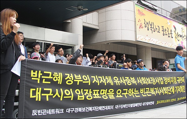 ´ë±¸°æºÏº¸°Çº¹Áö´Üü¿¬´ëȸÀÇ¿Í ¹Ýºó°ï³×Æ®¿öÅ©, ´ë±¸Àå¾ÖÀÎÂ÷º°Ã¶Æó¿¬´ë, ´ë±¸Âü¿©¿¬´ë´Â 23ÀÏ ´ë±¸½Ãû ¾Õ¿¡¼ ±âÀÚȸ°ßÀ» ¿°í "Çѱ¹Àº OECD ±¹°¡ Æò±Õ º¹Áö¿¹»ê Àý¹Ý ¹Û¿¡ ¾ÊµÇ´Âµ¥ Á¤ºÎ´Â Áߺ¹ ¿¹»êÀ» ¸íºÐÀ¸·Î ±×³ª¸¶ ÀÖ´Â ºó°ïÃþ¿¡ ´ëÇÑ ÁöÀÚü º¹Áö¸¶Àú »è°¨ÇÏ·Á ÇÑ´Ù"¸ç "¹ÝÀαÇÀû Á¤ºñ »ç¾÷À» öȸÇÏ°í ¹Ú ´ëÅë·É °ø¾àÀ» ÀÌÇàÇØ ¿ÀÈ÷·Á Áö±Ýº¸´Ù »çȸº¸Àå »ç¾÷À» È®´ëÇØ¾ß ÇÑ´Ù"°í Ã˱¸Çß´Ù. ÀºÀç½Ä ¿ì¸®º¹Áö½Ã¹Î¿¬ÇÕ »ç¹«Ã³ÀåÀº "¾È±×·¡µµ º¹Áö¿¹»êÀÌ ÀûÀºµ¥ ºó°ïÃþÀÇ Ç㸮¶ì¸¦ ´õ Á¹¶ó¸Å·Á Á¤ºÎ°¡ ¾È´ÞÀÌ ³µ´Ù"¸ç "ºó°ïÃþ¿¡°Ô ÃÖ¼Ò ¸î õ¿ø¿¡¼ ¸¹°Ô´Â ¼ö½Ê¸¸¿øÀÇ º¹Áöºñ´Â »ý°è¸¦ ²Ù¸®´Â µ¥ °¡Àå Å« ¼ö´ÜÀε¥ À̸¦ »©¾ÑÀ¸·Á ÇÏ´Â Á¤ºÎ°¡ °ú¿¬ Á¦´ë·Î µÈ Á¤ºÎÀÎÁö ¹¯°í½Í´Ù"°í ÁöÀûÇß´Ù. ¼Ã¢È£ Àαǿ¿¬´ë »óÀÓȰµ¿°¡µµ "º¹Áöºñ´Â Àå¾ÖÀÎ, ±âÃʼö±ÞÀÚ¿¡°Ô ±ÝÁÙ, »ý¸íÁÙ"À̶ó¸ç "º¹Áö°ø¾àÀ» ÆÄ±âÇÑ ¹Ú ´ëÅë·ÉÀº ÁöÀæÃ¼ ¿¹»êÀ» ÁÙÀ̱⺸´Ù ¿ÀÈ÷·Á ´Ã·Á ¼¹Î º¹Áö¸¦ È®´ëÇØ¾ß ÇÑ´Ù"°í ¿ä±¸Çß´Ù.