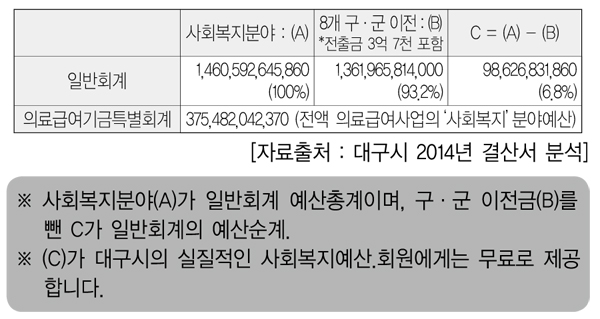 ÀÌ´Â »çȸº¹Áö¿¹»ê ´ëºÎºÐÀÌ ±¹°¡º¹ÁöÁ¤Ã¥À¸·Î½á ÁöÀÚü¿¡ ÀÌÀüµÈ »ç¾÷À̰í, ´ë±¸½Ã°¡ ÀÚüÁýÇàÇÏ´Â º¹ÁöÁ¤Ã¥°ú ¿¹»êÀº °ÅÀÇ ¾øÀ½À» ÀǹÌÇÑ´Ù. ´ë±¸½Ã º»Ã»ÀÌ ½ÇÁúÀûÀ¸·Î ÀÚü ÁýÇàÇÏ´Â ¿¹»ê 986¾ï(C) ¶ÇÇÑ ³ëÀÎÀå±â¿ä¾ç±Þ¿©ºñ 366¾ï, ±¹°íº¸Á¶»ç¾÷ 267¾ï µî °æ»óÀûÀÎ °æºñÀ̸ç, ³ª¸ÓÁö 353¾ï ¶ÇÇÑ 4°³ »ç¾÷¼Ò ¿î¿µ, ´Üü ¿î¿µºñ¿Í ½Ã¼³º¸°»ç¾÷ µéÀÌ´Ù. Áö±Ý²¯ Á¦´ë·Î µÈ Æò°¡°¡ ¾ø´Â °üÇàÀû»ç¾÷°ú ¹Î°£À§Å¹ »ç¾÷µé. <Ç¥ 1> 2014³â ´ë±¸½Ã ÀϹÝȸ°è °á»ê »çȸº¹ÁöºÐ¾ß¿¹»ê
