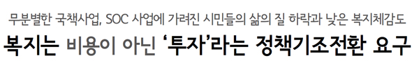 ¡á ±¹Ã¥»ç¾÷ À¯Ä¡, SOC °Ç¼³»ç¾÷¸¸ÀÌ Áö¿ª¹ÎÀÇ ¡®»îÀÇ Áú¡¯À» º¸ÀåÇÏ´Â À¯ÀÏÇÑ ´ë¾ÈÀÌ µÉ ¼ö ¾ø´Ù. º¹Áö¿Í °æÁ¦°¡ ¼±¼øÈ¯ÀûÀÌ µÉ ¼ö ÀÖµµ·Ï ¿¹»ê¹èºÐÀÌ ¿ä±¸µÈ´Ù. ¡á ±Ç¿µÁø ´ë±¸½ÃÀåÀº Åä¸ñ°Ç¼³»ç¾÷¿¡ ÁýÁߵǾî ÀÖ´Â Á¤Ã¥±âÁ¶¸¦ ÀüÈ¯ÇØ¾ß ÇÑ´Ù.
