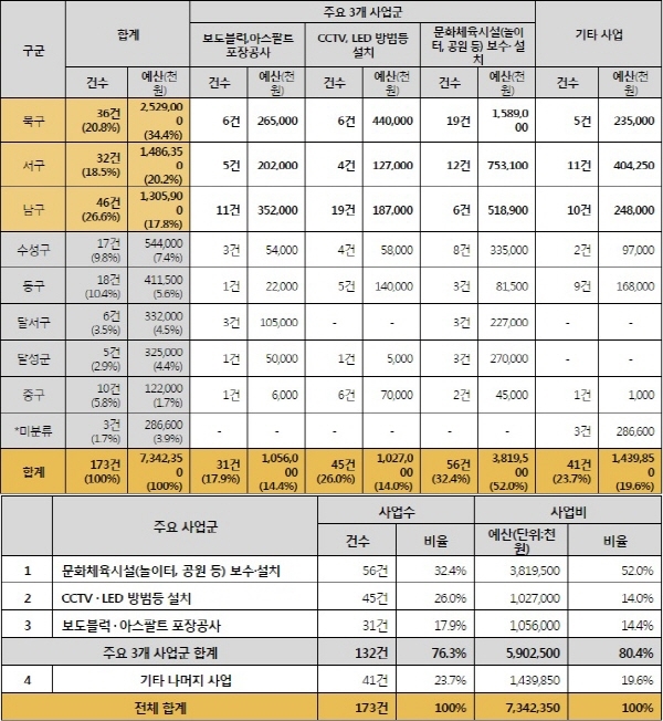 ÀÌ»ó¿ø ±âÀÚ ¿ì¸®º¹Áö½Ã¹Î¿¬ÇÕ, ¡°¹Î¿ø¼º Á¦¾È »ç¾÷ ¼Ô¾Æ³»¾ß¡± ´ë±¸½Ã°¡ Áö³ÇØ Ã³À½ °ø¸ðÇØ ¿ÃÇØºÎÅÍ ¿¹»ê ÁýÇàÀÌ ½ÃÀÛµÈ ´ë±¸½Ã ÁÖ¹ÎÂü¿©¿¹»ê Á¦¾È»ç¾÷ Áß 70% ÀÌ»óÀÌ ¹Î¿ø¼º »ç¾÷ÀÎ °ÍÀ¸·Î È®ÀεƴÙ. ¿¹»êÀ¸·Î º¸¸é 73¾ï¿ø Áß 59¾ï ¿ø(80%)ÀÌ ÁÖ¹ÎÂü¿©¿¹»êÀ» ÅëÇØ ¹Î¿ø¼º »ç¾÷¿¡ »ç¿ëµÇ°Å³ª »ç¿ëµÉ °ÍÀ¸·Î º¸ÀδÙ. ´ë±¸½Ã´Â Áö³ÇØ µÎ Â÷·Ê¿¡ ³ª´² ÃÑ 821°ÇÀÇ ÁֹΠÁ¦¾È »ç¾÷À» °ø¸ðÇß´Ù. ÀÌÁß ºÐ°úÀ§¿øÈ¸ µîÀ» °ÅÃÄ ÃÖÁ¾ È®Á¤µÅ ¿ÃÇØ ¿¹»êÀÌ ¹Ý¿µµÈ »ç¾÷Àº ¸ðµÎ 173°ÇÀÌ´Ù. Àüü °ø¸ð »ç¾÷ Áß ¾à 21.1%°¡ ½ÇÁ¦·Î ¿¹»êÀÌ ¹Ý¿µµÈ °Í. ¿ì¸®º¹Áö½Ã¹Î¿¬ÇÕ(º¹Áö¿¬ÇÕ)Àº 5ÀÏ ¿¹»êÀÌ ¹Ý¿µµÈ »ç¾÷ 173°ÇÀ» À¯Çüº°, Áö¿ªº°·Î ºÐ¼®ÇÏ°í °á°ú¸¦ °ø°³Çß´Ù. º¹Áö¿¬ÇÕ ºÐ¼® °á°ú¿¡ µû¸£¸é 173°ÇÀº Å©°Ô ¹®ÈüÀ°½Ã¼³ º¸¼ö ¹× ¼³Ä¡ »ç¾÷, CCTV, LED ¹æ¹üµî ¼³Ä¡ »ç¾÷, º¸µµºí·°, ¾Æ½ºÆÈÆ® Æ÷Àå°ø»ç µî ¹Î¿ø¼º »ç¾÷°ú ±âŸ »ç¾÷À¸·Î ºÐ·ù °¡´ÉÇß´Ù. ±¸Ã¼ÀûÀ¸·Î º¸¸é ¹®ÈüÀ°½Ã¼³ º¸¼ö ¹× ¼³Ä¡ »ç¾÷ 56°Ç(38¾ï 1,900¸¸ ¿ø), CCTV, LED ¹æ¹üµî ¼³Ä¡ »ç¾÷ 45°Ç(10¾ï 2,700¸¸ ¿ø), º¸µµºí·°, ¾Æ½ºÆÈÆ® º¸Àå°ø»ç 31°Ç(10¾ï 5,600¸¸ ¿ø)À¸·Î ¹Î¿ø¼º »ç¾÷¸¸ 132°Ç(76.4%)¿¡ ´ÞÇÑ´Ù.