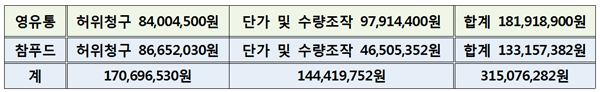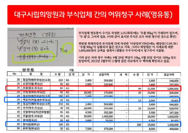 µû¶ó¼ ´ë±¸Èñ¸Á¿ø´ëÃ¥À§´Â Èñ¸Á¿øÀÌ ±×µ¿¾È ÁÖÀåÇÑ ¾÷üÀÇ ÀϹæÀû ºÎ´çÀ̵æÀÌ ¾Æ´Ï¶ó Á¶Á÷Àû ºñ¸®¶ó°í ÁÖÀåÇÏ¸ç ±â´Éº¸°»ç¾÷ µî Àü¸éÀûÀÎ Á¶»ç¿Í ¼ö»ç°¡ ºÒ°¡ÇÇÇÏ´Ù°í ÁÖÀåÇß´Ù. ÀÌ¿¡ ´ëÇØ Èñ¸Á¿øÀº ¾û¶×ÇϰԵµ ¡®¼ö»çÀÇ·ÚÇÏ¿© Á¦º¸ÀÚ¸¦ ã°Ú´Ù¡¯, ¡®¿ì¸®µµ ¸ð¸£´Â ÀÚ·á´Ù¡¯¶ó´Â ÀÔÀ常 ÃëÇϰí ÀÖ´Ù. »ý°èºñ(Áֺνĺñ) ÀÌÁßÀåºÎ ºÐ¼®°á°ú 2012³â ¾à 4¾ï Ⱦ·É, ³³Ç°¾÷ü´Â Ư¼ö°ü°è·Î ÇϳªÀÇ ¾÷ü Á¦º¸µÈ 2012³â 2¿ù~11¿ù ¿µÀ¯Åë, ÂüǪµå¿Í Èñ¸Á¿ø°£ÀÇ ÀÌÁßÀåºÎ¸¦ ºÐ¼®ÇÒ °á°ú, ½ÇÁ¦ ³³Ç°ÇÑ °Í°ú û±¸ÇÑ ³³Ç°ÀÇ Â÷¾×Àº 315,076,282¿øÀ̾ú´Ù. ¸Å¿ù Â÷¾×Àº 3õ¸¸¿ø Á¤µµ·Î 2012³â 1¿ù°ú 12¿ùºÐÀ» Ãß»êÇÏ¿´À» ¶§ 3¾ï7õ¸¸ ¿ø ÀÌ»óÀÇ Â÷¾×ÀÌ ¹ß»ýÇØ ¿¬°£ 4¾ï¿øÀ» Ⱦ·ÉÇÑ °ÍÀ¸·Î ÆÄ¾ÇµÈ´Ù. À§ ±Ý¾× Áß ÇãÀ§Ã»±¸¸¦ ÅëÇØ 2012³â 2¿ùºÎÅÍ 11¿ù±îÁö 10°³¿ù°£ 170,696,530¿ø(ÇãÀ§Ã»±¸)À» Á¶ÀÛÇß°í, ´Ü°¡ ¹× ¼ö·®À» Á¶ÀÛÇÏ¿© Â÷¾×À» ¹ß»ý½ÃŲ ±Ý¾×Àº 144,419,752¿ø¿¡ À̸¥´Ù. ´ëºÎºÐ ºÎ½ÄÀç·á¸¦ ÇãÀ§Ã»±¸Çϰųª ´Ü°¡ ¹× ¼ö·®Á¶ÀÛÀ» ÇÑ °ÍÀ¸·Î ½Ã¼³ºñ¸®ÀÇ ÀüÇüÀûÀÎ ÇüÅ´Ù.