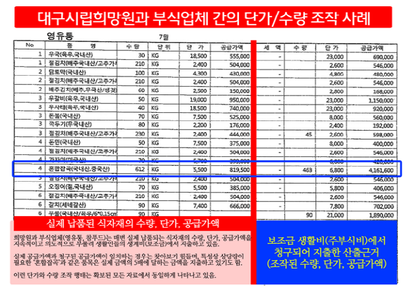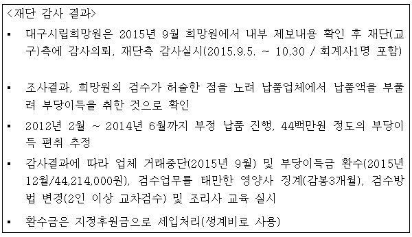 ´ë±¸½Ã¸³Èñ¸Á¿ø ÀαÇÀ¯¸° ¹× ºñ¸®Ã´°á ´ëÃ¥À§¿øÈ¸(ÀÌÇÏ, ´ë±¸Èñ¸Á¿ø´ëÃ¥À§)´Â 10¿ù6ÀÏ ´ë±¸½Ã¸³Èñ¸Á¿øÀÇ ´ç½Ã ȸ°è°úÀå ¼ö³à¿Í ½ÄÀÚÀ糳ǰ¾÷ü °£¿¡ ÀÛ¼ºÇÑ °ÍÀ¸·Î º¸ÀÌ´Â ÀÌÁßÀåºÎ(2012.2~11¿ù)¸¦ À͸í Á¦º¸ ¹Þ¾Æ ºÐ¼®ÇÑ °á°ú 2012³â¿¡¸¸ »ý°èºñ(Áֺνĺñ)¸¦ ¿¬°£ ¾à 4¾ï ¿øÀ» Ⱦ·ÉÇß´Ù´Â ÀÇȤÀ» ±âÀÚȸ°ßÀ» ÅëÇØ °ø°³Çß´Ù. À̳¯ °ø°³ÇÑ »ý°èºñ 4¾ï Ⱦ·É ÀÇȤÀº ´ë±¸½Ã¸³Èñ¸Á¿øÀÌ ÀÛ¼ºÇÏ¿© ´ë±¸½ÃûÀÌ ½ÃÀÇȸ µî¿¡ º¸°íÇÑ Àç´Ü ÀÚü °¨»ç°á°ú(2015³â 9¿ù)ÀÎ ¡®2012³â 4¿ù ~ 2014³â 6¿ù±îÁö ³³Ç°¾÷ü°¡ ³³Ç°¾×À» ºÎÇ®·Á 4,400¸¸¿øÀÇ ºÎ´çÀ̵æÀ» ÃëÇØ ȯ¼öÇÏ¿© »ý°èºñ·Î »ç¿ë¡¯ Çß´Ù´Â °Í°ú ÀüÇô ´Ù¸¥ ³»¿ëÀÌ´Ù. ´ç½Ã Àç´Ü°¨»ç¿¡¼´Â ³³Ç°¾÷ü¸¦ °í¹ßÇÏÁö ¾Ê¾Ò°í, º¸Á¶±ÝÀ» ´ë±¸½Ã¿¡ ¹ÝȯÇÏÁöµµ ¾Ê¾Ò´Ù. ´ë±¸½Ã´Â À̰°Àº »ç½ÇÁ¶Â÷ ¸ô¶ú´Ù.