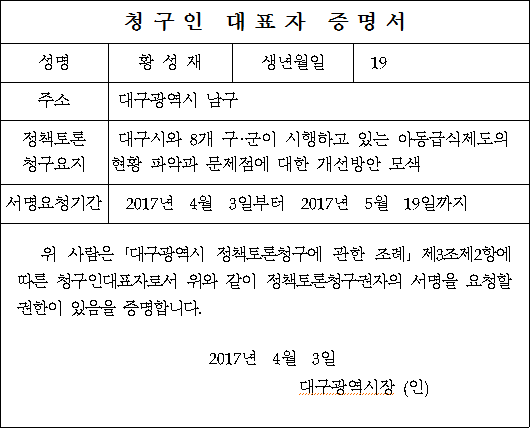 Áö³ 2¿ù 23ÀÏ ´ë±¸½ÃÀÇ ¾Æµ¿±Þ½Ä¿¹»êÀÌ ¸Å³â 30¾ï ¿ø °¡·® ¾²Áö ¸øÇÏ°í ºÒ¿ëó¸® µÇ¾î Á¦´ë·Î µÈ Á¦µµ¿î¿µÀÌ µÇÁö ¸øÇÏ´Â ¹®Á¦Á¡À» ²¿Áý´Â º¸µµÀڷḦ ¹ßÇ¥ÇØ ¸¹Àº ¾ð·ÐÀÌ °ü½ÉÀ» º¸¿´½À´Ï´Ù. º¹Áö¿¬ÇÕÀÌ È®ÀÎÇÑ ¾Æµ¿±Þ½ÄÁýÇàÀܾ×ÀÌ ¸Å³â °ú´ÙÇÏ°Ô ¹ß»ýÇÏ´Â ÀÌÀ¯·Î´Â, ÇöÀç 1½Ä ´Ü°¡ 4,000¿ø ±âÁØÀ¸·Î ¸Å¿ù ÃÊ ÀüÀÚ±Þ½ÄÄ«µå·Î ÃæÀüÀÌ µÇ´Âµ¥, ÀÌ Ä«µåÁ¦µµ´Â ¾ÆÀ̵éÀÌ ¿©·¯ ÀÌÀ¯·Î »ç¿ëÇÏÁö ¸øÇÏ°í ³²´Â ±Ý¾×Àº ¸Å¿ù ÃÊ ÃæÀüµÇ±âÀü ¹«Á¶°Ç ¼Ò¸êµÇ´Â °Í, ¾ÆÀ̵éÀÌ ÀÌ¿ëÇÒ ¼ö ÀÖ´Â °¡¸ÍÁ¡ÀÌ °ÅÀÇ ´ëºÎºÐ ÆíÀÇÁ¡À¸·Î Á¦ÇÑµÇ¾î ´Ù¾çÇÑ ±Þ½ÄÀÌ ¾î·Æ´Ù´Â °Í, ¸¶Áö¸·À¸·Î ÀÌ·¯ÇÑ ¾Æµ¿±Þ½ÄÁ¦µµÀÇ ¹®Á¦Á¡Àº ¸Å³â ¹ß»ýÇÏ¿© ÁöÀÚüµµ ¾Ë°í ÀÖÁö¸¸ Á¦µµ°³¼±¿¡´Â ¼ÕÀ» ³õ°í ÀÖ¾ú´Ù´Â Á¡À̾ú½À´Ï´Ù. 2005³â¿¡ Á¤ºÎ¿¡¼ Áö¹æÀ¸·Î À̾çµÈ ¾Æµ¿±Þ½ÄÁ¦µµ¿¡ ´ëÇØ ´ë±¸½Ã´Â »ý»ö¸¸ ³»°í, ¿¹»êÀº ÀÖÁö¸¸ Á¦µµ°³¼±À¸·Î ¾ÆÀ̵鿡°Ô Á¦´ë·Î µÈ ÇýÅÃÀ» ÁÖ·Á´Â Á¤Ã¥°³¼±Àº ¿Ü¸éÇϰí ÀÖ´Â »óȲÀ̾ú½À´Ï´Ù. ÀÌ¿¡ ´ë±¸½Ã ¾Æµ¿±Þ½ÄÁ¤Ã¥ÀÇ Àü¹ÝÀûÀÎ ¹®Á¦Á¡À» ¾Ë¾Æº¸°í °³¼±¹æ¾ÈÀ» ¸¶·ÃÇϱâ À§ÇØ ´ë±¸½Ã¿¡ Á¤Ã¥Åä·Ðû±¸¸¦ Á¢¼öÇÏ¿´°í(û±¸ÀδëÇ¥ÀÚ: Ȳ¼ºÀç), 4¿ù 3ÀÏÀÚ·Î ¡®Ã»±¸ÀÎ ´ëÇ¥ÀÚ Áõ¸í¼¡¯¸¦ ±³ºÎ¹Þ¾Æ 5¿ù 19ÀϱîÁö 19¼¼ ÀÌ»óÀÎ ´ë±¸½Ã¹Î 300¸íÀÇ ¼¸íÀ» ¹Þ¾Æ ´ë±¸½Ã¿¡ Á¦ÃâÇϸé Á¤Ã¥Åä·Ðȸ¸¦ °³ÃÖÇÏ°Ô µË´Ï´Ù. Á¤Ã¥Åä·Ðȸ °³ÃÖ¿¡ ¿©·¯ºÐÀÇ ¸¹Àº °ü½ÉÀ» ¹Ù¶ø´Ï´Ù. Á¤Ã¥Åä·Ðû±¸¿Í ¼¸í¹æ¹ý¿¡ ´ëÇØ¼´Â ¾Æ·¡³»¿ëÀ» ÂüÁ¶¹Ù¶ø´Ï´Ù. ------------------------------------------------------------------------------- Á¤Ã¥Åä·Ðû±¸¶õ? 2008³â ´ë±¸±¤¿ª½Ã´Â ½Ã¹Î´ÜüÀÇ Á¦¾ÈÀ» ¹Þ¾Æ ½Ã¹ÎµéÀÌ ´ë±¸½ÃÁÖ¿äÁ¤Ã¥¿¡ ´ëÇØ ÀǰßÀ» Á¦½ÃÇÏ°í ³íÀÇÇÒ ¼ö ÀÖ´Â ÁÖ¹ÎÂü¿©È°¼ºÈ¸¦ À§ÇÑ Åä·Ðȸ °³ÃÖ¸¦ û±¸ÇÒ ¼ö ÀÖ´Â ¡®´ë±¸±¤¿ª½Ã Á¤Ã¥Åä·Ðû±¸¿¡ °üÇÑ Á¶·Ê¡¯¸¦ Á¦Á¤Çß´Ù. ´ë±¸½Ã¹Î(19¼¼ ÀÌ»ó) 300¸í ÀÌ»óÀÇ ¼¸íÀ» ¹Þ¾Æ Á¢¼öÇϸé 1°³¿ù ³»¿¡ Á¤Ã¥Åä·Ðû±¸ ½ÉÀÇÀ§ÀÇ ½ÉÀÇ, ÀǰáÀ» °ÅÃÄ Åä·Ð °³ÃÖ¿©ºÎ°¡ °áÁ¤µÈ´Ù. ±×¸®°í Åä·Ð°³ÃÖ¸¦ °áÁ¤ÇÑ ³¯·ÎºÎÅÍ 1°³¿ù À̳»¿¡ Åä·Ðȸ¸¦ ½Ç½ÃÇϵµ·Ï µÇ¾î ÀÖ´Ù. --------------------------------------------------------------------------- [¼¸í Âü¿©¹æ¹ý] 1. 19¼¼ ÀÌ»ó ´ë±¸½Ã¹Î(Áֹεî·Ï»ó ÁÖ¼Ò)ÀÌ¸é ´©±¸³ª ¼¸í°¡´É. Áֹεî·Ï»ó ÁÖ¼Ò¸¦ Á¤È®ÇÏ°Ô ±âÀç. 2. º¹Áö¿¬ÇÕ¿¡ ¿¬¶ôÁֽøé Á÷Á¢ ¶Ç´Â e¸ÞÀÏ·Î ¼¸í¿ëÁö¸¦ º¸³» µå¸®°í, ÀÛ¼ºÇÑ ¼¸í¿ëÁö(¿øº»)À» º¸³»ÁÖ½Ã¸é µË´Ï´Ù. °ü·Ã¹®ÀÇ´Â (053) 628-2590~1, 010-8587-2441(Ȳ¼ºÀç).