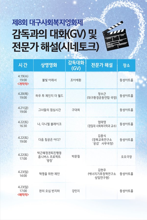 ¡ã 19ÀÏ °³¸·À» ÃàÇÏ´Â µÚÇ®ÀÌ À̿ܿ¡ ÀïÁ¡±âȹ ¡®¼¼»óÀ» ¹Ù²Ù±â À§ÇØ ¹«¾ùÀ» ÇÒ °ÍÀΰ¡? ÁÖÁ¦·Î <Çõ¸íÀ» À§ÇÑ Á¦¾È>°ú <ÇÏ¿ì Åõ üÀÎÁö ´õ ¿ùµå> µî 3Æí, »çȸº¹Áö ¹®Á¦¸¦ ÇÔ²² °í¹ÎÇÏ´Â ÇØ¿Ü¿µÈ <³ª, ´Ù´Ï¿¤ ºí·¹ÀÌÅ©>¿Í <´ÙÀ½ ħ°øÀº ¾îµð?>, ½Ã ¡¤ û°¢ Àå¾ÖÀεé°ú ÇÔ²² º¼ ¼ö ÀÖ´Â ¹è¸®¾îÇÁ¸®¿µÈ <¼ÒÁßÇÑ ³¯ÀÇ ²Þ>, <À§ ĵ µÎ ´ñ>, ¼¿ïȯ°æ¿µÈÁ¦ ¿ì¼ö´ÜÆíÀÛ, ±×¸®°í ±¹³»½ÅÀÛ´ÙÅ¥·Î <±×³àµéÀÇ Á¡½É½Ã°£>°ú Áְźó°ïÀ» ´Ù·é Æó¸·ÀÛ <õ¿¡ ¿À½Å ¹ÝÁöÇÏ> µîÀÌ °ü°´À» ±â´Ù¸®°í ÀÖ´Ù.