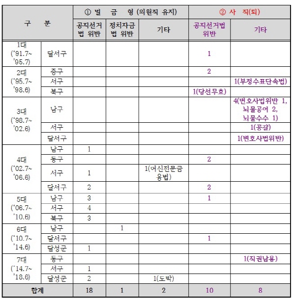 ´ë±¸ ±¤¿ªÀÇ¿ø 18¸í, ±âÃÊÀÇ¿ø 39¸í ºñ¸® ¿¬·ç ´ë±¸½ÃÀÇ¿øÀÇ °æ¿ì, 1991³â 7¿ù ÃÊ´ë ´ë±¸½ÃÀÇȸ°¡ ±¸¼ºµÈ ÀÌÈÄ ºñ¸®·Î ÀÎÇØ »çÁ÷(Åð)ÇÑ ½ÃÀÇ¿øÀº ÃÑ 8¸íÀ̰í, ÀÇ¿øÁ÷Àº À¯ÁöÇßÀ¸³ª ¹ú±ÝÇüÀ» ¹ÞÀº ½ÃÀÇ¿øµµ 8¸íÀÌ´Ù. Á÷±Ç³²¿ë µîÀÇ ÇøÀÇ·Î 2¸íÀº ÇöÀç ¼ö»ç ÁßÀÌ´Ï, ºñ¸®·Î ¿¬·çµÈ ÀÇ¿øÀº ÃÑ 18¸íÀ̳ª µÈ´Ù. »çÁ÷(Åð)ÇÑ ½ÃÀÇ¿øÀº 3´ë 2¸í, 5´ë 1¸í, 6´ë 3¸í, 7´ë 2¸íÀÌ´Ù. <Ç¥ 1> ´ë±¸±¤¿ª½ÃÀÇ¿ø Àӱ⠳» ºñ¸® ¹× »çÁ÷(Åð) ÇöȲ (2017.6.20. ±âÁØ)