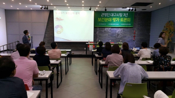 ´ë±¸°æºÏº¸°Çº¹Áö´Üü¿¬´ëȸÀÇ´Â Áö³ 9¿ù18ÀÏ ´ë±¸°øÀÍȰµ¿Áö¿ø¼¾ÅÍ »ó»óȦ¿¡¼ 50¿©¸íÀÌ Âü¼®ÇÑ °¡¿îµ¥ ¡®±Ç¿µÁø ½ÃÀå 3³â º¸°ÇºÐ¾ß Æò°¡ Åä·Ðȸ¡¯¸¦ °¡Á³´Ù. ¹ßÁ¦¸¦ ¸ÃÀº ±è°Ç¿± °æºÏ´ë Àǰú´ëÇÐ ¿¹¹æÀÇÇб³½Ç ±³¼ö´Â ¡®½Ã¹ÎÀÇ °Ç° in ¸Þµð½ÃƼ ´ë±¸¡¯¸¦ ÁÖÁ¦·Î ±Ç¿µÁø ´ë±¸½ÃÀå º¸°ÇºÐ¾ß 4´ë °ø¾à ¹× °ø¾àÀÌÇà, ´ë±¸½Ã º¸°ÇÀÇ·á°èȹ(2015~2018), ¹Î¼± 6±â ¾÷¹«º¸°í, ´ë±¸º¹Áö±âÁؼ±ÀÇ °Ç°±âÁØ µîÀ» Á¾ÇÕÇÏ¿© ±Ç¿µÁø ½ÃÀåÀÇ 3³âÀÇ º¸°ÇÁ¤Ã¥À» Æò°¡Çß´Ù. ±è±³¼ö´Â ¡°2017³â ´ë±¸½Ã ÁßÁ¡»ç¾÷ 8´ë ºÐ¾ß 50°³ »ç¾÷ Áß ½Ã¹Î°Ç°¿¡ ´ëÇÑ »ç¾÷ÀÌ ¾ø¾î Á¤Ã¥ÀÇÁö°¡ ³·À¸¸ç, ´ë±¸½Ã º¸°Ç°Ç°°ú ´ÜÀϰú¿¡¼ 250¸¸ ´ë±¸½Ã¹ÎÀÇ °Ç°À» Ã¥ÀÓÁú ¼ö ÀÖ´ÂÁö ¹Ý¹®¡±ÇÏ¸é¼ ¡°¼¿ï, ºÎ»ê, ÀÎõ µî ´Ù¸¥ ±¤¿ª´Üü´Â ¡®±¹¡¯À̳ª ¡®2°³ °ú¡¯¸¦ ¿î¿µÇϰí ÀÖ´Ù¡±°í ÁöÀûÇß´Ù. ¶ÇÇÑ ¡°°ø°øÀÇ·á±â°ü °£ÀÇ ¿ªÇÒÀÌ ºÎÁ·Çϸç, ½Ã¿¡¼ À§Å¹ ÁØ º¸°ÇÀÇ·á °ü·Ã Áö¿ø´Ü°ú ¼¾Å͵éÀÇ ºÐÀýÀû ¿î¿µ ¼öÁØÀ¸·Î´Â Á¦´ë·Î µÈ º¸°ÇÀÇ·áÁ¤Ã¥ÀÇ ¼ö¸³°ú ½Ã¹ÎÀÇ °Ç°¼öÁØ Çâ»ó, ¾çÁúÀÇ ÀǷἺñ½º Á¦°ø¿¡ ÇѰ谡 ÀÖ´Ù¡±°í ¸»Çß´Ù. ÀÌ °°Àº °ø°øÀÇ·á ¼öÁذú ¸Â¹°·Á ÀÇ·á»ê¾÷(°ü±¤)°ú ¿¬°èµÇÁö ¸øÇÏ°í ºÒÆíÇÑ µ¿°Å°¡ À̾îÁö°í ÀÖ´Â °Íµµ ¹®Á¦¶ó °Á¶Çß´Ù.