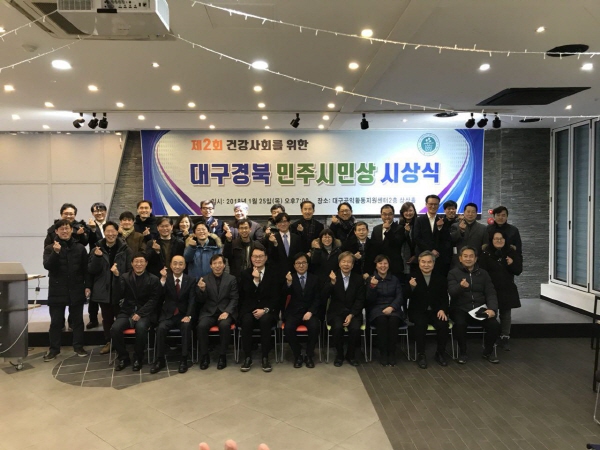 Áö³ 1¿ù 25ÀÏ ±Ý¿äÀÏ ´ë±¸½Ã¹Î°øÀÍȰµ¿Áö¿ø¼¾ÅÍ 2Ãþ¿¡¼ 60¿©¸íÀÌ Âü¿©ÇÑ ½Ã»ó½ÄÀº ½Ã¹Î»ó ÇÁ·ÎÁ§Æ® ÇÕâ´ÜÀÇ ÃàÇϰø¿¬À¸·Î ½ÃÀÛÇÏ¿© °ÇÄ¡ ±è¸í¼· »óÀÓ´ëÇ¥ÀÇ Àλ縻, Ãà»ç, °æ°úº¸°í, Ãßõ°ú ¼±Á¤ÀÇ º¯À¸·Î À̾îÁ³´Ù. ±è¸í¼· ´ëÇ¥´Â ¡°¿À´Ã ÀÌ ÀÚ¸®¿¡´Â º¹Áö¿¬ÇÕ È¸¿ø »Ó ¾Æ´Ï¶ó º¹Áö¿¬ÇÕÀ» ¿À·§µ¿¾È ÁöÄѺðí ÇÔ²² ÇØ ¿Â ºÐµéÀÌ Âü¿©ÇØ ÀÚ¸®¸¦ ´õ¿í ºû³»Áּż °¨»çµå¸°´Ù¡±°í ¸»Çß´Ù. À̾î È«¼ö¿¬ °ÇÄ¡ Áß¾Ó °øµ¿´ëÇ¥´Â Ãà»ç¿¡¼ ¡°Ãâ¹ß¼±À» °øÆòÇÏ°Ô ½ÃÀÛÇÒ ¼ö ÀÖµµ·Ï ÀÀ¿øÇÏ´Â ÈûÀº ÃÖ¼ÒÇÑÀÇ »çȸ¾ÈÀü¸ÁÀÇ °È¿Í º¹ÁöÀÇ ¼öÁØ¿¡¼ ³ª¿Ã ¼ö Àֱ⿡ Áö¿ª¿¡¼ °¡Àå Ȱ¹ßÇÑ º¹ÁöºÎ¹®¿îµ¿À» ¹ú¿©¿Â ¿ì¸®º¹Áö½Ã¹Î¿¬ÇÕÀÇ ¼ö»óÀ» ÃàÇÏÇÑ´Ù¡®°í ÀÀ¿øÇßÀ¸¸ç, ÃÖ¹®Ã¶ ´ë±¸±¤¿ª½Ã Ä¡°úÀÇ»çȸ ȸÀåµµ ¡±´ë±¸Áö¿ª¿¡ ÀÖ´Â ÀϺΠ¼ÒÁßÇÑ Ä¡°úÀÇ»çµéÀÌ ´ë±¸ÀÇ º¯È¿Í °³ÇõÀ» À§ÇÑ ¾¾¾ÑÀ» »Ñ¸®°í ÀÖ´Ù¸ç ´ë±¸½Ã¹Î¿îµ¿¿¡ µµ¿òÀÌ µÇ°í ´ë±¸ ¹ßÀü¿¡µµ ±â¿©ÇÏ´Â ¶æ ±íÀº »ó¡°À̶ó¸é¼ ¿ì¸®º¹Áö½Ã¹Î¿¬ÇÕÀÇ ¼ö»óÀ» ÃàÇÏÇß´Ù. õ´ë¼º ÃßõÀ§¿øÀå(´ë±¸°æºÏ¾ð·Ð³ëÁ¶ÇùÀÇȸ ´ëÇ¥)°ú ÀÌÁ¤¿ì ¼±Á¤À§¿øÀå(°æºÏ´ë ¸í¿¹±³¼ö)Àº ¡°Á¤ºÎ Áö¿ø ¾øÀÌ ¿î¿µÇÏ´Â ¿ì¸®º¹Áö½Ã¹Î¿¬ÇÕÀº ´ë±¸¸¦ ´õ Åõ¸íÇÏ°í °Ç°ÇÏ°Ô ¸¸µå´Â µ¥ ±â¿©ÇßÀ¸¸ç, º¹Áö¿¬ÇÕÀ» ¹ÎÁֽùλó ¼ö»óÀÚ·Î ÃßõÇÏ°í ¼±Á¤À§¿øÈ¸¿¡¼ ¸¸ÀåÀÏÄ¡·Î ¼±Á¤Çß´Ù¡±¸ç ¼±Á¤ ÀÌÀ¯¸¦ ¹àÇû´Ù.
