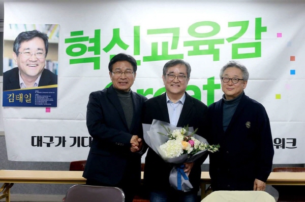 ¡ã¿ÞÂÊ Á¤¸¸Áø Àü ±³À°À§¿ø, Áß°£ ±èÅÂÀÏ ¿µ³²´ëÇб³ ±³¼ö, ¿À¸¥ÂÊ ³ëÁøÃ¶ Çõ½Å±³À°°¨³Ý »óÀÓ´ëÇ¥ Çõ½Å±³À°°¨´ë±¸³×Æ®¿öÅ©, ¡®´ë±¸ Çõ½Å±³À°°¨ Èĺ¸¡¯ ±èÅÂÀÏ ±³¼ö È®Á¤