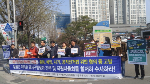º¹Áö¿¬ÇÕ µî 23°³ ´Üü, ÀÌÅÂÈÆ ´Þ¼±¸Ã»Àå µî 7¸í °ËÂû °í¹ß 23°³ ´Üü·Î ±¸¼ºµÈ ¡¸´Þ¼±¸Ã» 1% ³ª´® ¿îµ¿ ±â±ÝÀ¯¿ë ´ëÃ¥À§¿øÈ¸¡¹(ÀÌÇÏ ´ëÃ¥À§)´Â 3¿ù26ÀÏ 1% ³ª´®¿îµ¿ ±â±Ý°ú Á÷¿øÀÚÀ²È¸ ±â±ÝÀ» À¯¿ëÇÑ °Í°ú °ü·ÃÇÏ¿© ÀÌÅÂÈÆ ´Þ¼±¸Ã»Àå µî 7¸íÀ» ´ë±¸Áö°Ë¿¡ °í¹ßÇß´Ù. ´ëÃ¥À§´Â ÀÌÅÂÈÆ ´Þ¼±¸Ã»Àå°ú ºÎ±¸Ã»Àå, ±¹ÀåÀÌ Á¦261ȸ ´Þ¼±¸ÀÇȸ 2Â÷ º»È¸ÀÇ ±¸Á¤ÁúÀÇ ´äº¯(2019.3.22.)¿¡¼ ¸¸¾à °ÅÁþÀ̸é Ã¥ÀÓÁö°Ú´Ù°í Á÷, °£Á¢ÀûÀ¸·Î ¹àÈù ¸¸Å ¹Ýµå½Ã Áø½ÇÀ» ±Ô¸íÇÒ Ã¥¹«°¡ »ý°å°í, ´Þ¼°æÂû¼°¡ ¹Î¿øÇذá°úÁ¤¿¡ °³ÀÔÇß´Ù´Â ´Þ¼±¸Ã» °£ºÎÀÇ ±¸Á¤ÁúÀÇ ´äº¯ÀÌ ³ª¿Â ¸¸Å ¼ö»çÀÇÁö°¡ ¾ø°í ºÒ½ÅÀ» ¹Þ°í ÀÖ´Â ´Þ¼°æÂû¼ÀÇ ³»»ç¸¦ ¹Ï±â ¾î·Æ±â¿¡ °ËÂû¿¡ Á÷Á¢ °í¹ßÇÏ°Ô µÇ¾ú´Ù°í ¹àÇû´Ù. ´Þ¼±¸Ã»Àå µî °£ºÎµéÀº Á¦260ȸ ´Þ¼±¸ÀÇȸ ÀÓ½Ãȸ 2Â÷ º»È¸ÀÇ(2019.2.20.)¿Í Á¦261ȸ 2Â÷ º»È¸ÀÇ(2019.3.22.)¿¡ Ãâ¼®ÇÏ¿© ´Þ¼±¸ÀÇ¿øµéÀÇ ±¸Á¤ÁúÀÇ¿¡ ´ëÇØ °ÅÁþ¸»°ú ¸ð¸£¼è·Î ÀϰüÇÏ¸ç ¿ÀÈ÷·Á ¡°»ó»ó·ÂÀ¸·Î ÁúÀÇÇϰí ÀÖ°í, Á÷¿øÀÚÀ²È¸¿¡¼ ÀÚÀ²ÀûÀ¸·Î °áÁ¤ÇßÀ¸¸ç, ¾ð·ÐÀÇ ¿Àº¸¿Í ¼¹«µéÀÇ ¼ÒÅëºÎÁ· Å¿¡±À̶ó°í ¸»Çß´Ù. ÀÌ¾Ö ´ëÇØ ´ëÃ¥À§´Â ¡°2019³â 1¿ù22ÀÏ Ã³À½ ÀÌ »ç°ÇÀÌ °ø°³µÈ ÀÌÈÄ ÀÌÅÂÈÆ ±¸Ã»Àå µîÀº ¹Ý¼º°ú »ç°ú´ÂÄ¿³ç Á¦±âµÈ °¢Á¾ ÀÇȤµéÀ» ¸¶Ä¡ »ó»ó·Â¿¡ ÀÇÇØ Á¶ÀÛµÈ °ÍÀ̰í À̸¦ º¸µµÇÑ ¾ð·ÐÀº ¿Àº¸¸¦ ÇÑ °ÍÀ̶ó°í ÁÖÀåÇϰí ÀÖ´Ù¡±¸é¼ ¡°»ó»ó·ÂÀ¸·Î ²÷ÀÓ¾øÀÌ °ÅÁþ¸»°ú Áõ°Å¸¦ Á¶ÀÛÇÏ´Â À̵éÀº ¹Ù·Î ´Þ¼±¸Ã»À¸·Î ¡®´ë±¸ÆÇ ¿öÅͰÔÀÌÆ® »ç°Ç¡¯À¸·Î È®»ê½ÃŰ´Â À庻ÀΡ±À̶ó°í ÁúŸÇß´Ù. °ËÂû °í¹ß¿¡ ¾Õ¼ ´ëÃ¥À§´Â °ËÂûû ¾Õ¿¡¼ ±âÀÚȸ°ßÀ» ¿°í ÀÌ »ç°ÇÀÇ ½ÇüÀû Áø½ÇÀ» ¹àÈ÷±â À§ÇØ °ËÂûÀÇ ½Å¼ÓÇÏ°í ¾öÁ¤ÇÑ ¼ö»ç¸¦ Ã˱¸Çß´Ù. ÀºÀç½Ä ¿ì¸®º¹Áö½Ã¹Î¿¬ÇÕ »ç¹«Ã³ÀåÀº ¡°1¿ù22ÀϺÎÅÍ Áö±Ý±îÁö ÀÌÅÂÈÆ ´Þ¼±¸Ã»Àå°ú ´Þ¼±¸Ã»Àº »ç°ú¿Í ¹Ý¼ºÀºÄ¿³ç ÁöÀ§¸¦ ÀÌ¿ëÇØ 1% ³ª´® ¿îµ¿ ±â±Ý°ú Á÷¿øÀÚÀ²È¸ ±â±Ý À¯¿ëÀ» ¸ðÀÇ, Áö½ÃÇÑ ÀÇȤÀÌ ÀÖ´Ù¡±¸ç ¡°È¾·É, ¹èÀÓ, »ç±â, Á÷±Ç³²¿ë, ¾÷¹«¹æÇØ »Ó ¾Æ´Ï¶ó °øÁ÷¼±°Å¹ý »ó ±âºÎÇàÀ§ ±ÝÁö µîÀÇ ½ÇÁ¤¹ýÀ» À§¹ÝÇÑ ÇøÀÇ·Î °í¹ßÇÏ°Ô µÇ¾ú´Ù¡±°í °í¹ßÃëÁö¸¦ ¼³¸íÇß´Ù.