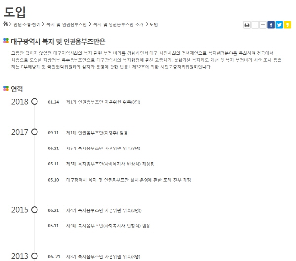 ´ë±¸½Ãû ȨÆäÀÌÁö, ´ë±¸±¤¿ª½Ã º¹Áö ¹× ÀαǿȺÎÁ ¼³¸íÀ» º¸¸é... ÇöÀç ´ë±¸½Ãû ȨÆäÀÌÁö¿¡´Â '±×µ¿¾È ²÷ÀÌÁö ¾Ê¾Ò´ø ´ë±¸Áö¿ª»çȸÀÇ º¹Áö °ü·Ã ºÎÁ¤ ºñ¸®¸¦ °æÇèÇÏ¸é¼ ´ë±¸ ½Ã¹Î»çȸÀÇ Á¤Ã¥Á¦¾ÈÀ¸·Î º¹ÁöÇàÁ¤ºÐ¾ß¸¦ ƯÈÇÏ¿© Àü±¹¿¡¼ óÀ½À¸·Î µµÀÔÇÑ Áö¹æÁ¤ºÎ Ư¼ö¿ÈºÎÁÀ¸·Î ´ë±¸±¤¿ª½ÃÀÇ º¹ÁöÇàÁ¤¿¡ °üÇÑ °íÃæÃ³¸®, ºÒÇÕ¸®ÇÑ º¹ÁöÁ¦µµ °³¼± ¹× º¹Áö ºÎÁ¤ºñ¸® »ç¾È Á¶»ç µîÀ» ÇÏ´Â ⌈ºÎÆÐ¹æÁö ¹× ±¹¹Î±ÇÀÍÀ§¿øÈ¸ÀÇ ¼³Ä¡¿Í ¿î¿µ¿¡ °üÇÑ ¹ý·ü⌋ Á¦32Á¶¿¡ ÀÇÇÑ ½Ã¹Î°íÃæÃ³¸®À§¿øÈ¸ÀÔ´Ï´Ù.'¶ó°í ¼³¸íÇϰí ÀÖ´Ù. ±×·±µ¥, ¿Ö ºñ¸® ¿ËÈ£°üÀ¸·Î Á¶·Õ¹ÞÀ»±î? À̸¦ Á¶±Ý ´õ ¾Ë±â À§Çؼ± Á¦µµµµÀÔÀÇ ÃëÁö¿Í ±×°£ÀÇ °úÁ¤À» Çѹø »ìÆìº¼ Çʿ䰡 ÀÖ´Ù. 2009³â 1±â º¹Áö¿ÈºÎÁÀº Áö¿ªº¹Áö°è¿ÍÀÇ °¥µîÀ» ºú´Ù°¡ ¿¬ÀÓÇÏÁö ¸øÇß´Ù. 1±â º¹Áö¿ÈºÎÁÀº 2010³â ¡®º¹ÁöÇàÁ¤Á¦µµ ¹× ¿î¿µ»ó Á¦µµ°³¼±¿¡ ´ëÇÑ ±Ç°í ¶Ç´Â ÀǰßÇ¥¸í°ú ³»¿ë °øÇ¥¡¯ÀÇ ÀÏȯÀ¸·Î 2°¡Áö¿¡ ´ëÇØ ÀǰßÇ¥¸íÀ» ÁغñÇßÀ¸³ª ù ¹øÂ° ¹ßÇ¥ÇÑ ¡®»çȸº¹Áö¹ýÀÎ °á»êº¸°í ¹®Á¦ Á¦µµ°³¼± ÀÇ°ß Ç¥¸í¡¯ ÀÌ º¹Áö°è¿Í °¥µîÀ» ºúÀ¸¸é¼ Á¤ÀÛ Áß¿äÇÑ ³ª¸ÓÁö Çϳª´Â ¾Æ¿¹ °ø°³µÇÁö ¸øÇß´Ù. ¹Ì°ø°³µÈ Çϳª´Â Á¤ºÎÇÕµ¿°¨»ç¿¡ µû¸¥ ´ë±¸½ÃÀÇ º¹ÁöÀç´Ü Á¶Ä¡ ºÒÀÌÇàÀ̾ú´Ù. º¹Áöºñ¸®¸¦ ¿¹¹æÇϰí ÇØ°áÇϰڴٴ ÀÇÁö¸¦ ¹àÈù 1±â º¹Áö¿ÈºÎÁÀº 2010³â 2¿ù '»çȸº¹Áö¹ýÀÎ À繫ȸ°è±ÔÄ¢ °á»êº¸°í µî ÇàÁ¤°³¼±' ¹ßÇ¥¿¡ Áö¿ª »çȸº¹Áö°è°¡ ¹Ý¹ßÇÏÀÚ ´ë±¸½Ã°¡ ¿ÈºÎÁ½ÇÀÇ ¾÷¹«¹Ì¼÷ ¶§¹®À̶ó°í ¹ßÇ¥Çß°í, ÀÌ¿¡ Àü±¹°ø¹«¿ø³ëÁ¶ ´ë°æº»ºÎ°¡ ¹ß²öÇÏ°í ³ª¼ Áö¿ª À̽´°¡ µÇ¾ú´Ù. º¹Áö°è´Â »çȸº¹Áö¹ýÀÎÀ» ºÒ¹ý Áý´ÜÀ¸·Î ¸ÅµµÇÑ °ÍÀ» Àý´ë ¿ë³³ÇÒ ¼ö ¾ø´Ù¸ç º¹Áö¿ÈºÎÁÀÌ ÅðÁøÇÒ ¶§±îÁö Áý ¾Õ¿¡¼ÀÇ Ç×ÀǽÃÀ§µµ ºÒ»çÇÏ°Ú´Ù°í ¹Ý¹ßÇß´Ù. À̵éÀº ´ë±Ô¸ð Áýȸ¸¦ ½Ãû ¾Õ¿¡¼ °¡Áøµ¥ ÀÌ¾î º¹Áö¿ÈºÎÁ »ç¹«½Ç ¾Õ¿¡¼µµ 1ÀÎ ½ÃÀ§¸¦ Çѵ¿¾È À̾´Ù. ±×·¯³ª º¹Áö¿ÈºÎÁÀÌ ÁغñÇÑ ¶Ç ÇϳªÀÇ ÀǰßÇ¥¸í ³»¿ëÀº ÀÌ »ç°ÇÀ¸·Î ¿ÏÀüÈ÷ ¹¯È÷°Ô µÇ¾ú°í, ´ç½Ã¿¡ ÈÄ¼Ó ÀǰßÇ¥¸íÀÇ ³»¿ëÀ» ¾Æ´Â ÀÌ´Â ´ë±¸½Ã »ÓÀ̾ú´Ù. ´ç½Ã ½Ã¹Î»çȸ¿¡¼´Â º¹Áö¿ÈºÎÁÀÌ ¹ßÇ¥ÇϰíÀÚ Çß´ø 2°¡Áö Áß ¹Ì¹ßÇ¥µÈ ³»¿ëÀ» ±âµæ±Ç º¹Áö°è¿¡¼ ¾Ë°í À̸¦ »çÀü¿¡ ¸·±â À§ÇØ ´ë±Ô¸ð Áýȸ¸¦ ±âȹÇϰí ÅðÁø¾Ð¹ÚÀ» Çß´Ù´Â Àǰߵµ Á¦½ÃµÇ¾ú´Ù. ´ë±¸½Ã¿Í ±âµæ±Ç º¹Áö°è°¡ µÎ ¹øÂ° ÀǰßÇ¥¸íÀ» ¸øÇϵµ·Ï »çÀü¿¡ ¸·¾Ò´Ù´Â ÈĹ®ÀÌ´Ù. À̾î 2±â º¹Áö¿ÈºÎÁÀº ¿î Á¾°Ô Â÷¼øÀ§°¡ µÇ¾ú´Ù. ´ë±¸½Ã´Â ¸éÁ¢±îÁö °ÅÃÄ 2±â º¹Áö¿ÈºÎÁÀ» ÀÓ¸íÇϱâ Á÷Àü¿¡ ½Ã¹Î´ÜüÀÇ Á¦º¸·Î Ⱦ·É µî º¹Áöºñ¸®¿¡ ¿¬·çµÇ¾ú´Ù´Â »ç½ÇÀ» µÚ´Ê°Ô È®ÀÎÇÏ°í ³»Á¤À» ±Þ Ãë¼ÒÇß´Ù. ±×¸®°í ¾î¿ ¼ö ¾øÀÌ Â÷¼øÀ§¸¦ ÀÓ¸íÇß´Ù. ´ë±¸½Ã¿Í º¹Áö°è°¡ ÀüÇô ¿¹»óÇÏÁö ¸øÇÑ °á°ú°¡ ³ª¿ÔÁö¸¸, 2±â º¹Áö¿ÈºÎÁÀº Á¸Àç °¡Ä¡´Â ¾ø¾úÁö¸¸ ¿¬ÀÓ±îÁö ÇÏ°Ô µÇ¾ú´Ù. ±×¸®°í 4±â ¿ÈºÎÁÀÌ µé¾î¿Í ºñ½ÁÇÑ ¾ç»óÀÌ À̾îÁö¸é¼ ¿¬ÀÓÇß°í ¿ÃÇØ »õ·Î¿î 6±â º¹Áö¿ÈºÎÁ ä¿ë ÀýÂ÷°¡ ÁøÇà Áß¿¡ ÀÖ´Ù. ±×µ¿¾È º¹Áö¿ÈºÎÁÀº »çȸº¹Áö ºñ¸®¿¡ ´ëÇÑ ¿¹¹æÀ̳ª ÁßÀç, Á¦µµ°³¼± Ȱµ¿Àº °ÅÀÇ º¸ÀÌÁö ¾Ê°í, ½Ã¹Î»çȸ·ÎºÎÅÍ Ã¶ÀúÈ÷ ¿Ü¸é ¹Þ¾Æ ¿Ô´Ù. ¿ÀÈ÷·Á º¹Áö¿ÈºÎÁÀÌ Å»ý»ó °¥µîÇØ¼Ò¸¦ À§ÇÑ È°µ¿¸¦ ¿Ü¸éÇß´Ù°í º¸´Â °ÍÀÌ ´õ ¿ÇÀº ÁöÀûÀÏ ¼ö ÀÖÀ» Á¤µµ´Ù. º¹ÁöÀç´Ü ºñ¸®´Â °è¼Ó ÅÍÁ®µµ... º¹Áö¿ÈºÎÁÀº ½ÇÁ¾ ÀÌ·± °úÁ¤¿¡¼ Áö¿ª¿¡¼µµ Å©°í ÀÛÀº »çȸº¹ÁöÀç´Ü ¹× ½Ã¼³ºñ¸®°¡ ¹ß»ýÇß´Ù. ±Ç¿µÁø ½ÃÀåÀÌ ÃëÀÓÇÑ 2014³âµµ¸¦ ±âÁ¡À¸·Î º¸´õ¶óµµ ´ë±¸½Ã¸³Èñ¸Á¿ø »ç°ÇÀ» ºñ·ÔÇØ ´ëÇü º¹ÁöÀç´Ü ºñ¸®°¡ °è¼Ó ¹ß»ýÇßÁö¸¸ º¹Áö¿ÈºÎÁÀÇ ¿ªÇÒÀº ¹ÌºñÇϱ⠱×Áö¾ø¾ú´Ù. ¿ÀÈ÷·Á Á¸Àç°¡Ä¡°¡ ¾ø¾ú´Ù°í ÇØµµ °ú¾ðÀÌ ¾Æ´Ï¸ç, º¹Áö°èÀÇ Á¤º¸Ã¢±¸ ¿ªÇÒÀ» Çϰí ÀÖ´Ù´Â ºñ³µµ ½ñ¾ÆÁ³´Ù. ºñ·Ï ´ë±¸½Ã¸³Èñ¸Á¿ø »çÅ·Π´ë±¸½Ã°¡ 2017³â ÀαǿȺÎÁÀ» ÀÚÁ¦ÀûÀ¸·Î ¼³Ä¡ÇßÁö¸¸ ÁÖ·Î Èñ¸Á¿ø¿¡ ±¹ÇÑµÈ È°µ¿À̾ú°í, º¹Áö¿ÈºÎÁÀº ¿©ÀüÈ÷ ±× ¿ªÇÒÀ» ±â´ëÇÒ ¼ö ¾ø¾ú´Ù. ¿ì¸®º¹Áö½Ã¹Î¿¬ÇÕ µîÀº ¡°´ë±¸½Ã°¡ Àü±¹¿¡¼ óÀ½À¸·Î º¹Áö¿ÈºÎÁÀ» ¸¸µé¾ú´Ù°í È«º¸ÇßÁö¸¸, ´çÃÊ ±â´ëÇß´ø ¼º°ú¸¦ ¸¸µéÁö ¸øÇÏ°í ½ÇÆÐÇß´Ù. º¹ÁöÀç´Ü ºñ¸®¸¦ ¸·Áöµµ ¸øÇß°í, 