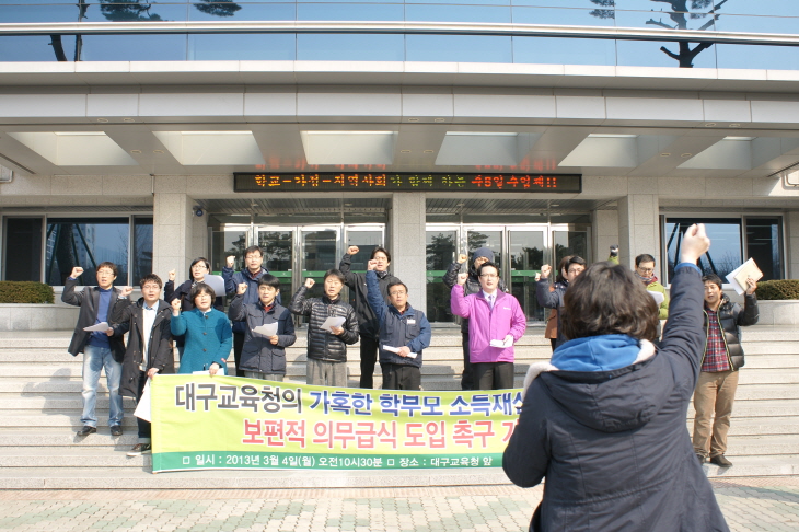 ¡ã ģȯ°æÀǹ«±Þ½Ä Ã˱¸ Çкθð 3º¸ 1¹è(2012. 7.) ÃÖ¾ÇÀÇ ¹æ¹ýÀ¸·Î Çб³±Þ½Ä È®´ë, µ· ¾ø´Ù´ø ´ë±¸½Ã±³À°Ã»ÀÇ ¼ø¼¼°èÀ׿©±ÝÀº 1,230¾ï ´ë±¸±³À°Ã»Àº 2012³â Àú¼Òµæ ¹«»ó±Þ½Ä Áö¿ø°èȹÀÎ 36%¿¡ ¹ÌÄ¡Áö ¸øÇÏÀÚ(Çлý´ëºñ 28%¼öÁØ) ÃÖÀú»ý°èºñ 200%ÀÌÇÏ ±âÁصµ ¹«½ÃÇÑ Ã¤ Çб³Àå ÀÚÀÇÀû ÆÇ´ÜÀ¸·Î ´ë»óÀÚ¸¦ È®º¸Çϵµ·Ï Çß°í, 10¿ùºÎÅÍ´Â 200¸í ÀÌÇÏ Çб³¿¡¼ 400¸í ÀÌÇÏÀÇ Çб³´Â ¼Òµæ¼öÁذú °ü°è¾øÀÌ ¹«»ó±Þ½ÄÀ» ½ÃÇàÇß´Ù. ¹«»ó±Þ½Ä°ú ¼±º°±Þ½ÄÀÌ È¥ÀçÇÏ´Â ºÒÆòµî ±Þ½Ä ³í¶õÀ» ¾ß±âÇß´Ù. 400¸íÀ̶ó´Â ±âÁصµ ¾Ö¸Å¸ðÈ£ÇÏÁö¸¸, Çлý ¼ö ±âÁØÀ¸·Î È®´ëÇÏ´Â °÷Àº ´ë±¸°¡ °ÅÀÇ À¯ÀÏÇß´Ù. 2013³â ÃÊ¡¤ÁßÇлýÀº ¿ù ¼ÒµæÀÎÁõ¾×(4ÀÎ °¡Á· ±âÁØ)À» ÃÖÀú»ý°èºñÀÇ 340%ÀÎ 526¸¸ ¿ø, °íµîÇб³´Â 260%ÀÎ 403¸¸ ¿ø±îÁö Áö¿ø½ÅûÀ» ¹Þ¾Ò´Ù(¿ï»ê 200%). ÇкθðµéÀÇ °¡È¤ÇÑ ¼ÒµæÀç»êÁ¶»ç´Â ¹Ý´ë¿¡µµ ºÒ±¸ÇÏ°í °ÇàµÇ¾ú´Ù. ±× °á°ú, 2013³â 12¿ù Àüü Çлý´ëºñ 45.2%°¡ ¹«»ó±Þ½ÄÀ» ¹Þ¾Ò´Ù(ÃʵîÇлý 51.8%, ÁßÇлý 44.5%, °íµîÇлý 36.8%). Àú¼ÒµæÃþ ¹«»ó±Þ½ÄÀÌ ¾Æ´Ï¶ó Áß»óÃþ ¹«»ó±Þ½ÄÀ̶ó´Â ½ÅÁ¶¾îµµ ź»ýÇß´Ù. 5³âÀÌ Áö³ª 2018³â ´ë±¸ ÃÊ¡¤Áß¡¤°íÀÇ ¹«»ó±Þ½Ä ºñÀ²Àº ¿©ÀüÈ÷ Àü±¹ ÃÖÇÏÀÎÀÎ 69.2%À̾ú´Ù(Àü±¹Æò±Õ 82.5%). ÇÑÆí, ´ë±¸½Ã±³À°Ã»Àº µ·ÀÌ ¾ø¾î Àǹ«±Þ½ÄÀ» ÇÒ ¼ö ¾ø´Ù°í ÇßÁö¸¸, 2011³â ¼ø¼¼°èÀ׿©±ÝÀÌ ÃʵîÇб³ Àü¸é Àǹ«±Þ½ÄÀ» ÇØµµ ³²À» 1,230¾ï ¿øÀ̾ú´Ù. 17³â Ãʵî 4~6Çгâ, 18³â Ãʵî 1~3Çг⠽ǽÃ, 2019³â ÁßÇб³ Àü¸é ¹«»ó±Þ½Ä¿îµ¿À¸·Î... Ãʵî Àü¸é ¹«»ó±Þ½ÄÀº ±Ç¿µÁø ´ë±¸½ÃÀå°ú ¿ìµ¿±â ±³À°°¨ÀÇ 2014³â Áö¹æ¼±°Å °øÅë °ø¾àÀ̾úÀ¸³ª ÀçÁ¤ºÐ´ã ¹®Á¦·Î 2³â °£ ÇÎÆþ°ÔÀÓÀ» ÆîÃÆ´Ù. »çȸÀû ¾Ð¹ÚÀÌ ³¯·Î °ÇØÁöÀÚ, µåµð¾î 2016³â 10¿ù 17ÀÏ ±Ç¿µÁø ½ÃÀå°ú ¿ìµ¿±â ±³À°°¨Àº 2018³â±îÁö Ãʵî Àü¸é ¹«»ó±Þ½Ä ½Ç½Ã¸¦ ÇÕÀÇÇß