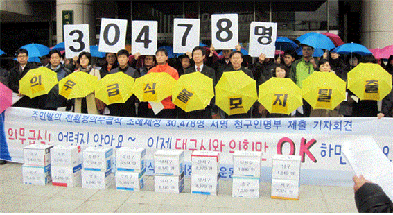 ¡ã 30,478¸í ´ë±¸½Ã¹Î ¼¸í Á¢¼ö.(2011. 12.) ¼±°Å¿¡¼ º¹Áö°¡ óÀ½À¸·Î Àü±¹ÀûÀ¸·Î À̽´ÈµÈ °ÍÀº 2010³â Áö¹æ¼±°Å¿¡¼ ¹«»ó±Þ½ÄÀ̾ú´Ù. °æ±âµµ±³À°Ã»¿¡¼ ½ÃÀÛÇÑ ÃÊµî ¹«»ó±Þ½ÄÀº ÀÌÁ¦ º¸ÆíÈµÇ¾î °íµîÇб³±îÁö È®´ëµÇ¾ú´Ù. 2011³â ±âÁØ ´ë±¸Áö¿ª ¹«»ó±Þ½Ä ºñÀ²Àº Çлý´ëºñ 16%, Çб³´ëºñ 1~2%¿¡ ºÒ°úÇØ Àü±¹ ÃÖÇÏÀ§¿´´Ù. ´ë±¸´Â 2017³â¿¡ µé¾î¼ ÃÊµî ¹«»ó±Þ½ÄÀ» ½Ç½ÃÇß°í 2018³â¿¡ Ãʵî Àü¸é ¹«»ó±Þ½ÄÀ» µµÀÔÇßÁö¸¸ 69.2%·Î Àü±¹ Æò±Õ 82.5%¿¡ ÇÑÂü ¹Ì´ÞÇÑ Àü±¹ ²ÃÂî¿´´Ù(2018³â 3¿ù ±âÁØ). 2019³â¿¡µµ ¿©·Ð¿¡ ¹Ð·Á ÁßÇб³ Àü¸é ¹«»ó±Þ½ÄÀ» ÇßÁö¸¸ ±×·¡µµ Àü±¹ ²ÃÂî¶ó´Â ¿À¸íÀ» ¹þÁö ¸øÇß´Ù. ´ë±¸½Ã¿Í ´ë±¸½Ã±³À°Ã»Àº ¸Å³â ¿¹»êŸ·ÉÇÏ¸ç ¹«»ó±Þ½Ä È®´ë¿¡ ¹Ý´ëÇß´Ù. 2019³â 10¿ù31ÀÏ ´ë±¸½Ã¿Í ´ë±¸½Ã±³À°Ã», ´ë±¸½ÃÀÇȸ µîÀº °í±³ ´Ü°èº° ¹«»ó±Þ½ÄÀ» Àü°Ý ¼±¾ðÇÏ°í ³»³â °í3ºÎÅÍ ½ÃÀÛÇØ 2022³â °í±³ Àü¸é ¹«»ó±Þ½ÄÀ» ½Ç½ÃÇϱâ·Î ÇÕÀÇÇß´Ù. ´ë±¸ ù ÁֹιßÀÇÁ¶·ÊÀÎ Àǹ«(¹«»ó)±Þ½Ä Á¶·ÊÁ¦Á¤¿îµ¿ÀÇ ÁÂÀý ¿ì¸®º¹Áö½Ã¹Î¿¬ÇÕ, Àü±³Á¶´ë±¸ÁöºÎ, ¹ÎÁÖ³ëÃѴ뱸Áö¿ªº»ºÎ µî ´ë±¸Áö¿ª ½Ã¹Î»çȸ´ÜüµéÀº 2011³â 8¿ù19ÀÏ ¡®Ä£È¯°æ Àǹ«±Þ½ÄÁ¶·ÊÁ¦Á¤ ¿îµ¿º»ºÎ¡¯¸¦ °á¼ºÇϰí 9¿ù 7ÀϺÎÅÍ ¼¸í ¹Þ¾Æ 12¿ù1ÀÏ 32,169¸íÀÇ ¼¸íÀθíºÎ¸¦ ´ë±¸½Ã¿¡ Á¦ÃâÇß´Ù. Á¶·Ê¹ßÀÇ´Â ÁýÇàºÎ(´ë±¸½Ã¿Í ±³À°Ã»)¿Í ´ë±¸½ÃÀÇȸ »Ó ¾Æ´Ï¶ó Áö¿ªÁֹεéÀÌ Á÷Á¢ ÇÒ ¼ö ÀÖÁö¸¸ ¸Å¿ì ±î´Ù·Ó´Ù. Á÷Á¢¹ÎÁÖÁÖÀÇÀÇ ÇϳªÀÎ ÁÖ¹ÎÀÌ Á¶·Ê¸¦ Á÷Á¢ ¹ßÀÇÇÏ´Â ÁֹιßÀÇÁ¶·Ê´Â Áö¹æÀÚÄ¡¹ý¿¡ ÀÇÇØ 19¼¼ ÀÌ»ó ÁֹΠÃѼöÀÇ 90ºÐÀÇ 1 ÀÌ»ó ¼¸íÀ¸·Î ¹ßÀÇÇÒ ¼ö ÀÖ´Ù. Áֹεî·Ï¹øÈ£¿Í ÁÖ¼ÒÁö±îÁö Á¤È®ÇØ¾ß Çϴµ¥, ¹ýÁ¤ ¼¸íÀÎ ¼ö´Â ´ç½Ã 21,768¸íÀ̾ú´Ù. ´ë±¸Áö¿ª ½Ã¹Î»çȸ´ÜüµéÀº Á¶Á÷ÀûÀÎ ¼¸í¿îµ¿ »Ó ¾Æ´Ï¶ó 1ÁÖÀÏ¿¡ ¿©·¯ Â÷·Ê ´ë±¸¹éÈÁ¡ µî¿¡¼ ¼¸íÀ» ¹Þ¾Ò°í, ¼¸í¿ëÁö¸¦ µ¿º°·Î ºÐ·ùÇϴµ¥ ¸çÄ¥°£ ²¿¹Ú ¹ãÀ» »õ¿ü´Ù.