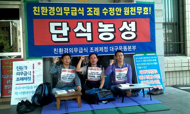 ¡ã ´ë±¸½ÃÀÇȸ ¾Õ ´Ü½Ä³ó¼º (2012.9.) ÀºÀç½Ä _ º¹Áö¿¬ÇÕ »ç¹«Ã³Àå º¹ÁöÆ÷ǽ¸®Áò ³íÀï¿¡ ÀÚÃÊµÈ ´ë±¸ ¹«»ó±Þ½Ä º¹Áö°¡ óÀ½À¸·Î ¼±°Å¿¡¼ À̽´ÈµÈ 2010³â Áö¹æ¼±°Å´Â ¹«»ó±Þ½ÄÀÌ ÃÖ´ë ȵο´´Ù. 2008³â °æ±âµµ±³À°Ã»¿¡¼ ½ÃÀÛÇÑ ¹«»ó±Þ½Ä ¿Ç³Àº ÀÌÁ¦ º¸ÆíÈµÇ¾î °íµîÇб³±îÁö È®´ëµÇ¾ú°í, ³»³âºÎÅÍ °í±³ ¹«»ó±³À°±îÁö ½ÃÇàµÈ´Ù. ±×·¯³ª ´ë±¸ÀÇ ¹«»ó±Þ½ÄÀº º¹ÁöÆ÷ǽ¸®Áò ³í¶õÀÌ °¡¿µÇ¾î Àü±¹ ²ÃÂî¶ó´Â ¿À¸íÀ» Áö±Ý±îÁö ¹þÁö ¸øÇϰí ÀÖ´Ù. 2011³â ´ë±¸ÀÇ ¹«»ó±Þ½Ä ºñÀ²Àº Çлý´ëºñ 16%(Àú¼ÒµæÃþ ¼±º°±Þ½Ä), Çб³´ëºñ 1~2%¿¡ ºÒ°úÇØ Àü±¹ ÃÖÇÏÀ§·Î ¹«»ó±Þ½ÄÀÇ ºÒ¸ðÁö¿´À½À» º¸¿©ÁØ´Ù. ´ë±¸ ù ÁֹιßÀÇÁ¶·ÊÀÎ Àǹ«(¹«»ó)±Þ½Ä Á¶·ÊÁ¦Á¤¿îµ¿ ÁÂÀý ¿ì¸®º¹Áö½Ã¹Î¿¬ÇÕ, Àü±³Á¶´ë±¸ÁöºÎ, ¹ÎÁÖ³ëÃѴ뱸Áö¿ªº»ºÎ µî ´ë±¸Áö¿ª ½Ã¹Î»çȸ´ÜüµéÀº 2011³â 8¿ù19ÀÏ ¡®Ä£È¯°æ Àǹ«±Þ½ÄÁ¶·ÊÁ¦Á¤ ¿îµ¿º»ºÎ¡¯¸¦ °á¼ºÇϰí ģȯ°æÀǹ«±Þ½ÄÁ¶·Ê Á¦Á¤À» À§ÇØ 9¿ù7ÀϺÎÅÍ 12¿ù1ÀϱîÁö ¹ÞÀº 32,169¸íÀÇ ¼¸íÀθíºÎ¸¦ ´ë±¸½Ã¿¡ Á¦ÃâÇß´Ù. ´ë±¸ ù ÁֹιßÀÇÁ¶·Ê´Ù. ±î´Ù·Î¿î Á¶°Ç(19¼¼ ÀÌ»ó ÁֹΠÃѼöÀÇ 90ºÐÀÇ 1 ÀÌ»ó) ¶§¹®¿¡ ÀÌÈÄ »óÁ¤µÈ ÁֹιßÀÇÁ¶·Ê´Â ¾ø´Ù. ´ë±¸¿¡ °ÅÁÖÇϸç Áֹεî·Ï¹øÈ£¿Í ÁÖ¼ÒÁö°¡ Á¤È®ÇÏ°Ô ±âÀçµÈ ¹ýÁ¤ ¼¸íÀÎ ¼ö´Â ´ç½Ã 21,768¸íÀ̾ú´Ù. Àüü ¼¸íÀÎ ¼öÀÇ 78%¿¡ ÇØ´çµÇ´Â 25,154¸íÀÌ À¯È¿ ¼¸íÀμö·Î Áý°èµÇ¾î ´ë±¸ ù ÁֹιßÀÇÁ¶·Ê°¡ 2012³â 4¿ù ´ë±¸½ÃÀÇȸ ÀÓ½Ãȸ¿¡ »óÁ¤µÇ¾ú´Ù. ±×·±µ¥ ÇØ´ç »óÀÓÀ§ÀÎ ÇàÁ¤ÀÚÄ¡À§¿øÈ¸´Â Á¶·Ê¾ÈÀ» ¹Þ°íµµ Â÷ÀÏÇÇÀÏ ¹Ì·ç´Ù°¡ 2012³â 9¿ù11ÀÏ, ´ë±¸½Ã¿Í ´ë±¸½Ã±³À°Ã»°úÀÇ ¹Ð½Ç¾ßÇÕÀ» ÅëÇØ ´©´õ±â ¼öÁ¤Á¶·Ê¾ÈÀ» 1ºÐ ¸¸¿¡ ³¯Ä¡±â Åë°ú½ÃÄ×´Ù. ÀÌ¿¡ ÀºÀç½Ä(º¹Áö¿¬ÇÕ »ç¹«Ã³Àå), Àåżö(Çö Á¤ÀÇ´ç ´ë±¸½Ã´çÀ§¿øÀå), ÀüÇü±Ç(Àü Àü±³Á¶´ë±¸ÁöºÎÀå) 3¸íÀº ´ë±¸½ÃÀÇȸ ¾Õ¿¡¼ 9ÀÏ °£ ´Ü½ÄÇÏ¸ç º»È¸ÀÇ¿¡¼ Àç ³íÀÇÇÒ °ÍÀ» ¿ä±¸ÇßÀ¸³ª ³¡³» ¹«»êµÇ¾ú´Ù. °ðÀÌ¾î ¡®ÀÇȸ´Â Á×¾ú´Ù¡¯¸ç ´ë±¸½ÃÀÇȸ ¾Õ ±¤ÀåÀº ¼ºÅäÀÇ ÀåÀ¸·Î º¯Çß´Ù. Àǹ«±Þ½ÄÁ¶·ÊÁ¦Á¤¿îµ¿º»ºÎ´Â Çϳª¸¶³ªÇÑ ´©´õ±â ¼öÁ¤Á¶·Ê¾È Åë°úÀÇ Ã¥ÀÓÀ» ¹°¾î ´ë±¸½ÃÀÇȸ ÇØ´ç »óÀÓÀ§¿øÈ¸ À§¿øÀå ÁֹμÒȯÀ» ´Þ¼±¸ ¼±°üÀ§¿¡ Á¢¼öÇß´Ù. ºñ·Ï ºÒ¹ßµÇ¾úÁö¸¸, ´ë±¸¿¡¼ ù ÁֹμÒȯ¿îµ¿µµ À̶§ ¹ú¾îÁ³´Ù. Áß»êÃþ ¼±º°±Þ½Ä ³í¶õ, ¿øÄ¢ ¾ø´Â È®´ë ¹«»ó±Þ½Ä ºñÀ²ÀÌ Àü±¹ Æò±Õ¿¡ Å©°Ô ¸ø ¹ÌÄ¡ÀÚ ´ë±¸±³À°Ã»Àº ¿©·ÐÀ» ÀǽÄÇØ 2012³â Àú¼Òµæ ¹«»ó±Þ½Ä Áö¿ø°èȹÀ» ³ôÀ̱⠽ÃÀÛÇß´Ù. Àüü Çлý Áß ¹«»ó±Þ½Ä ºñÀ²À» 36%¿¡ ¸ÂÃß±â À§ÇØ ÃÖÀú»ý°èºñ 200%ÀÌÇÏ ±âÁصµ ¹«½ÃÇÑ Ã¤ Çб³Àå ÀÚÀÇÀû ÆÇ´ÜÀ¸·Î ´ë»óÀÚ¸¦ È®´ëÇß°í, 10¿ùºÎÅÍ´Â 200¸í ÀÌÇÏ Çб³¿¡¼ 400¸í ÀÌÇÏÀÇ Çб³´Â ¼Òµæ¼öÁذú °ü°è¾øÀÌ ¹«»ó±Þ½ÄÀ» ½ÃÇàÇß´Ù. 2013³â ÃÊ¡¤ÁßÇлýÀº ¿ù ¼ÒµæÀÎÁõ¾×(4ÀÎ °¡Á· ±âÁØ)À» ÃÖÀú»ý°èºñÀÇ 340%ÀÎ 526¸¸ ¿ø, °íµîÇб³´Â 260%ÀÎ 403¸¸ ¿ø±îÁö Áö¿ø½ÅûÀ» ¹Þ¾Ò´Ù. ÀÌ·Î ÀÎÇØ ÇкθðµéÀÇ °¡È¤ÇÑ ¼ÒµæÀç»êÁ¶»ç°¡ µÚµû¶ú´Ù. ±× °á°ú 2013³â 12¿ù Àüü Çлý´ëºñ 45.2%°¡ ¹«»ó±Þ½ÄÀ» ¹Þ¾Ò´Ù(ÃÊ 51.8%, Áß 44.5%, °í 36.8%). ´ë±¸±³À°Ã»ÀÌ ¼¼¿î ¹«»ó±Þ½Ä ±âÁØÀº ±×¾ß¸»·Î ¿¹»ê¿¡ ¸ÂÃá °Í¿¡ ºÒ°úÇØ Àú¼ÒµæÃþ ¼±º°±Þ½ÄÀÌ ¾Æ´Ï¶ó Áß»óÃþ ¼±º°±Þ½ÄÀ̶ó´Â ½ÅÁ¶¾îµµ ź»ýÇß´Ù. 5³âÀÌ Áö³ª 2018³â ´ë±¸ ÃÊ¡¤Áß¡¤°íÀÇ ¹«»ó±Þ½Ä ºñÀ²Àº ¿©ÀüÈ÷ Àü±¹ ÃÖÇÏÀÎÀÎ 69.2%À̾ú´Ù(Àü±¹Æò±Õ 82.5%). 17³â Ãʵî 4~6Çгâ, 18³â Ãʵî 1~3Çгâ, 2019³â ÁßÇб³ Àü¸é ¹«»ó±Þ½Ä Ãʵî Àü¸é ¹«»ó±Þ½ÄÀº ±Ç¿µÁø ´ë±¸½ÃÀå°ú ¿ìµ¿±â ±³À°°¨ÀÇ 2014³â Áö¹æ¼±°Å °øÅë °ø¾àÀ̾úÀ¸³ª 2³â °£ ¿¹»êºÐ´ãÀ» ³õ°í ÇÎÆþ°ÔÀÓÀ» ÆîÄ¡´Ù°¡ 2016³â 10¿ù17ÀÏ, 2018³â±îÁö Ãʵî Àü¸é ¹«»ó±Þ½Ä ½Ç½Ã¸¦ ÇÕÀÇÇß´Ù. ±×·¡µµ Àü±¹ ²ÃÂîÀÇ ºÒ¸í¿¹´Â ¿©ÀüÇß´Ù. 2018³â 6.13Áö¹æ¼±°Å¿¡¼ ´ë±¸½ÃÀå°ú ±³À°°¨Àº ÁßÇб³ ¹«»ó±Þ½ÄÀ» ¾à¼ÓÇß´Ù. ±×·¯³ª ´ë±¸½Ã¿Í ±³À°Ã»Àº Àü±¹ÀûÀ¸·Î ´ë´Ù¼öÀÇ Áö¿ª¿¡¼ °í±³ ¹«»ó±Þ½ÄÀ» Çϴµ¥ ´ë±¸¸¸ Áß1À» ÇÑ´Ù°í ÇÏ´Ï Àü±¹ÀûÀÎ Á¶·Õ°Å¸®°¡ µÇ¸é¼ ¿©·ÐÀÇ ¿ªÇ³À» ¸Â¾Ò´Ù. º¹Áö¿¬ÇÕÀº 2018³â 10¿ù24ÀÏ ¡®´ë±¸½Ã¿Í ´ë±¸½Ã±³À°Ã»ÀÇ ÁßÇб³ ¹«»ó±Þ½Ä ´Ü°èº° ½ÃÇàÀ» °á»ç ¹Ý´ëÇϸç ÁßÇб³ Àü¸é ¹«»ó±Þ½Ä ½Ç½Ã¡¯¸¦ Ã˱¸Çß°í, 11¿ù8ÀÏ ¡®ÁßÇб³ Àü¸é ¹«»ó±Þ½Ä ½Ç½Ã Ã˱¸ ½Ã¹ÎÇൿ¡¯ÀÌ °á¼ºµÇ¾î ´ë±¸½ÃÀÇȸ¿Í ´ë±¸½Ã,
