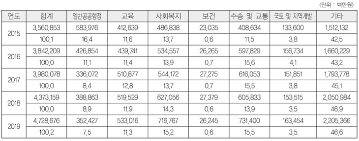 <´ë±¸½Ã ÃѰè, ¼ø°è ¼¼Ã⿹»ê ºÐ¼®, SOC °¼¼> ´ë±¸½Ã º»Ã»ÀÇ ¼ø°è¿¹»êÀ» ºÐ¾ßº°(14°³ ºÐ¾ß)·Î µé¿©´Ùº¸¸é, SOC ºÐ¾ß°¡ °¼¼ÀÓÀ» ¾Ë ¼ö ÀÖ´Ù. ¼ø°è´Â ±âÃÊ´Üü Áö¿ø, Ưº°È¸°è ÀÌÀü µîÀ» »« ´ë±¸½Ã°¡ ÁýÇàÇÏ´Â ¼ø¼ö ¿¹»êÀÌ´Ù. <Ç¥>¿¡¼ ¾Ë ¼ö ÀÖµíÀÌ, ¡®»çȸº¹Áö¡¯ ¿Í ¡®¼ö¼Û ¹× ±³Å롯Àº ´ë±¸½Ã°¡ ÁýÇàÇÏ´Â ¿¹»ê¿¡¼ °¡Àå ³ôÀº ºñÀ²À» Â÷ÁöÇÑ´Ù. ÀϹݰø°øÇàÁ¤Àº °ø¹«¿ø ÀΰǺñ°¡ ÁÖÀ̸ç, ¡®¼ö¼Û ¹× ±³Å롯 µîÀº ´ëÇ¥Àû SOC »ç¾÷ÀÌ´Ù. »ç½Ç Åä¸ñ°ø»ç´Â ½ÃÀÛÇÏ¸é ³¡ÀÌ ÀÖ´Ù°í ÇÏÁö¸¸, °è¼ÓÇØ¼ »õ·Î¿î °Ç¼³»ç¾÷À» ¾ç»êÇϱ⿡ ±× ºñÀ²ÀÌ Á»Ã³·³ ³·¾ÆÁöÁö ¾Ê°í ÀÖ´Ù. ´ë±¸¿¡¼ óÀ½ ÁöÇÏö °ø»ç¸¦ ÇÒ ¶§ ¡®¼ö¼Û ¹× ±³Å롯 ºÐ¾ßÀÇ ºñÀ²Àº 20%´ë±îÁö Ä¡¼Ú¾Ò´Ù. ÃÖ±Ù 5³âÀÇ ÃѰ迹»êÀ» º¸¸é ¡®¼ö¼Û ¹× ±³Å롯 ºÐ¾ß´Â ´ë·« 12~14%¸¦ Â÷ÁöÇØ ¼ø°è¿Í º°¹Ý Â÷À̰¡ ¾ø¾î ´ëºÎºÐ ´ë±¸½Ã°¡ ÁýÇàÇÔÀ» ¾Ë ¼ö ÀÖ´Ù. ¹Ý¸é, º¹Áö¿Í º¸°ÇÀº ±âÃÊÀÚÄ¡´Üü ÀÌÀüÀÌ »ó´çÇØ, º¹ÁöÀÇ °æ¿ì ÃѰ迡¼´Â 35% ÀüÈÄÁö¸¸ ¼ø°è´Â 15% Á¤µµ¿¡ ºÒ°úÇÏ´Ù. <Ç¥> ´ë±¸½Ãº»Ã» ¼¼Ãâ : ÅëÇÕÀçÁ¤°³¿ä(¿¹»ê) - ºÐ¾ßº° ¼¼Ãâ(¼ø°è, ´çÃÊ)
