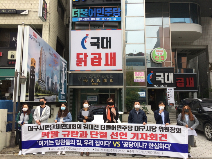 [°øµ¿±âÀÚȸ°ß] ¡®³«ÅÂÁË¡¯ Á¤ºÎÀÔ¹ý ¿¹°í¾È ±Ôź (10.12) 2019³â 4¿ù 11ÀÏ Çå¹ýÀçÆÇ¼Ò´Â ¡®³«ÅÂÁË¡¯¸¦ Çå¹ýºÒÇÕÄ¡ °áÁ¤À» ³»·È´Ù. Á¤ºÎ°¡ 10¿ù 7ÀÏ ¡®³«ÅÂÁË¡¯ °ü·Ã Çü¹ý°ú ¸ðÀÚº¸°Ç¹ý °³Á¤¾ÈÀ» ÀÔ¹ý¿¹°íÇÑ ³»¿ëÀ» º¸¸é ÀÌ¹Ì Çå¹ýÀçÆÇ¼Ò°¡ Çå¹ýºÒÇÕÄ¡ °áÁ¤À» ³»¸° 269Á¶ 1Ç×°ú 270Á¶ 1Ç×ÀÇ Ã³¹ú Á¶Ç×À» Çü¹ý¿¡ ±×´ë·Î Á¸Ä¡½ÃÄ×´Ù. ÀÌ¿¡ ¿©¼º´Üü µî 25°³ ´Üü´Â Á¤ºÎ ÀÔ¹ý¿¹°í¾ÈÀ» ±ÔźÇÏ°í ³«ÅÂÁË ¿ÏÀü ÆóÁö¿Í ¼º°ú Àç»ý»ê ±Ç¸®¸¦ º¸ÀåÇÒ °ÍÀ» Ã˱¸Çß´Ù. [¼º¸í] °øÁ÷¼±°Å¹ý °ø¼Ò½ÃÈ¿ ¸¸·á Àü, °ËÂûÀÇ ½Å¼ÓÇÏ°í ¾öÁ¤ÇÑ ¼ö»ç Ã˱¸ (10.12) ¿ì¸®º¹Áö½Ã¹Î¿¬ÇÕÀ¸·Î Á¦º¸ÇÑ A¾¾´Â B´Þ¼±¸ÀÇȸ ÀÇ¿øÀ» °øÁ÷¼±°Å¹ý À§¹ÝÀ¸·Î 10¿ù 12ÀÏ¿¡ ´ë±¸½Ã¼±°Å °ü¸®À§¿øÈ¸¿¡ ½Å°íÇß´Ù°í ¹àÇû´Ù. A¾¾´Â BÀÇ¿øÀÌ 4.15 ÃѼ±À» ¾ÕµÐ 3¿ù ¸» °æ¿¡ ´õºÒ¾î¹ÎÁÖ´ç ´Þ¼±¸ ¼±°ÅÄ·ÇÁ °ü°èÀÚ¿Í ÀÚ¿øºÀ»çÀÚ µî¿¡°Ô ½Ä»ç¸¦ Á¦°øÇß´Ù°í Á¦º¸Çß´Ù. ÀÌ¿¡ ¿ì¸®º¹Áö½Ã¹Î¿¬ÇÕÀº °øÁ÷¼±°Å¹ý 268Á¶¿¡ µû¶ó °ø¼Ò½ÃÈ¿°¡ 10¿ù 15ÀÏ ÀÚÁ¤¿¡ ¸¸·áµÊ¿¡ [°øµ¿¼º¸í] ´õºÒ¾î¹ÎÁÖ´ç ½Ã´çÀ§¿øÀå ¸·¸», °ø½Ä »ç°ú¾ø´Â ´ë±¸½Ã´ç °·Â ±Ôź (10.13) ´ë±¸½Ã¹Î´Üü¿¬´ëȸÀÇ´Â 9¿ù 22ÀÏ(È) ¡®´õºÒ¾î¹ÎÁÖ´ç ¼Ò¼Ó ´Þ¼±¸ÀÇȸ ÀÇ¿øµéÀÇ ¾÷¹«ÃßÁøºñ »çÀû À¯¿ë°ú °øÁ÷¼±°Å¹ý À§¹Ý ÀÇȤ¡¯ ±Ôź ±âÀÚȸ°ß ÈÄ Ç×ÀÇ ¹æ¹®ÇÑ ÀÚ¸®¿¡¼ ±è´ëÁø ´õºÒ¾î¹ÎÁÖ´ç ´ë±¸½Ã´ç À§¿øÀåÀÇ ¡®´ç¿øÀ̳ġ¯, ¡®´çºñ³»´Â ´ç¿øµéÀÇ Áý, ¿ì¸® ÁýÀÌ´Ù¡¯, ¡®¿¹ÀǸ¦ °®Ãß¾î¶ó¡¯, ¡®½Ã¹Î´Üü°¡ ¹«¾ùÀ» µµ¿ÍÁá´À³Ä¡¯ µî ¸·¸»ÀÌ À̾îÁ³´Ù. ÀÌ¿¡ ´ë±¸½Ã¹Î´Üü¿¬´ëȸÀÇ´Â ´õºÒ¾î¹ÎÁÖ´ç ´ë±¸½Ã´ç À§¿øÀåÀÇ °ø½Ä »ç°ú¸¦ 10¿ù 12ÀϱîÁö ¿ä±¸ÇÏ´Â °ø¹®À» 9¿ù 28ÀÏ º¸³ÂÀ¸³ª ¾Æ¹«·± ÀÀ´äÀÌ ¾ø¾î ±Ôź ¼º¸íÀ» ¹ßÇ¥ÇÏ°í °ø°³ ÁúÀǼ¸¦ º¸³Â´Ù. ´ë±¸½Ã´çÀ» ¡®¿ì¸® Áý¡¯À̶ó°í ÇßÀ¸´Ï Á¤¸» ¿ì¸® ÁýÀÎÁö ¿¹»êÀ» °ø°³ÇÒ °Í°ú ±è À§¿øÀåÀÌ ¹ß¾ð ÁøÀǸ¦ ¹àÈú °ÍÀ» ¿ä±¸Çß´Ù. [¼º¸í] 4.15ÃѼ± ¼±°Å»ç¹ü¿¡ ´ëÇÑ ¾öÁßÇÑ Ã³¹ú Ã˱¸ (10.16)