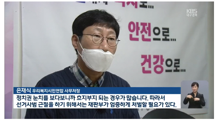 ¡ã ´ë±¸KBS 2020.10.16. 4.15ÃѼ± °øÁ÷¼±°Å¹ý À§¹Ý °ø¼Ò½ÃÈ¿°¡ 10¿ù 15ÀÏ ¸¸·áµÇ¾î ´ë±¸Áö°ËÀº ´ë±¸¡¤°æºÏ¿¡¼ ´ç¼±µÈ ±¹È¸ÀÇ¿ø 3¸í°ú ´Þ¼±¸ÀÇȸ ÀÇ¿ø 3¸íÀ» ºÒ±¸¼Ó±â¼Ò Çß´Ù. ±¹È¸ÀÇ¿øÀº ¸ðµÎ ±¹¹ÎÀÇÈû ¼Ò¼ÓÀ̰í, ´Þ¼±¸ÀÇȸ ±âÃÊÀÇ¿øÀº ¸ðµÎ ´õºÒ¾î¹ÎÁÖ´ç ¼Ò¼ÓÀÌ´Ù. ÀÌ¿¡ ¿ì¸®º¹Áö½Ã¹Î¿¬ÇÕÀº ¼±°Å»ç¹üÀÇ ±ÙÀýÀ» À§ÇØ °ËÂû°ú »ç¹ýºÎ¿¡ ¾öÁßÇÑ Ã³¹úÀ» Ã˱¸Çß´Ù. ±¹È¸¿¡´Â ±¹Á¤°¨»ç°¡ ÀÖ´Ù¸é ½ÃÀÇȸ¿¡´Â ÇàÁ¤»ç¹«°¨»ç°¡ ÀÖ´Ù. ÇàÁ¤»ç¹«°¨»ç´Â ÁýÇàºÎ 1³âÀ» Á¡°ËÇÏ°í Æò°¡ÇÏ´Â ÀåÀ¸·Î ÀÇÁ¤È°µ¿ÀÇ ÇÙ½ÉÀÌ´Ù. 11¿ù 7ÀϺÎÅÍ 14Àϰ£ ¿¸®´Â ´ë±¸½ÃÀÇȸ ÇàÁ¤»ç¹«°¨»ç¸¦ ¾ÕµÎ°í ¿ì¸®º¹Áö½Ã¹Î¿¬ÇÕÀº µÎ ¹ø¿¡ °ÉÃÄ Á¤Ã¥ Á¦¾ÈÀ» Çß´Ù. [º¸µµÀÚ·á] 2020 ´ë±¸½ÃÀÇȸ ÇàÁ¤»ç¹«°¨»ç Á¤Ã¥Á¦¾È ¨ç 14ÀÏ Áß ½ÇÁ¦ °¨»ç 5~10ÀÏ ºÒ°ú (10.19)
