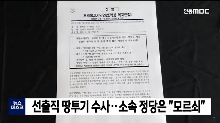 ¡ã ¾Èµ¿MBC 2021.4.29. ´ë±¸´Â ¼ö¼º±¸Ã»Àå ¼ö»ç¿¡ ÀÌ¾î ±Ç¿µÁø ½ÃÀå ¼±°ÅÄ·ÇÁ °ü°èÀÚ°¡ Á¶»ç¹Þ°í ÀÖÀ¸³ª ±¹¹ÎÀÇÈû ´ë±¸½Ã´çÀº ¸ð¸£¼è·Î ÀϰüÇϰí ÀÖ°í, °æºÏÀº Áö¹æÀÇ¿ø 1¸íÀÌ ±¸¼ÓµÇ°í 3¸íÀÌ ¾Ð¼ö¼ö»öÀ» ¹Þ´Â µî 6¸íÀÌ ¼ö»ç¸¦ ¹ÞÁö¸¸ ´õºÒ¾î¹ÎÁÖ´ç°ú ±¹¹ÎÀÇ´ç °æºÏµµ´çÀº ¸ð¸£¼èÇϰí ÀÖ´Ù. ÀÌ¿¡ °øÃµÇÏ¸é ³¡±îÁö Ã¥ÀÓÁö´Â Ã¥ÀÓÁ¤Ä¡ ½ÇÇöÀ» ¿©¾ß¿¡ ¿ä±¸Çϰí Á¤´çÀÌ Ã¥ÀÓÁö°í ¼±ÃâÁ÷ °ø¹«¿ø Àü¿ø ºÎµ¿»ê °ü·Ã ÀڷḦ °æÂû¿¡ Á¦ÃâÇÒ °ÍÀ» ¿ä±¸Çß´Ù. Ãâó : <ÇÔ²²ÇÏ´Â ¼¼»ó> 2021³â 5¿ùÈ£ Åë±Ç 284È£ |