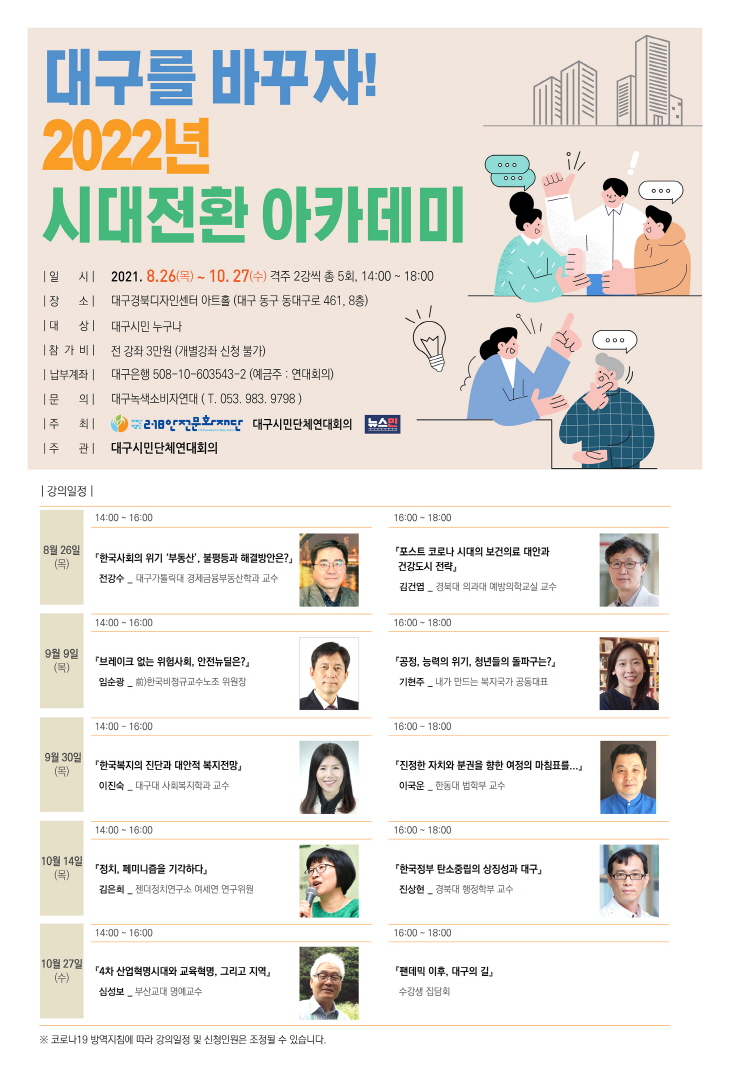 ¡®´ë±¸¸¦ ¹Ù²ÙÀÚ! 2022³â ½Ã´ëÀüȯ ¾ÆÄ«µ¥¹Ì¡¯´Â Äڷγª19 À¯Çà±â¸¦ °ÅÄ¡¸é¼ ¾ÈÀü, ±âÈÄ À§±â, ºÒÆòµî ¹®Á¦¸¦ ÇÙ½ÉÀ¸·Î ºÎµ¿»ê, °Ç°, º¹Áö, Á¨´õ µî ´õ ½É°¢ÇØÁö°í ÀÖ´Â »çȸ ¹®Á¦ÀÇ ÇØ°á°ú º¯È ¸ð»öÀ» À§ÇØ °¢ ¿µ¿ª ÇÐ°è ¹× ÇöÀå Àü¹®°¡·Î °¿¬À» ÁغñÇß´Ù. º¸Á¶¹ßÁ¦´Â Áö¿ªÀÇ ½Ã¹Î»çȸ Ȱµ¿°¡µé·Î ±¸¼ºÇß´Ù. ÁÖÁ¦´Â ½Ã¹ÎÀÇ »î°ú ¹ÐÁ¢ÇÑ ¡ãÁÖ°Å/ºÎµ¿»ê ¡ã°Ç° ¡ã¾ÈÀü ¡ãû³â ¡ãº¹Áö ¡ãÀÚÄ¡ ¡ãÁ¨´õ ¡ãȯ°æ ¡ã±³À°ÀÌ´Ù.