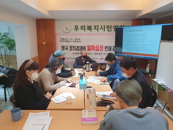 ù ¹øÂ° ºÏÄܼƮ¿¡ À̾î <ÇÏ·í¹ã¿¡ Àд ¿µ±¹»ç>, <¼È·Ï ȨÁî ´Ù½Ã Àбâ> ÀúÀÚÀÎ ¾Èº´¾ï ´ë±¸´ë ±¹Á¦°ü°èÇаú ±³¼ö¸¦ ¸ð½Ã°í ¡¸ÀúÀÚ¿Í ÇÔ²²ÇÏ´Â 15ÀÎÀ» À§ÇÑ µÎ ¹øÂ° ºÏÄܼƮ¡¹°¡ 12¿ù 15ÀÏ(¸ñ) ¿ÀÈÄ 7½Ã ¿ì¸®º¹Áö½Ã¹Î¿¬ÇÕ ¡®°ø°£ W¡¯¿¡¼ ¿·È´Ù. À̹ø ºÏÄܼƮ´Â ¡®¿µ±¹ Á¤Ä¡°æÁ¦ÀÇ ºÒÈ®½Ç¼º ¾ðÁ¦ °ÈÈ÷³ª¡¯¸¦ ÁÖÁ¦·Î Èï¹ÌÁøÁøÇÑ ¿µ±¹»ç À̾߱⸦ ÀºÀç½Ä ¿ì¸®º¹Áö½Ã¹Î¿¬ÇÕ »ç¹«Ã³ÀåÀÇ ÁøÇàÀ¸·Î 2½Ã°£ Á¤µµ ÁøÇàµÇ¾ú´Ù.