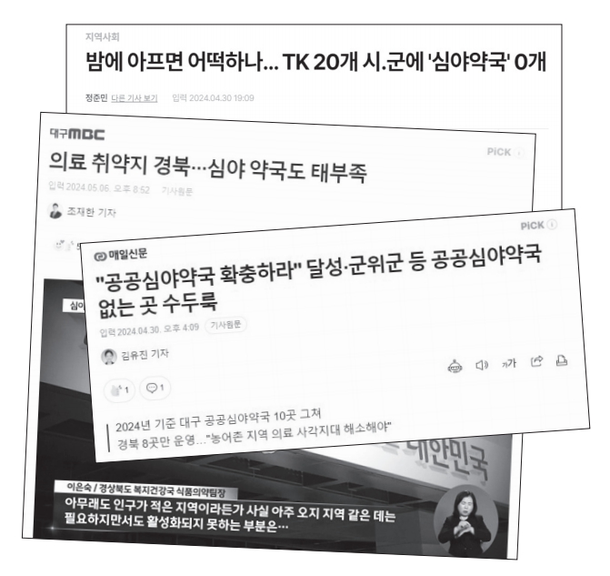 ´ë±¸¡¤°æºÏÀÇ °ø°ø½É¾ß¾à±¹ ¿î¿µ ½ÇŸ¦ Á¶»çÇÏ¿© ¹ßÇ¥ÇÏÀÚ, ¾ð·ÐÀº ´ë±¸º¸´Ù °æ»óºÏµµ¿¡ ÁýÁßÇß´Ù. ÆòÈ´º½º, ¸ÅÀϽŹ®, °æºÏ¸ÅÀÏÀÌ º¸µµÇß°í, ´ë±¸KBS´Â ´Ü½ÅÀ¸·Î ´ë±¸MBC´Â ¡®ÀÇ·á Ãë¾àÁö °æºÏ¡¦½É¾ß ¾à±¹µµ źÎÁ·¡¯ ¸®Æ÷Æ®¸¦ Á¦ÀÛÇß´Ù. ¶ÇÇÑ, Æ÷Ç×MBC ¡®¶óµð¿À ¿¸°¼¼»ó¡¯°ú KBSÆ÷Ç× ¡®»ý»ý¸Å°ÅÁø µ¿ÇØ¾È ¿À´Ã, Åõµ¥ÀÌ Æ÷Ä¿½º¡¯¿¡ °¢ 10ºÐ°ú 20ºÐ°¡·® ÀüÈ ÀÎÅͺ並 Çß´Ù. ´ë±¸ 10°÷, °æºÏ 8°÷À» ¿î¿µÇϴµ¥, ³ÐÀº Áö¿ª¿¡ ÀÇ·á »ç°¢Áö´ë°¡ ¸¹Àº °æ»óºÏµµ°¡ °íÀÛ 8°÷¿¡ ºÒ°úÇÏ´Ùº¸´Ï ´ë±¸MBC ¸®Æ÷Æ®¿Í ¶óµð¿À ÀÎÅÍºä ¸ðµÎ °æ»óºÏµµ¿¡ ÃÊÁ¡À» µÎ¾ú´Ù. ÆòÈ´º½º´Â ¿Ã 4¿ù ±âÁØ °æ±âµµÀÇ 58°÷¿¡ ºñÇØ ¿ì¸® Áö¿ªÀº ³Ê¹« ÀûÀº ¼ýÀÚ¶ó¸ç ½Ã¹Î ÀÎÅͺ並 ÅëÇØ °ø°ø½É¾ß¾à±¹ÀÇ Çʿ伺À» °Á¶Çß´Ù. ¾ß°£À̳ª ÈÞÀÏ¿¡ ´©±¸³ª ¼Õ½±°Ô ÆíÀÇÁ¡¿¡¼ »óºñ¾àǰÀ» »ì ¼ö ÀÖ¾î ¾à±¹ÀÇ Çʿ伺À» ´ú ´À³¥ ¼ö ÀÖ´Ù. ±×·¯³ª ÆíÀÇÁ¡¿¡¼ÀÇ ¾àǰ ±¸ÀÔÀº ¾à»çÀÇ º¹¾àÁöµµ ¾øÀÌ ÀüÀûÀ¸·Î °³ÀÎÀÇ ¼±ÅÃÀÌ´Ù. µ¿ÀÏÇÑ À̸§ÀÌ¶óµµ ¾à±¹¾àǰÀÇ ¼ººÐ µ¿ÀÏ ¿©ºÎµµ ±Ã±ÝÇÏ´Ù. ¹«¾ùº¸´Ù ²À ÇÊ¿äÇÒ ¶§´Â ¾à±¹ÀÌ ¸Ö¾î °¡´Â °ÍÀ» Æ÷±âÇØ °¡±î¿î °÷¿¡ ÀÖ¾úÀ¸¸é ÇÑ ÀûÀÌ ¸¹´Ù. °ø°ø½É¾ß¾à±¹Àº 2012³â ¾ÈÀü»óºñÀǾàǰ Á¦µµ°¡ µµÀÔµÇ¾î ¾à±¹»Ó ¾Æ´Ï¶ó ÆíÀÇÁ¡¿¡¼µµ ÀϺΠÀǾàǰÀ» ¼Õ½±°Ô ±¸¸ÅÇÒ ¼ö ÀÖ°Ô µÇ¸é¼, ´ëÇѾà»çȸ¸¦ Áß½ÉÀ¸·Î Áö¼ÓÀûÀ¸·Î ¹ýÁ¦È¸¦ ¿ä±¸Çß°í, Á¤ºÎ ½Ã¹ü»ç¾÷À» °ÅÃÄ 2023³â 4¿ù¿¡ ¾à»ç¹ýÀÌ °³Á¤µÇ¾î ¡®°ø°ø½É¾ß¾à±¹ ÁöÁ¤¡¤¿î¿µ¡¯ Á¶Ç×ÀÌ ½Å¼³µÇ¾î ¹ýÁ¦ÈµÇ°í ¿ÃÇØ 4¿ùºÎÅÍ ½ÃÇàµÇ¾ú´Ù. ±×·¯³ª ½Ã°£´ç 3¸¸ ¿ø Áö¿ø(¿ÃÇØ 4¸¸ ¿ø)À¸·Î´Â ÀÏÇÒ ¾à»çµµ ¸ø ±¸ÇÏ°í µ·µµ ¾È µÅ Âü¿©ÇÏ´Â ¾à±¹ È®º¸¿¡ »¡°£ºÒÀÌ ÄÑÁø °Íµµ Çö½ÇÀÌ´Ù. Á¤È®ÇÑ º¹¾àÁöµµ¿Í ½É¾ß ÀÇ·á°ø¹éÀ» ÁÙ¿© Áö¿ª¹ÎµéÀÇ °Ç°ÁõÁø¿¡ ±â¿©Çϱâ À§ÇØ ¡®°ø°ø¡¯À» ¾Õ¿¡ ºÙ¿´´Ù¸é, ¼öÀͼº ³í¸®°¡ ¾Æ´Ï¶ó Á¤Ã¥ÀûÀÎ Áö¿øÀÌ ¹Ýµå½Ã ÇÊ¿äÇÏ´Ù. ±×·¯³ª °æºÏµµ´Â ¾ð·Ð ÀÎÅͺ信¼ ¡°º¸°Çº¹ÁöºÎ ±¹ºñ ¿¹»ê ¿©ºÎ¿¡ µû¶ó ±Ô¸ð°¡ Á¤ÇØÁø´Ù¡±¸ç ¿¹»êŸ·ÉÀ» Çß´Ù. ¿ÃÇØ °æºÏµµÀÇ ¿¹»êÀº 3¾ï 5õ¸¸ ¿ø Á¤µµÀ̰í Àü¾× ±¹ºñÀÌÁö¸¸, ´ë±¸½Ã´Â ½Ãºñ¿Í ±¸ºñ·Î Áö¿øÇϰí ÀÖ¾î ´ë±¸º¸´Ù °ø°ø½É¾ß¾à±¹ÀÌ ´õ ÇÊ¿äÇÑ °æ»óºÏµµÀÇ ÇØ¸íÀº ±Ã»öÇÏ´Ù. ÆòÈ´º½º ÀÎÅͺ信¼ ±èÈïÁØ ´ë±¸½Ã º¸°ÇÀÇ·áÁ¤Ã¥°úÀåÀº ¡°°ø°ø½É¾ß¾à±¹ÀÌ ¾ø´Â µ¿±¸ÀÇ °æ¿ì ¿ÃÇØ ¾È¿¡ ÁöÁ¤Çϱâ À§ÇØ ´ë±¸½Ã¾à»çȸ¿Í °è¼Ó ³ë·ÂÇϰí ÀÖ´Ù¡±°í ¹àÇû°í, ÀÌÁ¤¾Æ °æºÏµµ ½ÄǰÀǾà°úÀåÀº "°ü·Ã ¿¹»êÀÌ ¸¹Áö ¾Ê°í, ¾à»çµéµµ ½É¾ß ½Ã°£ À§ÇèÀ» ÀÌÀ¯·Î ¿î¿µÀ» Àß ¾È ÇÏ·Á°í ÇÏ´Â °Í °°´Ù"¸ç ¡°°æºÏµµ¾à»çȸ¿Í ³íÀÇÇØ »ç¾÷À» ´õ È®ÃæÇØ³ª°¡°Ú´Ù¡±°í ¸»Çß´Ù. ½É¾ß½Ã°£¿¡ À§Çè¿¡ ³ëÃâµÉ ¼öµµ Àֱ⿡ ÆÄÃâ¼Ò µî°ú ¿¬°èÇØ ÇØ¼ÒÇÏ´Â °Íµµ °ø°øÀÌ Ç®¾î¾ß ÇÒ °úÁ¦´Ù. »ç½Ç, °ø°ø½É¾ß¾à±¹ÀÇ ½ÃÃÊ´Â ´ë±¸´Ù. 2008³â 5¿ù ´ë±¸¾à»çȸ°¡ ½Ã¹ü»ç¾÷À¸·Î óÀ½ ¿î¿µÇÑ ¸¸Å ´ë±¸¡¤°æºÏ¿¡ ½Ã¡¤µµ¹ÎÀÇ °Ç°±Ç º¸ÀåÀ» À§ÇØ ´õ ¸¹Àº °ø°ø½É¾ß¾à±¹ÀÌ ¿î¿µµÇ´ÂÁö ¿ì¸®º¹Áö½Ã¹Î¿¬ÇÕÀº °è¼Ó ÁöÄѺ¼ °ÍÀÌ´Ù. <Ãâó: ÇÔ²²ÇÏ´Â ¼¼»ó Åë±Ç 320È£(2024.5.)>