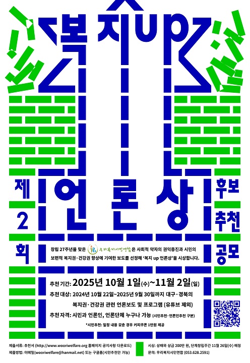 ¿ì¸®º¹Áö½Ã¹Î¿¬ÇÕ, Á¦2ȸ ¡¸º¹Áö up ¾ð·Ð»ó¡¹ Èĺ¸ Ãßõ °ø°í ´ë±¸¡¤°æºÏÀÇ º¹Áö±Ç¡¤°Ç°±Ç °È¿¡ ¿µÇâÀ» ÁØ º¸µµ ¹× ÇÁ·Î±×·¥À» ã½À´Ï´Ù. ½Ã¹Î¡¤¾ð·ÐÀÎ(¾ð·Ð´Üü) ´©±¸³ª ÃßõÇÒ ¼ö ÀÖ½À´Ï´Ù. Ä¿ÇÇ ÄíÆùµµ ¹Þ°í º¹Áö¿Í °Ç°±Ç °È¿¡µµ Âü¿©Çϰí, ȸ¿øºÐµé°ú µ¶ÀÚ, ±×¸®°í º¸°Çº¹ÁöÇöÀå¿¡¼ ¸¹ÀÌ ÃßÃµÇØÁÖ¼¼¿ä. ¡®º¹Áö up ¾ð·Ð»ó¡¯Àº ±âȹÀ̳ª ÇöÀåÃëÀç, Á¦º¸, Ž»çº¸µµ µîÀ» ÅëÇØ ´ë±¸¡¤°æºÏÀÇ »êÀçÇÑ º¸°Çº¹Áö °ü·Ã À̽´¸¦ Àû±ØÀûÀ¸·Î ¹ß±¼ÇÏ°í ¹®Á¦Á¡°ú ´ë¾ÈÀ» Á¦½ÃÇÏ¸ç ½Ã¹Î»çȸÀÇ ´ëÀÀÀ» ÃËÁøÇÏ¿© Á¤ºÎ¿Í ÁöÀÚüÀÇ Á¤Ã¥º¯È¿Í Á¦µµ°³¼±¿¡ ±àÁ¤Àû ¿ªÇÒÀ» ÇϰíÀÚ 2024³â Á¦Á¤(1ȸ ½Ã»óÀÚ : TBC °£º´ÀÇ ±¼·¹ ¿¬¼Óº¸µµ)µÇ¾î 2ȸ¸¦ ¸Â¾Ò½À´Ï´Ù. ¿ì¸®º¹Áö½Ã¹Î¿¬ÇÕÀº ¿ì¸® »çȸÀÇ º¹ÁöÁõÁø°ú ½Ã¹ÎÀÇ °Ç°±Ç È®´ë¿¡ ±â¿©ÇÑ ¾ð·Ð º¸µµ¸¦ ¹ß±¼ÇÏ°í °Ý·ÁÇϰíÀÚ ¡¸Á¦2ȸ ¡®º¹Áö up ¾ð·Ð»ó¡¯¡¹ Èĺ¸ Ãßõ °ø¸ð¸¦ ½ÃÀÛÇÕ´Ï´Ù. ¡®º¹Áö up ¾ð·Ð»ó¡¯Àº »çȸÀû ¾àÀÚÀÇ ±ÇÀÍÁõÁø µî ½Ã¹ÎÀÇ º¸ÆíÀû º¹Áö±Ç°ú °Ç°±Ç °È¿¡ ±àÁ¤ÀûÀÎ º¯È¸¦ À̲ö ¾ð·Ð º¸µµ¿Í ÇÁ·Î±×·¥À» ã¾Æ ½Ã»óÇÏ´Â µ¥ ¸ñÀûÀ» µÎ°í ÀÖ½À´Ï´Ù. ¹æ¼Û, ½Å¹®, ¿Â¶óÀÎ µî ¸Åü¿¡ Á¦ÇÑ ¾øÀ¸¸ç(À¯Æ©ºê Á¦¿Ü), ¾ð·ÐÀÎ ¹× ¾ð·Ð´Üü(¾ð·Ð³ëÁ¶ Æ÷ÇÔ), º¸°Çº¹ÁöÇöÀåÀº ¹°·Ð ½Ã¹Î ´©±¸³ª ÃßõÇÒ ¼ö ÀÖ½À´Ï´Ù. Ãßõ¹ÞÀº º¸µµ´Â ¼±Á¤À§¿øÈ¸(À§¿øÀå : ±è±Ô¿ø °æºÏ´ë ¸í¿¹±³¼ö) ½ÉÀǸ¦ °ÅÃÄ ´Üü ⸳±â³äÁÖ°£ÀÎ 11¿ù 26ÀÏ(¿¹Á¤) ¼ÒÁ¤ÀÇ »ó±Ý°ú ÇÔ²² ½Ã»óÇÒ ¿¹Á¤ÀÔ´Ï´Ù. ÁÁÀº º¸µµ(ÇÁ·Î±×·¥)°¡ Á¦2ȸ ¡¸º¹Áö up ¾ð·Ð»ó¡¹ ¼ö»óÀÇ ¿µ¿¹¸¦ ¾ÈÀ» ¼ö ÀÖµµ·Ï ¸¹Àº Ãßõ ¹Ù¶ø´Ï´Ù. Á¦2ȸ º¹Áö up ¾ð·Ð»ó Èĺ¸ Ãßõ ¿ä·É < Ãßõ±â°£ > 2025³â 10¿ù 1ÀÏ(¼ö) ~ 11¿ù 2ÀÏ(ÀÏ) < Ãßõ´ë»ó > 2024³â 10¿ù 22ÀÏ ~ 2025³â 9¿ù 30ÀϱîÁö ´ë±¸¡¤°æºÏÀÇ º¹Áö±Ç¡¤°Ç°±Ç °ü·Ã ¾ð·Ðº¸µµ ¹× ÇÁ·Î±×·¥ (À¯Æ©ºê Á¦¿Ü) < ÃßõÀÚ°Ý > ½Ã¹Î°ú ¾ð·ÐÀÎ(¾ð·Ð´Üü) ´©±¸³ª °¡´É (½Ã¹ÎÃßõ¡¤¾ð·ÐÀÎÃßõ ±¸ºÐ) * ½Ã¹ÎÃßõ : ÃëÁö¿Í ÀÏÁ¤ÇÑ ³»¿ë¿¡ ºÎÇÕÇϸé 1¸¸¿ø »ó´ç Ä¿ÇÇÄíÆù Á¦°ø < Á¦Ãâ¼·ù > Ãßõ¼ (ȨÆäÀÌÁö<http://www.wooriwelfare.org> °øÁö»çÇ×(890¹ø) ´Ù¿î·Îµå) < Á¦Ãâ¹æ¹ý > À̸ÞÀÏ(wooriwelfare@hanmail.net) ¶Ç´Â ±¸±ÛÆû(½Ã¹ÎÃßõ¸¸ °¡´É) < ½Ã »ó > »óÆÐ¿Í »ó±Ý 200¸¸ ¿ø, 2025³â 11¿ù 26ÀÏ(¼ö) ¿ÀÈÄ 5½Ã(¿¹Á¤) ¡Ù ½Ã¹ÎÃßõ¼ ÀÛ¼º Tip ¨ç ƯÁ¤ ¾ð·Ð»ç ¶Ç´Â ƯÁ¤ ±â°£À» ¸ð´ÏÅÍÇϸç ÀÛ¼º, ¾ð·Ð»ç ¸ðµÎ¸¦ °Ë»öÇϸé Èûµé ¼ö ÀÖ¾î¿ä. ¨è ÁöÀεé°ú ÇÔ²² °øµ¿ÀÛ¾÷Çϸé Àç¹ÌÀÖ°í ½Ã°£µµ ´ÜÃàÇØ¿ä. ¨é º¸°Çº¹ÁöÇöÀåÀ̳ª °ü·Ã Çаú ÇлýÀÇ °æ¿ì, °ü½ÉÀÖ´Â ÁÖÁ¦¿Í ³»¿ë Áß½ÉÀ¸·Î °Ë»öÇØ¿ä ¨ê ¿¹½Ã : ( )±â»ç(±âÀÚ)´Â ¡Û¡Û¡Û»ç°Ç(º¸µµ)¿¡ ´ëÇÑ ½ÉÃþÃëÀ縦 ÅëÇØ »çȸÀû À̽´¸¦ °ø·ÐÈÇÏ°í °ü·Ã Á¦µµÀÇ Çã¼úÇÔÀ» ÁöÀûÇϸç Á¦µµ°³¼±À» À̲ø¾î ³»´Âµ¥ ±â¿© ![]() |