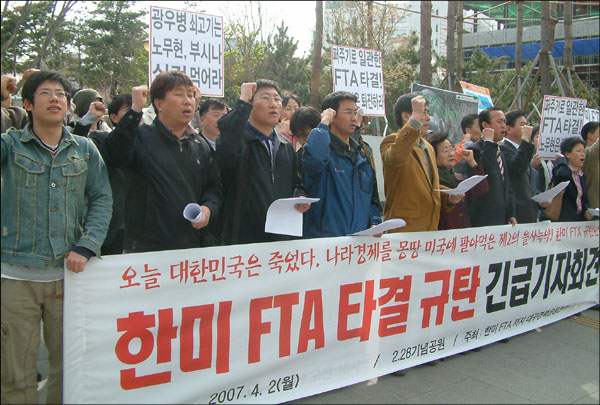 [ÇѹÌFTA Ÿ°á] ´ë±¸°æºÏ ½Ã¹Î»çȸ, "ºñÁØ °ÅºÎ. ±¹¹ÎÅõÇ¥"...¸ÅÀÏ ÃкÒÁýȸ "¿ª»ç´Â ¿À´ÃÀ» ¾î¶»°Ô ±â·ÏÇÒ °ÍÀΰ¡?" 2007³â 4¿ù 2ÀÏ ¿ÀÈÄ. ¡®ÇѹÌFTA¡¯°¡ ³¡³» Ÿ°áµÆ´Ù´Â ¼Ò½ÄÀÌ ÀüÇØÁöÀÚ Áö³ 1³âµ¿¾È ¡®Çù»ó Áß´Ü¡¯À» ¿ä±¸ÇØ ¿Â ´ë±¸°æºÏÁö¿ª ½Ã¹Î»çȸ´ÜüµéÀÌ ´ë±¸2.28°ø¿ø¿¡¼ ±ä±Þ ±âÀÚȸ°ßÀ» ¿¾ú´Ù. [ÇѹÌFTA ÀúÁö ´ë±¸°æºÏ¿îµ¿º»ºÎ]´Â À̳¯ ¿ÀÈÄ 1½ÃÂë 'Çù»ó Ÿ°á' ¼Ò½ÄÀÌ ¾Ë·ÁÁöÀÚ Áö¿ª °¢°è Àλçµé¿¡°Ô ÈÞ´ëÆù ¹®ÀÚ¸Þ½ÃÁö·Î À̸¦ ¾Ë¸° µÚ, ¿ÀÈÄ 3½Ã ±ä±Þ ±âÀÚȸ°ßÀ» ¿°í "±¹È¸ ºñÁØ °ÅºÎ", "³ë¹«Çö Á¤±Ç ÅðÁø"À» ¿ÜÃÆ´Ù. ¶Ç, ±¹¹ÎµéÀÌ Á÷Á¢ ÆÇ´ÜÇÏ°í °áÁ¤ÇÒ ¼ö ÀÖµµ·Ï ÇѹÌFTA Ÿ°á¾È¿¡ ´ëÇÑ ¡®±¹¹ÎÅõÇ¥¡¯¸¦ ÁÖÀåÇß´Ù. [ÇѹÌFTA ÀúÁö ´ë±¸°æºÏ¿îµ¿º»ºÎ]¿¡´Â [´ë±¸°æºÏÅëÀÏ¿¬´ë]¿Í [´ë±¸°æºÏ¹ÎÁß¿¬´ë], [´ë±¸½Ã¹Î´Üü¿¬´ëȸÀÇ]¸¦ ºñ·ÔÇØ ´ë±¸°æºÏÁö¿ª 56°³ ½Ã¹Î.»çȸ´Üü°¡ Âü¿©Çϰí ÀÖ´Ù. ´ë±¸°æºÏ¿îµ¿º»ºÎ ±èÂù¼ö °øµ¿´ëÇ¥(¹Î³ë´ç ´ë±¸½Ã´çÀ§¿øÀå)´Â ¡°¿ª»ç°¡ ¿À´ÃÀ» ¾î¶»°Ô ±â·ÏÇÒ °ÍÀΰ¡?¡±¶ó°í ¸»À» ¶¾ µÚ, ¡°¿ª»ç´Â ¿À´ÃÀ» Ä¡¿å.¸Á±¹ÀÇ ³¯·Î ±â·ÏÇÒ °ÍÀ̸ç, ³ë¹«Çö Á¤±ÇÀº ¿ª»çÀÇ ½ÉÆÇÀ» ¸éÇÏÁö ¸øÇÒ °Í¡±À̶ó¸ç Á¤ºÎ¸¦ ºñ³Çß´Ù. ±è ´ëÇ¥´Â ¶Ç, ¡°ÀÌÁ¦´Â ¡®ÇѹÌFTA¡¯°¡ ¹«È¿ÀÓÀ» ¼±¾ðÇϰí, Ÿ°á¾ÈÀ» Á¶¸ñÁ¶¸ñ ºÐ¼®.ºñÆÇÇÏ¸ç ¡®±¹È¸ ºñÁØ °ÅºÎ¡¯¿¡ ¿Â ÈûÀ» ¸ð¾Æ¾ß ÇÑ´Ù¡±°í °Á¶Çß´Ù. "±¹¹Î ¼Ò¸®¿¡ ´«.±Í Ʋ¾î¸·Àº ³ë Á¤±Ç¿¡ ¹«½¼ ±â´ë¸¦.." ¿îµ¿º»ºÎ´Â À̳¯ ¼±¾ð¹®À» ÅëÇØ ¡°³ë¹«Çö Á¤±ÇÀº Çù»ó ³»¿ëÀ» °ø°³Ç϶ó´Â ±¹¹ÎµéÀÇ ¿ä±¸¿¡ ¡®Çù»óÀü¼ú¡¯À̶ó´Â ¾îÀ̾ø´Â ´äº¯À¸·Î ÆÛÁֱ⠳îÀ½À» ¼û±â±â¸¸ ÇßÀ» »Ó ¾Æ´Ï¶ó, Çù»ó »ó´ë±¹ÀÎ ¹Ì±¹ÀÇ Á¤Ä¡ÀÏÁ¤¿¡ ¸ÂÃç Çù»ó Ÿ°áÀ» ±¸°ÉÇÏ´Â ±¹¹Î ±â¸¸°ú »ç±â±ØÀ» ÆîÃÆ´Ù¡±°í ºñ³Çß´Ù. À̾î, ¡°±¹¹ÎÀÇ ¼Ò¸®¿¡ ´«°ú ±Í¸¦ Ʋ¾î¸·Àº ³ë Á¤±Ç¿¡°Ô ¹«¾ùÀ» ´õ ±â´ëÇÒ ¼ö ÀÖ°Ú´À³Ä¡±¸ç ¢ºÇѹÌFTA Ÿ°á¾È¿¡ ´ëÇÑ ¡°±¹È¸ºñÁØ °ÅºÎ¡± ¢º¡°±¹¹ÎÅõÇ¥ ½Ç½Ã¡± ¢º¡°³ë¹«Çö Á¤±Ç ÅðÁø¡±À» Ã˱¸Çß´Ù. [ÇѹÌFTA ÀúÁö ´ë±¸°æºÏ¿îµ¿º»ºÎ] À̴뿵 ÁýÇàÀ§¿øÀåÀº ¡°°¨Á¤ÀÌ Ä¡¹Ð¾î ¿À¸£°í ´«¹°ÀÌ ³´Ù¡±¸ç ¡°87³â ÀÌÈÄ 20³â°£ ÇØ ¿Â ¹ÎÁÖÈ ¿ª»ç°¡ ¹è¹Ý´çÇÑ ´À³¦¡±À̶ó°í ºÐÀ» ÂüÁö ¸øÇß´Ù. ¶Ç, [´ë±¸°æºÏÅëÀÏ¿¬´ë] ¿ÀÅÃÁø(34) »ç¹«Ã³Àåµµ, ¡°¿ì¸® Á¤ºÎ´Â ÇѹÌFTA¸¦ °ÆÁ¤ÇÏ´Â ±¹¹ÎÀÇ ¸ñ¼Ò¸®¸¦ ³¡±îÁö ¿Ü¸éÇÑ Ã¤ öÀúÈ÷ ¹Ì±¹¿¡ ²ø·Á°¡´Â Çù»óÀ» Çß´Ù¡±¸ç ¡°Çã¸ÁÇϰí ÇãÅ»ÇÏ°í ºÐ³ë¸¦ ´À³¥ »Ó¡±À̶ó°í ¸»Çß´Ù. [´ë±¸½Ã¹Î´Üü¿¬´ëȸÀÇ] Á¶±¤Áø ´ëÇ¥(´ë±¸KYC ´ëÇ¥)´Â ¡°³ë Á¤±ÇÀº Çù»ó ½ÃÀÛºÎÅÍ ¡®Å¸°á¡¯À» ÀÛÁ¤ÇßÁö¸¸ ±×°ÍÀ» ¸·À» ±¹¹ÎÀÇ ÈûÀÌ ³ë Á¤±Çº¸´Ù ¾àÇß´Ù¡±¸ç ¡°±¸Ã¼ÀûÀΠŸ°á¾ÈÀÌ ³ª¿À¸é °¢°è °¢ÃþÀÌ ¡®ºñÁØ °ÅºÎ¡¯¿¡ ÈûÀ» ¸ð¾Æ¾ß ÇÑ´Ù¡±°í °Á¶Çß´Ù. Á¶ ´ëÇ¥´Â ¡°ÅõÀïÀº Áö±ÝºÎÅÍ¡±¶ó°í ÈûÁà ¸»Çß´Ù. [ÇѹÌFTA ÀúÁö ´ë±¸°æºÏ¿îµ¿º»ºÎ]´Â ¿À´Ã Àú³á 7½Ã ´ë±¸2.28°ø¿ø¿¡¼ ÃкÒÁýȸ¸¦ °®´Â °ÍÀ» ½ÃÀÛÀ¸·Î, ¿À´Â 6ÀÏ(±Ý)±îÁö ¸ÅÀÏ Àú³á ±Ôź Áýȸ¸¦ °®´Â ÇÑÆí, °¢ ´Üü¸¶´Ù ¡®ÇѹÌFTA Ÿ°á¡¯À» ±ÔźÇÏ´Â ¼º¸íÀ» ¹ßÇ¥ÇÏ°í ±Ôź Çö¼ö¸·À» ´Üü »ç¹«½Ç Àα٠±³Â÷·Î¿¡ ³»°É±â·Î Çß´Ù. Àü³ó °æºÏµµ¿¬¸Íµµ 2ÀÏ ¿ÀÈÄ ¼º¸íÀ» ³»°í, ¹Ð½Ç.Á¹¼Ó ÇѹÌFTA Çù»ó ¿øÃµ ¹«È¿"¸¦ ÁÖÀåÇß´Ù. °æºÏµµ¿¬¸ÍÀº "ÇѹÌFTA Çù»óÀº Ä£¹Ì»ç´ëÁÖÀÇ·Î ÀϰüÇÑ ÆÛÁÖ±â Çù»ó, ¿©·ÐÀ» È£µµÇÏ°í ¹ÎÁßÀ» ¿ì·ÕÇÑ Ä¡¿å°ú ±¼¿åÀÇ Çù»óÀ̾ú´Ù"¸ç "Çù»ó ³»¿ëÀ» Àü¸é °ø°³ÇÏ°í ±¹¹ÎÅõÇ¥¸¦ ½Ç½ÃÇ϶ó"°í Ã˱¸Çß´Ù. ±Û.»çÁø ÆòÈ´º½º À¯Áö¿õ ±âÀÚ (4/2)pnnews@pn.or.kr / pnnews@hanmail.net |