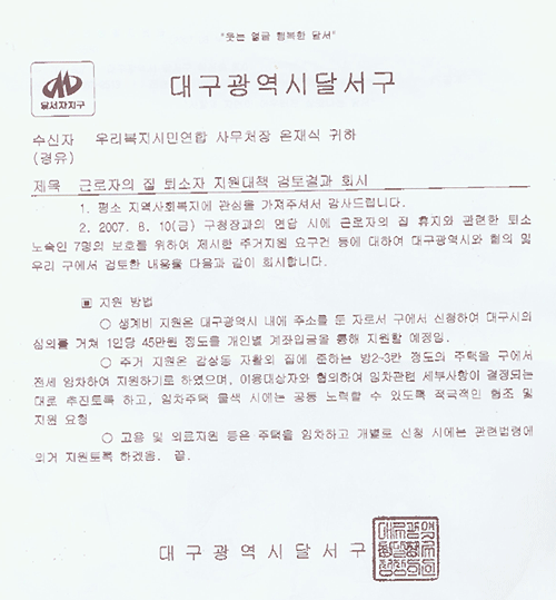 ´Þ¼±¸Ã» »õ·Î¿î ³ë¼÷ÀÎ ÁÖ°Å´ëÃ¥ ¹ßÇ¥, ³ë¼÷´ç»çÀÚµéÀÇ Âü¿©ÇÏ¿¡ ÁְŰø°£ ¸¶·Ã Áö³ 8¿ù7ÀÏ ³ë¼÷ÀÎ ´ç»çÀÚ ¸ðÀÓÀÎ ¡®´Ù½Ã¼´Â »ç¶÷µé¡¯°ú ¿ì¸®º¹Áö½Ã¹Î¿¬ÇÕ µî 11°³ ½Ã¹Î»çȸ´Üüµé·Î ±¸¼ºµÈ ¡º»çȸº¹Áö½Ã¼³ ºñ¸®¿Í ÀαÇÄ§ÇØ ô°á ¹× ³ë¼÷ÀÎ ÁÖ°Å±Ç º¸ÀåÀ» À§ÇÑ °øµ¿´ëÃ¥À§¡»´Â Á¹Áö¿¡ ÇàÁ¤ÀÇ À߸øÀ¸·Î ºÒ¾ÈÁ¤ÇÑ ÁÖ°Å»óȲ¿¡ ³õÀÎ ³ë¼÷ÀεéÀÇ ÁְűÇÀ» º¸ÀåÇÒ °ÍÀ» Ã˱¸ÇÏ¸ç ±âÀÚȸ°ß°ú ´Þ¼±¸Ã» ·Îºñ ³ó¼ºÀ» ÆîÃÆÀ¸¸ç, 8¿ù10ÀÏ ´Þ¼±¸Ã»Àå°úÀÇ 2Â÷ ¸é´ã¿¡ ´ëÇÑ ¾à¼ÓÀ» ¹Þ°í ÀÚÁøÇØ»êÇÑ ¹Ù ÀÖ´Ù. ±× °á°ú·Î 8¿ù14ÀÏ ´Þ¼±¸Ã»Àº ÇöÀç ÁÖ°Å´ëÃ¥À» È£¼ÒÇϰí ÀÖ´Â 7¸íÀÇ ³ë¼÷ÀεéÀ» À§ÇØ ¡Û »ý°èºñ Áö¿øÀº ´ë±¸±¤¿ª½Ã ³»¿¡ ÁÖ¼Ò¸¦ µÐ Àڷμ ±¸¿¡¼ ½ÅûÇÏ¿© ´ë±¸½ÃÀÇ ½ÉÀǸ¦ °ÅÃÄ 1Àδç 45¸¸¿ø Á¤µµ¸¦ °³Àκ° °èÁÂÀÓ±ÝÀ» ÅëÇØ Áö¿øÇÏ°í ¡Û ÁÖ°Å Áö¿øÀº °¨»ïµ¿ ÀÚȰÀÇ Áý¿¡ ÁØÇÏ´Â ¹æ 2~3Ä Á¤µµÀÇ ÁÖÅÃÀ» ±¸¿¡¼ Àü¼¼ ÀÓÂ÷ÇÏ¿© Áö¿øÇÏ¸ç ¡Û ÀÌ¿ë´ë»óÀÚ¿Í ÇùÀÇÇÏ¿© ÀÓÂ÷°ü·Ã ¼¼ºÎ»çÇ×ÀÌ °áÁ¤ µÇ´Â´ë·Î ÃßÁøÅä·ÏÇϰí, ÀÓÂ÷ÁÖÅà ¹°»ö ½Ã¿¡´Â °øµ¿ ³ë·ÂÇÒ ¼ö ÀÖµµ·Ï Àû±ØÀûÀÎ ÇùÁ¶ ¹× Áö¿ø ¿äûÇÏ°í ¡Û °í¿ë ¹× ÀÇ·áÁö¿ø µîÀº ÁÖÅÃÀ» ÀÓÂ÷ÇÏ°í °³º°·Î ½Åû½Ã¿¡´Â °ü·Ã¹ý·É¿¡ ÀǰŠÁö¿ø µîÀ» ÇÏ°Ú´Ù°í ¹àÈû¿¡ µû¶ó À̹ø »ç°ÇÀº »õ·Î¿î Àü±â¸¦ ¸Â°í ÀÖ´Ù. °ø´ëÀ§ÀÇ ÇÑ °ü°èÀÚ´Â ¡°À̹ø ´Þ¼±¸ÀÇ Á¶Ä¡´Â ³ë¼÷ÀεéÀÇ ÀÚ±â°áÁ¤±ÇÀ» Á¸ÁßÇϰí, ´Þ¼±¸Ã»ÀÇ Ã¥ÀÓ¼ºÀ» µ¿½Ã¿¡ ´ãº¸ÇÏ´Â °ÍÀ¸·Î Ÿ ½Ã¼³·Î Àü¿øÁ¶Ä¡ÇÒ °ÍÀ» °íÁýÇÑ ±âÁ¸ÀÇ ¹æ¾È¿¡ ºñÇØ »ó´çºÎºÐ ÁøÀϺ¸ÇÑ ³»¿ë¡±À̶ó°í Æò°¡Çß´Ù. °ø´ëÀ§´Â 16ÀÏ ¼º¸í¿¡¼ ¡°°©ÀÛ½º·¯¿î ½Ã¼³ÈÞÁö·Î µÎ´Þ ³Ñ°Ô ¹°ÁúÀû, Á¤½ÅÀû °íÃæÀ» °Þ¾î ¿Â ³ë¼÷Àε鿡 ´ëÇØ ±ä±Þ±¸È£Çü½ÄÀ¸·Î »ý°èºñ¸¦ Áö¿øÇϰí, ´Þ¼±¸Ã»ÀÌ Á÷Á¢ Àü¼¼·Î ÁְŰø°£À» ¸¶·ÃÇϰڴٴ °ÍÀº ´Ê¾úÁö¸¸ ȯ¿µÇÑ´Ù¡±°í ¹àÇû´Ù. ¶ÇÇÑ ¡°³ë¼÷Àν°ÅÍ Àç°³¼ÒÀü±îÁö ÃÖ¼ÒÁÖ°Å±Ç ÀÌ»óÀ¸·Î ¾ÈÁ¤ÀûÀÎ ÁְŰø°£À» ³ë¼÷´ç»çÀÚµéÀÇ ÀǰßÀ» ÃæºÐÈ÷ ¼ö·ÅÇÏ¿© ´Þ¼±¸Ã»ÀÌ È®º¸ÇØ¾ß ÇÑ´Ù¡±¸ç ¡°ÁְŹ®Á¦¸¦ È£¼ÒÇÑ ³ë¼÷ÀÎ 7¸í Áß ÀϺΰ¡ 8¿ù¸»¿¡ ÀӽðÅÁÖÁö¿¡¼ ³ª¿Í¾ß ÇÏ´Â °ü°è·Î 8¿ù¸»±îÁö ÁְŰø°£À» ¸¶·ÃÇÒ °Í¡±À» Ã˱¸Çß´Ù. ÀÌ¿¡ ¾Õ¼ ´Þ¼±¸Ã»Àº ³ë¼÷ÀεéÀÇ ÀÇ»ç¿Í »ó°ü¾øÀÌ Å¸ ÀÚÄ¡´Üü°¡ ¿î¿µÇÏ´Â ³ë¼÷Àν°ÅÍ·Î Àü¿øÁ¶Ä¡Çϰڴٴ ÀÔÀåÀ» °í¼ö, ³ë¼÷ ´ç»çÀÚ³ª ½Ã¹Î»çȸ´Üü·ÎºÎÅÍ °Å¼¾ ¹Ý¹ßÀ» ÀÚÃÊÇØ ±Þ±â¾ß ´Þ¼±¸Ã» ·Îºñ³ó¼º¸¦ ºÒ·¯¿À±âµµ Çß´Ù. ÇÑÆí, °ø´ëÀ§´Â ´ë±¸½Ã°¡ Áö³ 7¿ù9ÀϺÎÅÍ 5Àϰ£ ½Ç½ÃµÈ S¹ýÀÎÀÇ °¨»ç°á°ú¿¡ ´ëÇØ¼ Á¶¸¸°£ ÀÔÀåÀ» Á¤¸®Çؼ ¹ßÇ¥ÇÒ ¿¹Á¤ÀÌ´Ù. [»ç°Ç°æ°ú] ¡Û 5¿ù31ÀÏ : ¤µ ¹ýÀÎ ³ë¼÷Àν°ÅÍ ½Ã¼³ÈÞÁö ´Þ¼±¸Ã»¿¡ ½Å°í ¡Û 6¿ù 1ÀÏ : ´Þ¼±¸Ã» ½Ã¼³ÈÞÁö ½Å°íÁ¢¼ö ¡Û 6¿ù 1ÀÏ : ¿ì¸®º¹Áö½Ã¹Î¿¬ÇÕ ´ë±¸½Ã, ´Þ¼±¸¿¡ ÇàÁ¤Á¤º¸Ã»±¸ ¡Û 6¿ù20ÀÏ : ½Ã¹Î»çȸ´Üü 1Â÷ °£´ãȸ °³ÃÖ(´ë±¸Àå¾ÖÀο¬¸Í, Àαǿ¿¬´ë, Àü±¹°ø°ø¼ºñ½º³ëµ¿Á¶ÇÕ ´ë±¸°æºÏº»ºÎ, ¹ÎÁֳ뵿´ç ´ë±¸½Ã´ç, ¿ì¸®º¹Áö½Ã¹Î¿¬ÇÕ µî 5°³´Üü) ¡Û 6¿ù27ÀÏ : ½Ã¹Î»çȸ´Üü 2Â÷ °£´ãȸ(°ø¹«¿ø³ëÁ¶ ´ë°æº»ºÎ, °ø¹«¿ø³ëÁ¶ ´ë°æº»ºÎ ´Þ¼±¸ÁöºÎ, ´ë±¸Àå¾ÖÀο¬¸Í, ¹ÎÁֳ뵿´ç ´ë±¸½Ã´ç, ¿ì¸®º¹Áö½Ã¹Î¿¬ÇÕ, Àαǿ¿¬´ë, Àå¾ÖÀÎÁö¿ª°øµ¿Ã¼ µî 7°³´Üü) ¡Û 6¿ù29ÀÏ : ¤µ ¹ýÀÎÀÇ ¿î¿µºñ¸® ¹× ÀαÇÄ§ÇØ ô°á°ú ÁְűǺ¸ÀåÀ» À§ÇØ ´Þ¼±¸Ã»Àå ¸é´ã ¿äû¼ ¹ß¼Û ¡Û 7¿ù 3ÀÏ : ¤µ ¹ýÀÎÀÇ ¿î¿µºñ¸® ¹× ÀαÇÄ§ÇØ ô°á°ú ÁְűǺ¸ÀåÀ» Ã˱¸ÇÏ´Â ½Ã¹Î»çȸ´Üü ±âÀÚȸ°ß(°ø¹«¿ø³ëÁ¶ ´ë°æº»ºÎ/´Þ¼±¸ÁöºÎ, ´ë±¸»ç¶÷Àå¾ÖÀÎÀÚ¸³»ýȰ¼¾ÅÍ, ´ë±¸Àå¾ÖÀο¬¸Í, ´ë±¸ÁְűǽÇÇöÀ»À§ÇÑ ±¹¹Î¿¬ÇÕ, ¹ÎÁֳ뵿´ç ´ë±¸½Ã´ç, ¿ì¸®º¹Áö½Ã¹Î¿¬ÇÕ, Àαǿ¿¬´ë, Àå¾ÖÀÎÁö¿ª°øµ¿Ã¼, Àü±¹°ø°ø¼ºñ½º³ëµ¿Á¶ÇÕ ´ë±¸°æºÏº»ºÎ 10°³´Üü) ¡Û 7¿ù 4ÀÏ : ¤µ ¹ýÀÎÀÇ ¿î¿µºñ¸® ô°á°ú ÁÖ°Å±Ç º¸ÀåÀ» Ã˱¸ÇÏ´Â ´Þ¼±¸Ã»Àå 1Â÷ ¸é´ã ¡Û 7¿ù 9ÀÏ : ´ë±¸½Ã ¤µ ¹ýÀο¡ ´ëÇÑ Æ¯º°°¨»ç ½Ç½Ã(7¿ù13ÀϱîÁö ÁøÇà) ¡Û 7¿ù19ÀÏ : ¤µ ¹ýÀÎÀÇ ¿î¿µºñ¸® ô°á°ú ÁְűǺ¸ÀåÀ» Ã˱¸ÇÏ´Â ´Þ¼±¸Ã»¾Õ Áýȸ ¡Û 7¿ù26ÀÏ : ¤µ ¹ýÀÎÀÇ ³ë¼÷ÀÎ ÀαÇÄ§ÇØ ô°á°ú ÁְűÇÀÇ º¸ÀåÀ» ¿ä±¸ÇÏ´Â ±¹°¡ÀαÇÀ§ ÁøÁ¤ Á¢¼ö ¹× ±âÀÚȸ°ß ¡Û 8¿ù 1ÀÏ : ½Ã¹Î»çȸ´Üü °øµ¿´ëÃ¥À§ ±¸¼ºÀ» À§ÇÑ È¸ÀÇ ¡Û 8¿ù 7ÀÏ : ¡º»çȸº¹Áö½Ã¼³ ºñ¸®¿Í ÀαÇÄ§