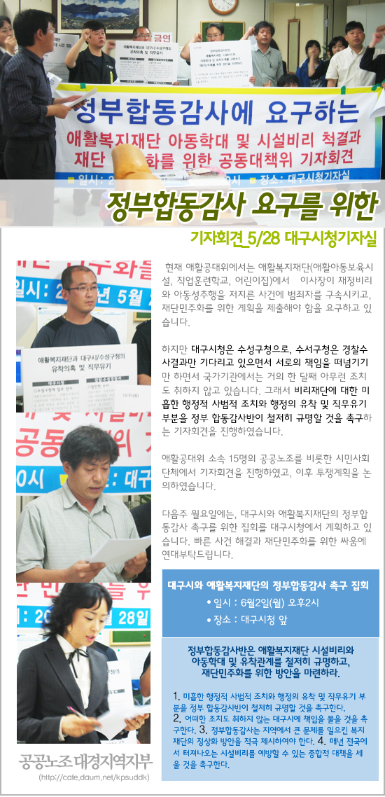 20¿© Áö¿ª½Ã¹Î»çȸ³ëµ¿´Üü·Î ±¸¼ºµÈ '¾ÖȰº¹ÁöÀç´Ü ¾Æµ¿ÇÐ´ë ¹× ½Ã¼³ºñ¸® ô°á°ú Àç´Ü ¹ÎÁÖȸ¦ À§ÇÑ °øµ¿´ëÃ¥À§'(ÀÌÇÏ ¾ÖȰ°ø´ëÀ§)´Â 28ÀÏ ´ë±¸½Ãû ±âÀڽǿ¡¼ ±âÀÚȸ°ßÀ» °®¾ú´Ù. 28ÀϺÎÅÍ 6¿ù13ÀϱîÁö ÁøÇàµÇ´Â ´ë±¸½Ã¿¡ Á¤ºÎÇÕµ¿°¨»ç¿¡¼ ¾ÖȰº¹ÁöÀç´Ü¿¡ ´ëÇÑ °¢Á¾ ºñ¸® ¹× ¾Æµ¿Çд뿡 ´ëÇÑ Ã¶ÀúÇÑ °¨»ç¿Í °ø¹«¿ø°úÀÇ À¯ÂøÀÇȤÀ» ¹àÈú °ÍÀ» Ã˱¸Çß´Ù. ±âÀÚȸ°ß ÀÌÈÄ ¾ÖȰ°ø´ëÀ§´Â ´ë±¸½Ãû 10Ãþ¿¡ À§Ä¡ÇÑ 'Á¤ºÎÇÕµ¿°¨»ç¹Ý'À» ¸é´ã, ¾ÖȰº¹ÁöÀç´Ü¿¡ ´ëÇÑ °¨»ç¸¦ ¿ä±¸ÇÏ¿´´Ù. ¾Æ·¡ ³»¿ëÀº ±âÀÚȸ°ß Àü¹®°ú ±×°£ÀÇ °æ°ú³»¿ëÀÌ´Ù. [±âÀÚȸ°ß¹®] Á¤ºÎÇÕµ¿°¨»ç¹ÝÀº ¾ÖȰº¹ÁöÀç´Ü ½Ã¼³ºñ¸®¿Í ¼ºÃßÇà µî ¾Æµ¿ÇÐ´ë ¹× À¯Âø°ü°è¸¦ öÀúÈ÷ ±Ô¸íÇϰí, Àç´Ü¹ÎÁÖȸ¦ À§ÇÑ ¹æ¾ÈÀ» ¸¶·ÃÇ϶ó ¾ÖȰº¹ÁöÀç´Ü¿¡¼ ¹ß»ýÇÑ ¾Æµ¿ÀαÇÄ§ÇØ¿Í ½Ã¼³ºñ¸®ÀÇ ¹®Á¦°¡ Áö³ 4¿ù 1ÀÏ Àü±¹¹æ¼ÛÀ» ÅëÇØ ¾Ë·ÁÁø Áö ¹ú½á µÎ´ÞÀÌ µÇ¾î °¡°í ÀÖ´Ù. Áö¿ª½Ã¹Î»çȸ³ëµ¿´Üü´Â Áø»ó±Ô¸íÀ» ÅëÇÑ ½Ã¼³ÀÇ ºñ¸®Ã´°á°ú ¾Æµ¿¿¡°Ô ÀÚÇàµÇ¾ú´ø Çд뿡 ´ëÇØ ¾öÁßó¹úÇÒ °Í°ú Àç´ÜÀÇ ¹ÎÁÖȸ¦ À§ÇØ 4¿ù8ÀÏ ¾ÖȰ°ø´ëÀ§¸¦ °á¼ºÇß´Ù. ¾ÖȰ°ø´ëÀ§´Â ´ë±¸½Ã°¡ Ưº°°¨»ç¸¦ Áï°¢ÀûÀ¸·Î ½Ç½ÃÇÒ °ÍÀ» ¿ä±¸ÇßÀ¸³ª ´ë±¸½ÃÀÇ ´ÊÀå´ëÀÀÀ¸·Î ÀÎÇØ °¨»ç¸¦ ½Ã±âÀûÀýÇÏ°Ô ½Ç½ÃÇÏÁö ¸øÇÑ ºÎºÐÀ» ºñÆÇÇÑ ¹Ù ÀÖ´Ù. ÀÌÈÄ ÀÌ »ç°ÇÀº °æÂû¿¡ ÀÇÇØ ¼ö»ç°¡ ÁøÇà ÁßÀ̳ª ¾ÆÁ÷±îÁö ¼ö»ç°á°ú°¡ ¹ßÇ¥µÇÁö ¾Ê°í ÀÖ´Ù. ´ë±¸½Ã¿Í ¼ö¼º±¸Ã»Àº ¿À·ÎÁö ¼ö»ç°á°ú¸¸ ÃÄ´Ùº¼ »Ó Áö±Ý±îÁö Á¦´ë·Î µÈ ÇàÁ¤Á¶Ä¡ Çϳª ÃëÇÏÁö ¾Ê´Â ¹«´ÉÇÑ ¸ð½ÀÀ» ÀϰüµÇ°Ô º¸¿©ÁÖ°í ÀÖ´Â °ÍÀÌ´Ù. µû¶ó¼ ¾ÖȰ°ø´ëÀ§´Â Á¤ºÎÇÕµ¿°¨»ç¹Ý¿¡ ´ÙÀ½°ú °°ÀÌ ¿ä±¸ÇÑ´Ù. ù°, ´ë±¸½ÃÀÇ ºñ¸®Àç´Ü¿¡ ´ëÇÑ ¹ÌÈíÇÑ ÇàÁ¤Àû Á¶Ä¡¿Í À¯Âø ¹× Á÷¹«À¯±â ºÎºÐÀ» Á¤ºÎÇÕµ¿°¨»ç¹ÝÀÌ Ã¶ÀúÈ÷ ±Ô¸íÇÒ °ÍÀ» Ã˱¸ÇÑ´Ù. ºñ·Ï ¼ö»ç ÁßÀÎ »ç°ÇÀ̶ó ÇÏÁö¸¸, À̹ø »ç°ÇÀº ´ëÇ¥ÀÌ»ç ÇÑ¸í¿¡ ´ëÇÑ Ã³¹ú·Î ¸¶¹«¸®µÉ ¼º°ÝÀÇ »ç°ÇÀÌ ¾Æ´Ï´Ù. °ÅÀÇ ºñ½ÁÇÑ ³»¿ëÀÇ ºñ¸®°¡ Áö¼ÓÀûÀ¸·Î ¹ß»ýÇß´Ù´Â °ÍÀº ÇàÁ¤À¯ÂøÀÌ ¾øÀÌ´Â ºÒ°¡´ÉÇÔÀ» ÀǹÌÇÑ´Ù. ±×·¯³ª °æÂû ¼ö»ç¿¡¼´Â ¹Ù·Î ÇàÁ¤°ø¹«¿ø°úÀÇ À¯Âø ¹× Á÷¹«À¯±â ºÎºÐÀÌ ºüÁ®ÀÖ´Ù. ¼ö½Ê³â°£ ½Ã¼³ºñ¸®¿Í ¾Æµ¿¼ºÃßÇàÀ» ÀÚÇàÇÒ ¼ö ÀÖ¾ú´ø ¹è°æÀº ¹Ù·Î °ø¹«¿ø°úÀÇ À¯ÂøÀÌ ÀÖ¾ú±â¿¡ °¡´ÉÇßÀ½À» »ïôµ¿ÀÚµµ ´Ù ¾Æ´Â »ç½Ç·Î, Á¤ºÎÇÕµ¿°¨»ç¹ÝÀº ´ë±¸½Ã¿Í ¼ö¼º±¸Ã»°ú ¾ÖȰº¹ÁöÀç´Ü°£ À¯Âø°ü°è¸¦ öÀúÈ÷ ¹àÈú °ÍÀ» Ã˱¸ÇÑ´Ù. µÑ°, ƯÈ÷ ¾Æµ¿¼ºÃßÇà, Áֺνĺñ µî Á¤ºÎº¸Á¶±Ý Ⱦ·É ±×¸®°í Áö¿ª»çȸ ÈÄ¿ø±Ý Âøº¹±îÁö ¾Æµ¿ÇÐ´ë ¹× ¿î¿µºñ¸®¸¦ ÀúÁö¸¥ ¾ÖȰº¹ÁöÀç´Ü ÀÓ¿ø¿¡ ´ëÇØ Áï°¢ÀûÀ¸·Î ÇØÀÓÀ» ÇÏÁö ¾Ê´Â µî ´ë±¸½ÃÀÇ Á÷¹«À¯±â¸¦ °¨»çÇØ ÁÙ °ÍÀ» ¿ä±¸ÇÑ´Ù. »ç½Ç, À̹ø »ç°ÇÀ» °è±â·Î ´ëÇ¥À̻縦 Æ÷ÇÔ Àç´Ü ÀÌ»çȸ Àüü°¡ Ã¥ÀÓÀ» Áö°í ¹°·¯³µ¾î¾ß Çß´Ù. ¸¸¾à, ±×·¸Áö ¾Ê¾Ò´Ù¸é, ´ë±¸½Ã°¡ Àç´Ü¿¡ ´ëÇÑ Àü¸é°¨»ç¸¦ ½Ç½ÃÇϰí Ã¥ÀÓÀ» ¹°¾î ÇØÀÓ µî Àû±ØÀûÀÎ Á¶Ä¡¸¦ ÃëÇÏ´Â °ÍÀÌ ¿Ã¹Ù¸¥ ÇØ°á¹æ¾ÈÀ̾ú´Ù. ±×·¯³ª ´ë±¸½Ã´Â ÀÌ °°Àº Á¶Ä¡¸¦ ÃëÇÏÁö ¾Ê¾Ò´Ù. ÀÌ¿¡ ´ëÇÑ Ã¥ÀÓÀ» ´ë±¸½Ã¿¡ ¹°À» °ÍÀ» Ã˱¸ÇÑ´Ù. 2005³â ´ë±¸½Ã´Â û¾ÏÀç´Ü ÀαÇÀ¯¸° ¹× ºñ¸®»ç°ÇÀÌ ¹ß»ýÇßÀ» ¶§ Àç´Ü ÀÌ»çȸ¿¡ Ã¥ÀÓÀ» ¹°¾î ÀÌ»ç¿Í °¨»ç¸¦ ÇØÀÓÇÑ »ç·Ê°¡ ÀÖÀ¸³ª, ¾îÂîµÈ ¿µ¹®ÀÎÁö À̹ø »ç°Ç¿¡ ´ëÇØ¼´Â ¼ÕÀ» ³õ°í ÀÖ´Ù. Àç´Ü ÀÌ»çȸ ¹× °¨»ç´Â À̹ø »ç°ÇÀÇ °ø¹üÀÏ ¼ö ¹Û¿¡ ¾øÀ½¿¡µµ ºÒ±¸Çϰí, ´ë±¸½Ã¿Í ¼ö¼º±¸Ã»Àº ÇØÀÓÁ¶Ä¡¸¦ ÃëÇÏÁö ¾ÊÀº ä ÀüÁ÷ ¼ö¼º±¸Ã» »çȸº¹Áö°úÀå, »çȸ»ê¾÷±¹ÀåÀ» Áö³½ ÅðÁ÷°ü·á¸¦ ´ëÇ¥ÀÌ»ç·Î, ±×¸®°í »çȸº¹Áö½Ã¼³ ÇöÀå °æÇèÀÌ Àü¹«ÇÑ »ç¶÷À» ¿øÀåÀ¸·Î ÃëÀÓÇϵµ·Ï ¼ö¼ö¹æ°üÇØ ¿Ô´Ù. »õ ´ëÇ¥ÀÌ»ç ¶ÇÇÑ À̹ø »ç°Ç¿¡ ÀÚÀ¯·Î¿ï ¼ö ¾ø´Â Àι°Àε¥µµ ¸»ÀÌ´Ù. ºÎÁ¤ºÎÆÐ¸¦ ¹æÁ¶ÇÑ Çö ÀÌ»çÁøÀ̳ª ÃÖ±Ù ±³Ã¼µÈ ´ëÇ¥ÀÌ»ç¿Í ¿øÀå µîÀº ¾ÖȰº¹ÁöÀç´ÜÀ» Á¤»óȽÃų ÀûÇÕÇÑ Àι°ÀÌ ¾Æ´ÔÀ» ¿ì¸®´Â ºÐ¸íÈ÷ ÁöÀûÇÑ´Ù. ¼Â°, ½Ã¼³ºñ¸®·Î ¾ó´ªÁø ¾ÖȰº¹ÁöÀç´ÜÀ» Á¶¼ÓÇÑ ½ÃÀϳ»¿¡ Á¤»óȽÃ۱â À§Çؼ´Â Áö¿ª»çȸ¿¡¼ ½Å¸ÁÀ» ¹Þ°í ÀÖ´ÂÀÇ ¹ÎÁÖÀλ糪 ¾ç½ÉÀûÀÎ »çȸº¹ÁöÀü¹®°¡µéÀÌ Âü¿©ÇÏ´Â »õ·Î¿î ÀÌ»çÁøÀ» ±¸¼ºÇÏ´Â ±æ ¸¸ÀÌ À¯ÀÏÇÑ ¹æ¹ýÀÌ´Ù. ÀÌ·¯ÇÑ ¹æ¾ÈÀ» ÅëÇØ ¾ÖȰ