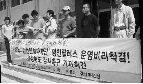 2008³â 6¿ù26ÀÏ, ¿µÃµÆÈ·¹½º ³ëµ¿Á¶ÇÕÀº ¹ýÀΰú ½Ã¼³ÀÇ ÁÖ¸Ô±¸±¸½Ä °æ¿µÀ» ¹Ù·ÎÀâ°í, ºÎÁ¤ºñ¸®¿¡ ¿¬·çµÈ Ã¥ÀÓÀÚ Ã³¹ú ¹× ÇâÈÄ ´ëÃ¥¸¶·Ã°ú Àå¾ÖÀÎÀÇ ÀαÇÀ» Áö۱â À§ÇØ °æ»óºÏµµÀÇ °¨»ç¸¦ ¿ä±¸ÇÏ´Â ±âÀÚȸ°ßÀ» °æºÏµµÃ» º»Ã» ¾Õ¿¡¼ °¡Á³´Ù.