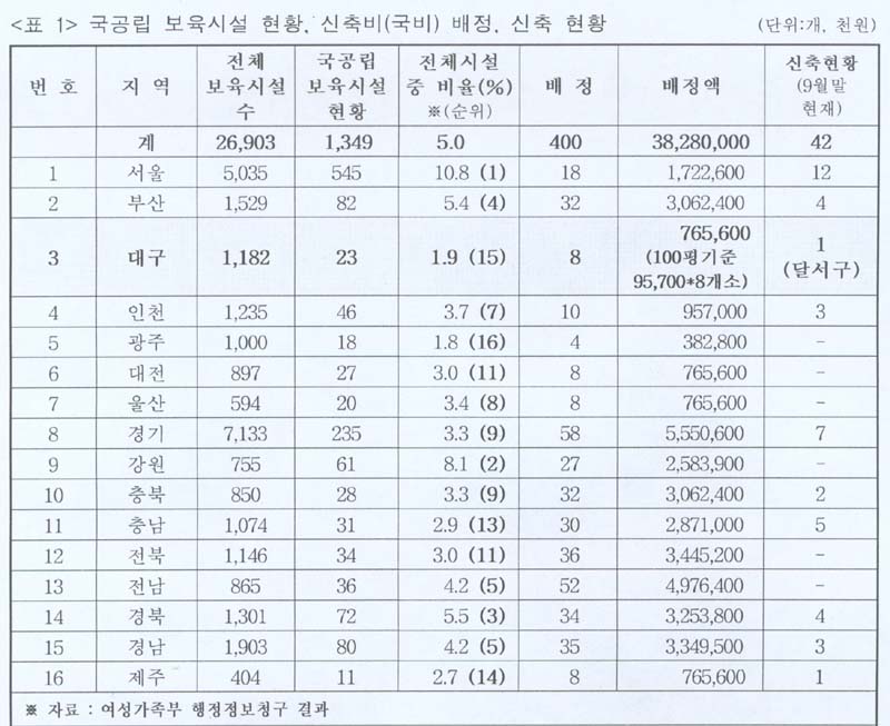 ´ë±¸½Ã Àüü º¸À°½Ã¼³ ´ëºñ ±¹°ø¸³º¸À°½Ã¼³ 1.9%·Î Àü±¹ ÃÖÇÏÀ§±Ç, Àü±¹ Æò±Õ 5%·Î È®´ëÇØ¾ß ÇÑ´Ù ³¯¸þÅÍ, ´ë±¸¿©¼ºÀÇÀüÈ, ´ë±¸¿©¼ºÈ¸, ´ë±¸Âü¿©¿¬´ë, ´ë±¸¿©¼º³ëµ¿ÀÚȸ, ¿ì¸®º¹Áö½Ã¹Î¿¬ÇÕÀÇ 6°³ ´ë±¸Áö¿ª ½Ã¹Î´Üü·Î ±¸¼ºµÈ¡º¾Æµ¿ÀÇ »çȸÀû º¸È£¿Í °ø°ø¼º È®º¸¸¦ À§ÇÑ ³×Æ®¿öÅ©(ÀÌÇÏ ¡®¾Æµ¿³×Æ®¿öÅ©¡¯)¡»´Â º¸À°ÀÇ °ø°ø¼º È®¸³À» À§ÇÑ °¡Àå ÇʼöÀûÀÎ ¿äÀÎÀº ±¹°¡°¡ ¼ÒÀ¯, ÀçÁ¤, ¿î¿µÀ» Àü´ãÇÏ´Â Áï, °ø°ø±â°üÈ µÈ º¸À°½Ã¼³ÀÇ È®´ë¶ó´Â ½½·Î°Ç ¾Æ·¡, 7ÀÏ ±¹°ø¸³º¸À°½Ã¼³È®Ãæ ¿îµ¿À» Àü°³ÇÒ °ÍÀ» ¼±¾ðÇß´Ù. ¶ÇÇÑ ¾Æµ¿³×Æ®¿öÅ©´Â 7ÀÏ ¼º¸íÀ» ÅëÇØ ¿©¼º°¡Á·ºÎ ¹× ´ë±¸½Ã¿¡ ±¹°ø¸³º¸À°½Ã¼³È®Ãæ¿¡ ´ëÇÑ °ø°³ÁúÀǸ¦ ½ÃÀÛÀ¸·Î ´ë±¸±¤¿ª½ÃÀÇȸ¿Í ´ë±¸½Ã ¿©¼ºÁ¤Ã¥°ú¿ÍÀÇ ³»³âµµ ¿¹»êÈ®º¸¿Í ÇâÈÄ È®Ãæ°èȹ¿¡ ´ëÇØ °£´ãȸ °³ÃÖ, ³ª¾Æ°¡ ´ë±¸½ÃÀÇ º¸À°¹ßÀü°èȹ¿¡ ´ëÇÑ ¸ð´ÏÅÍ, º¸À°Á¤Ã¥À§¿øÈ¸¿¡ ´ëÇÑ ¸ð´ÏÅÍ, ±¹°ø¸³º¸À°½Ã¼³È®ÃæÀ» À§ÇÑ ´ç»çÀÚ Á¶Á÷ ¹× ¼¸í¿îµ¿ µî Áö¼ÓÀûÀ¸·Î ±¹°ø¸³º¸À°½Ã¼³È®Ãæ¿îµ¿À» ÆîÃijª°¥ °ÍÀ» ¹àÇû´Ù. ¿©¼º°¡Á·ºÎ´Â 05³âºÎÅÍ 08³â±îÁö ¿¬°£ 400°³¼Ò¾¿ ±¹°ø¸³º¸À°½Ã¼³À» È®ÃæÇÏ¿©, ±¹°ø¸³º¸À°½Ã¼³ ºñÀ²À» 10%(2,949°³)±îÁö ²ø¾î¿Ã¸®°Ú´Ù´Â Á¤Ã¥À» ¼ö¸³Çß´Ù. ±×·¯³ª 9¿ù¸» ±âÁØ, ½ÅÃà»óȲÀº Àü±¹ÀûÀ¸·Î ¿ÃÇØ ½ÅÃà¸ñÇ¥ 400°³¼Ò Áß °íÀÛ 42°³¼Ò(9¿ù¸» ±âÁØ, ¸ñÇ¥ÀÇ 10.5%)¸¸ÀÌ ½ÅÃàµÇ°í ÀÖ°í, ´ë±¸½ÃÀÇ °æ¿ì ¹èÁ¤¹ÞÀº 8°³¼Ò Áß ´Þ¼±¸¿¡¸¸ 1°³¼Ò°¡ ½ÅÃàµÇ°í ÀÖ´Â °ÍÀ¸·Î µå·¯³µ´Ù. ´õ¿íÀÌ ÀÌ·¯ÇÑ °á°ú·Î ÀÎÇØ ÃÖ±Ù ¹ßÇ¥µÈ ¿©¼º°¡Á·ºÎ 2006³â ¿¹»ê¾È¿¡´Â ±¹°ø¸³º¸À°½Ã¼³ ½ÅÃà ¿¹»êÀÌ ¿ÃÇØ´ëºñ 60.7% ´ëÆø »è°¨, 300°³¼Ò°¡ Ãà¼ÒµÈ 100°³¼Ò¿¡ ÇØ´çÇÏ´Â ¿¹»ê¸¸ÀÌ Ã¥Á¤µÇ¾ú´Ù. ÀÌ¿¡ ¡®¾Æµ¿³×Æ®¿öÅ©¡¯´Â ±¹°ø¸³º¸À°½Ã¼³ È®ÃæÀ̶ó´Â Çã¿ï ÁÁÀº ¸íºÐ¾Æ·¡ ÀçÁ¤ºÎ´ãÀº ±âÃÊ´Üü¿¡ ¶°³Ñ±èÀ¸·Î½á »ç¾÷ÃßÁø ½ÇÀûÀÌ ¹ÌÁøÇϰí ÇâÈÄ °èȹµµ ºÒÅõ¸íÇÒ ¼ö ¹Û¿¡ ¾ø´Ù°í Æò°¡Çß´Ù. ÇÑÆí, ¾Æµ¿³×Æ®¿öÅ©´Â Áö³ 9¿ùºÎÅÍ 2°³¿ù µ¿¾È ¿©¼º°¡Á·ºÎ¿Í ´ë±¸½Ã¸¦ »ó´ë·ÎÇÑ ÇàÁ¤Á¤º¸Ã»±¸, ÀüÈÀÎÅͺ並 ÅëÇØ¼ Á¤Ã¥ ÃßÁøÇöȲÀ» Á¶»çÇß´Ù. ¾Æµ¿³×Æ®¿öÅ©´Â °ÇÃàºñ ºÎ´ãÀ» ±¹°í 40%, ½Ãºñ30%, ±¸¤ý±ººñ 30%·Î ÇÒ´çÇØ Áß¾ÓÁ¤ºÎ¿Í ´ë±¸½ÃÀÇ ºÎ´ãÀº ÃÖ¼ÒÈÇÏ°í °ÇÃàºñ¸¦ Æ÷ÇÔÇÑ ³ª¸ÓÁö ¸ðµç ÀÚ±Ý(ÅäÁö¸ÅÀÔºñ, °ÇÃàºñ, Ãß°¡¼Ò¿äºñ¿ë µî)À» ±âÃÊ´ÜüÀÇ Ã¥ÀÓÀ¸·Î ¶°³Ñ±â°Ô µÊÀ¸·Î½á, Á¤Ã¥½ÇÆÐÀÇ ¿äÀÎÀ¸·Î ¹ß»ýÇß´Ù°í ºÐ¼®Çß´Ù. ±¹°ø¸³º¸À°½Ã¼³ 1°³¼Ò ½ÅÃà ÃÑ ¿¹»êÀ» Æò±Õ 10¾ï Á¤µµ·Î º¼ ¶§, ÅξøÀÌ ³·Àº ±¹ºñ¿Í ½Ãºñ·Î ÀÎÇØ ÀçÁ¤ÀÚ¸³µµ°¡ ³·Àº ±âÃÊ´Üü´Â ÀÇÁö°¡ ÀÖ´ÙÇÏ´õ¶óµµ ½ÇÇö °¡´É¼ºÀº Èñ¹ÚÇÒ ¼ö ¹Û¿¡ ¾ø´Ù°í µ¡ºÙ¿´´Ù. ¶ÇÇÑ ±¹°ø¸³º¸À°½Ã¼³ ¼³Ä¡ ºñÀ² Àü±¹Æò±Õ(16°³ ±¤¿ª½Ãµµ) 5.0%¿¡µµ ¹ÌÄ¡Áö ¸øÇÏ´Â 1.9%(ÀüÀü±¹¿¡¼ 15À§)¿¡ ¸Ó¹°·¯ ÀÖ´Â ´ë±¸½ÃÀÇ Ã¥ÀÓµµ ÁöÀûÇϸé¼, ¿©¼º°¡Á·ºÎ¿Í ´ë±¸½Ã¸¦ »ó´ë·ÎÇÑ Á¤Ã¥¿ä±¸¾ÈÀ» ¹ßÇ¥Çß´Ù. ¾Æµ¿³×Æ®¿öÅ©´Â ¿©¼º°¡Á·ºÎ¿¡ ±¸¡¤±ºÀÇ ¿¹»ê ºÎ´ãÀ» ¿ÏȽÃ۱â À§ÇÏ¿© °ÇÃàºñ Àü¾×À» ±¹°¡¿¡¼ ºÎ´ãÇÏ°í ½Ãµµ¿¡¼´Â ºÎÁö¸¦ ¸¶·ÃÇϴµ¥ ÀÏÁ¤ºñÀ² Áö¿ø ÇÒ ¼ö ÀÖµµ·Ï ¹æ¾ÈÀ» ¸¶·ÃÇÒ °Í°ú ±¹°íÁö¿ø ºñÀ², Áö¿ø´Ü°¡¸¦ È®´ëÇÒ °ÍÀ» ¿ä±¸Çß´Ù. ´ë±¸½Ã¸¦ »ó´ë·Î ÇØ¼´Â ±¹°ø¸³º¸À°½Ã¼³ ¼³Ä¡ ºñÀ²À» ÃÖ¼ÒÇÑ Àü±¹ Æò±Õ 5.0%·Î ²ø¾î ¿Ã¸®µµ·Ï ´ëÃ¥À» ¸¶·ÃÇÒ °ÍÀ» ¿ä±¸Çß´Ù. ƯÈ÷, ¡®º¸À°¹ßÀü 4°³³â °èȹ¡¯¿¡ µû¶ó 08³â±îÁö 16°³¼Ò ½ÅÃà¿¡ ´ëÇÑ ±¸Ã¼ÀûÀÎ ½ÃÇà°èȹ, ÀçÁ¤ÀÚ¸³µµ°¡ ³·Àº ±¸¡¤±º¿¡ ´ëÇÑ ±¸Ã¼ÀûÀÎ Áö¿ø¹æ¾È, ±¹°ø¸³º¸À°½Ã¼³È®Ãæ ½Ã ¿µ¾Æ ¹× Àå¾Ö¾ÆÀü´ã º¸À°½Ã¼³À» ÀÏÁ¤ºñÀ² ¹èÄ¡ÇÒ °ÍÀ» °Á¶Çß´Ù. |