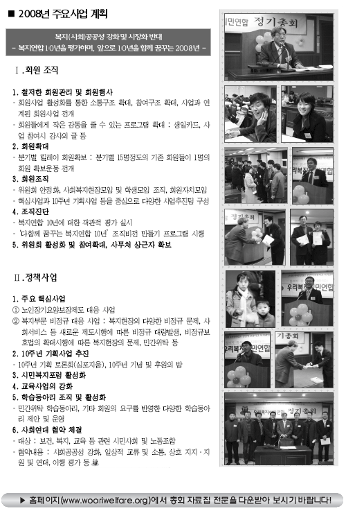 [10Áֳ⠱â³ä ÈÄ¿øÀÇ ¹ã] À̾î 11¿ù18ÀÏ(È)¿¡´Â ¿ì¸®º¹Áö½Ã¹Î¿¬ÇÕ 10Áֳ⠱â³ä ÈÄ¿øÀÇ ¹ãÀÌ ¼º´ëÇÏ°Ô °³ÃÖµÉ ¿¹Á¤ÀÌ´Ù. 10ÁÖ³â Çà»ç¸¦ ÃàÇÏÇϱâ À§ÇØ ¸¶·ÃµÈ ÈÄ¿øÀǹ㿡´Â ȸ¿ø »Ó ¾Æ´Ï¶ó ±×µ¿¾È ¿ì¸®º¹Áö½Ã¹Î¿¬ÇÕÀ» ¾ÖÁ¤À¸·Î ÁöÄѺÁ ¿Â ´Ù¾çÇÑ ºÐµéÀ» ÃÊ´ëÇÑ´Ù. ÈÄ¿øÀÇ ¹ã¿¡ ¼±º¸ÀÏ 10ÁÖ³â ÀÚ·áÁýÀº ¡®º¹Áö±ÇÀÇ È®´ë¿Í ÀαÇÀÇ È®À塯, ¡®ºó°ï°ú Â÷º°, ±×¸®°í ¼Ò¿Ü¿¡ ´ëÇÑ »çȸÀÇÁ¦È¡¯, ¡®»çȸº¹Áö°ø°ø¼º ¾àÈ¿Í »çÀ¯È¤ý½ÃÀåÈ¿¡ ´ëÇÑ ÀúÇס¯ÇÑ º¹Áö±âº»±Ç È®º¸¿îµ¿ »Ó ¾Æ´Ï¶ó ¿ì¸®º¹Áö½Ã¹Î¿¬ÇÕ Ã¢¸³ ÀÌÀüÀÇ ¿ª»ç, ±×¸®°í Á¤»ç¿Í´Â ´Þ¸® ¾ß»ç¿¡ °¡±î¿î ´Ù¾çÇÑ µÞ À̾߱⠵îÀ» ´ãÀ» ¿¹Á¤ÀÌ´Ù. ±×¸®°í ¿Ã 12¿ùÀ̳ª ³»³â 1¿ù ÁßÀ¸·Î ºÏÇÑÀÇ °³¼ºÀ» ȸ¿øµé°ú ޹æÇÏ´Â ÀÚ¸®µµ °èȹ ÁßÀ̸ç, 9¿ù Á¤±â¿î¿µÀ§¿¡¼ ÃÖÁ¾ °áÁ¤ÇÒ ¿¹Á¤ÀÌ´Ù. ÇöÀç ¿ì¸®º¹Áö½Ã¹Î¿¬ÇÕÀº 10Áֳ⠻ç¾÷À» ¿øÈ°ÇÏ°Ô ÃßÁøÇϱâ À§ÇØ ¿ìº´°É Á¶Á÷±âȹÀ§¿øÀåÀ» ÃßÁøÀ§¿øÀåÀ¸·Î ÇØ¼ °¢ Ȱµ¿±â±¸ À§¿ø, º¹ÁöÇöÀå µî 20¿©¸íÀÇ ÃßÁøÀ§¿øÀ» ±¸¼ºÇßÀ¸¸ç, »êÇÏ ¡®Á¶Á÷ºñÀüÆÀ¡¯À» ¼³Ä¡ÇÏ¿© ¡®Á¶Á÷ºñÀü¸¸µé±â ȸ¿ø¿öÅ©¼¥¡¯°ú ¡®È¸¿ø¼³¹®Á¶»ç¡¯¸¦ ÀÏÂ÷ÀûÀ¸·Î ÁøÇà½Ã۰í ÀÖ´Ù. Á¶Á÷ºñÀüÆÀÀº ÀÎÅͳÝÀ¸·Î ¼³¹®Á¶»ç¸¦ ÇÏ´Ùº¸´Ï ȸ¿øµéÀÇ Àû±ØÀûÀÎ Âü¿©°¡ ¹«¾ùº¸´Ùµµ ÇÊ¿äÇÏ´Ù°í ´çºÎÇß´Ù. ¿ìº´°É ÃßÁøÀ§¿øÀåÀº ¡°È¸¿øµéÀÇ °¨¼º¿¡ ±³°¨ÇÏ°í °ø°¨À» À̲ø¾î³»±â À§ÇØ È¸¿øµéÀÌ Âü¿©ÇÏ´Â °úÁ¤ÀÌ ¹«¾ùº¸´Ùµµ Áß¿äÇÏ´Ù¡±¸ç ¡°À̸¦ ÅëÇØ ÇÑ´Ü°è ¼º¼÷ÇÑ ¿ì¸®º¹Áö½Ã¹Î¿¬ÇÕÀÌ µÉ ¼ö ÀÖÀ» °Í¡±À̶ó°í ¸»Çß´Ù. ÇÑÆí, ¿ì¸®º¹Áö½Ã¹Î¿¬ÇÕÀº 10Áֳ⠻ç¾÷°ú °ü·Ã Á¶Á÷ºñÀü¸¸µé±â ȸ¿ø¿öÅ©¼¥¿¡ 1¹é¸¸¿ø, ½ÉÆ÷Áö¾ö¿¡ 2¹é¸¸¿ø, ÀÚ·áÆíÂù¿¡ 4¹é¸¸¿ø, Çà»ç°ü·Ã 4¹é¸¸¿ø µî 1õ1¹é¸¸¿øÀÇ ¿¹»êÀ» È®Á¤ÇÏ°í ±âÈ®º¸µÈ ¿¹»ê 5¹é¸¸¿ø¿ÜÀÇ Ãß°¡ ¿¹»ê È®º¸¿¡ ÃÑ·ÂÀ» ±â¿ïÀ̱â·Î Çß´Ù. ¿ì¸®º¹Áö½Ã¹Î¿¬ÇÕÀº Á¤ºÎÀÇ ÀçÁ¤Áö¿øÀ» ÀüÇô ¹ÞÁö ¾ÊÀ¸¸ç, ȸ¿øµéÀÌ ³³ºÎÇϴ ȸºñ¿Í ÈÄ¿ø±ÝÀ¸·Î¸¸ Áö±Ý²¯ ¿î¿µÇØ ¿Ô´Ù.