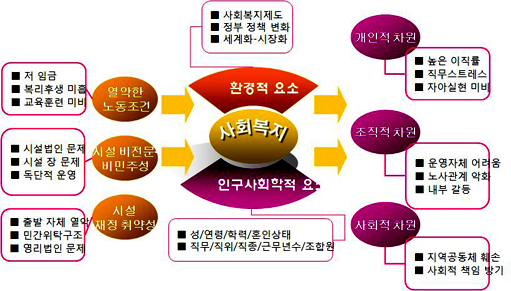 ÀϹÝÀûÀ¸·Î »çȸº¹Áö½Ã¼³ÀÇ ÁÖ¿ä ¹®Á¦Á¡Àº [±×¸² 1]¿¡¼ ¾Ë ¼ö ÀÖµíÀÌ, ¡â¿¾ÇÇÑ ³ëµ¿Á¶°Ç(ÀúÀÓ±Ý, º¹ÁöÈÄ»ý ¹× ±³À°ÈÆ·Ã ¹Ìºñ), ¡â½Ã¼³ ¿î¿µÀÇ ºñÀü¹®¼º ¹× ºñ¹ÎÁÖ¼º(½Ã¼³¹ýÀÎ, ½Ã¼³Àå ¹®Á¦), ¡âÀçÁ¤ Ãë¾à¼º(¹Î°£À§Å¹±¸Á¶, ¿µ¸®¹ýÀÎ, ±¸Á¶Àû ¿¾Ç¼º)ÀÇ 3°¡Áö¸¦ ²ÅÀ» ¼ö ÀÖ´Ù.