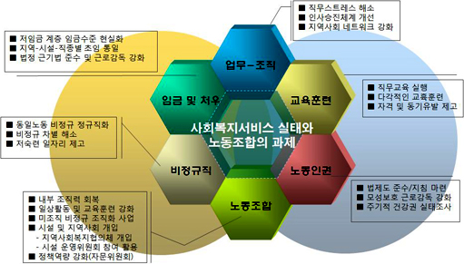 [±×¸² 2]¿¡¼ Á¦½ÃµÈ ÇÊÀÚÀÇ ´ë¾Èµµ º°¹Ý Â÷À̰¡ ¾ø´Ù. ÁÖ·Î »çȸº¹Áö ³ëµ¿ÀÚµéÀÇ ¡âó¿ì°³¼± ¡â¾÷¹«-Á¶Á÷ °³¼± ¡â±³À°ÈÆ·Ã ¡â³ëµ¿À뱂 µîÀÌ´Ù. ±×·¸´Ù¸é ÀÌÁ¦´Â Á¶±Ý ´õ ÁøÀüµÈ ´ë¾ÈÀÌ ÇÊ¿äÇÑ °ÍÀº ¾Æ´Ò±î? ÀÌÁ¦´Â ºñÆÇº¸´Ù ±¸Ã¼ÀûÀÎ ÇØ°á¹æ¾È°ú ´ë¾ÈÀ» ÇÔ²² °í¹ÎÇÒ ½Ã±âÀÎ °Í °°´Ù. ±× ÇØ°áÀÇ ÁÖü´Â Àü¹®°¡ Áý´ÜÀÌµç ³ëÁ¶µç »çȸº¹Áö ÇöÀåÀÇ ¿À·£ ¼÷¿øÀ» Ç® ¼ö ÀÖ´Â Á¶Á÷À̰ÚÁö¸¸, ³ëµ¿Á¶ÇÕÀÌ ´Ù ³ªÀº ¹Ì·¡¸¦ ´ãº¸ÇÒ ¼ö ÀÖ´Â Á¶Á÷À̶ó´Â Á¡Àº ¼±¸ÀÇ ¿ª»çÀû °æÇè¿¡¼ ±× ´äÀ» ¾Ë·ÁÁÖ¾ú´Ù.