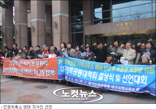 ÇàÁ¤¾ÈÀüºÎÀÇ ±¹°¡ÀαÇÀ§ Á¶Á÷ Ãà¼Ò¿Í Áö¿ª»ç¹«¼Ò Æó¼â¿¡ ¹Ý¹ß, ´ë±¸Áö¿ª 36°³ ½Ã¹Î»çȸ´Üüµéµµ Áö³ 5ÀÏ ±¹°¡ÀαÇÀ§ ´ë±¸»ç¹«¼Ò ¾Õ¿¡¼ ±âÀÚȸ°ßÀ» °®°í ¡®±¹°¡ÀαÇÀ§ Áö¿ª»ç¹«¼Ò Æó¼â ¹Ý´ë ¹× µ¶¸³¼º º¸ÀåÀ» À§ÇÑ °øµ¿´ëÃ¥À§¡¯ °á¼º½Ä°ú Çаè, Á¾±³°è µî 634¸íÀÌ Âü¿©ÇÏ´Â ¼±¾ð´ëȸ¸¦ °¡Á³´Ù.
