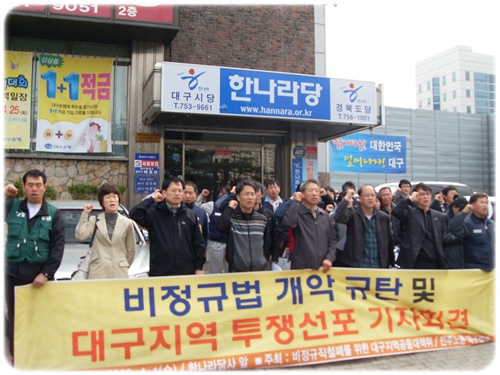 ¿ì¸®º¹Áö½Ã¹Î¿¬ÇÕ µî ´ë±¸Áö¿ª ½Ã¹Î»çȸ³ëµ¿´Üü·Î ±¸¼ºµÈ ºñÁ¤±ÔÁ÷ öÆó¸¦ À§ÇÑ ´ë±¸Áö¿ª °øµ¿´ëÃ¥À§(ÀÌÇÏ ºñÁ¤±Ô´ë±¸°ø´ëÀ§)´Â ¹ÎÁÖ³ëÃѴ뱸Áö¿ªº»ºÎ¿Í °øµ¿À¸·Î 'ºñÁ¤±Ô¹ý °³¾Ç °Çà ±Ôź ¹× ´ë±¸Áö¿ª ºñÁ¤±ÔÅõÀï ¼±Æ÷' °øµ¿±âÀÚȸ°ßÀ» 4¿ù1ÀÏ Çѳª¶ó´ç ´ë±¸½Ã´ç ¾Õ¿¡¼ °³ÃÖÇß´Ù.