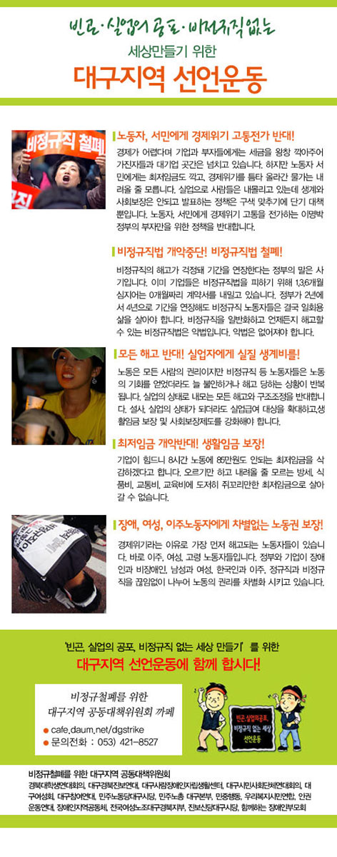 ºó°ï, ½Ç¾÷ÀÇ °øÆ÷, ºñÁ¤±ÔÁ÷ ¾ø´Â ¼¼»ó¸¸µé±â ´ë±¸Áö¿ª ¼±¾ð¿îµ¿ ½ÃÀÛ2009.04.09 ±Û¾´ÀÌ : º¹Áö¿¬ÇÕ |