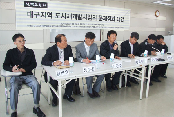 À̳¯ Åä·Ðȸ´Â µµ½Ã Àç°³¹ß »ç¾÷ÀÇ ¹®Á¦Á¡À» »ìÆìº¸°í, ÅäÁö °ø°ø¼º Ãø¸é¿¡¼ Àç°³¹ß »ç¾÷ÀÇ ¿Ã¹Ù¸¥ ¹æÇâÀ» ¸ð»öÇϱâ À§ÇØ <´ë±¸½Ã¹Î´Üü¿¬´ëȸÀÇ>¿Í <¿ë»êÂü»ç ´ë±¸°æºÏ´ëåȸÀÇ>°¡ ¿¾ú´Ù. µÎ ´Üü ȸ¿øÀ» ºñ·ÔÇÑ ½Ã¹Î 60¿©¸íÀÌ Âü¼®ÇÑ °¡¿îµ¥ '¿ì¸®º¹Áö½Ã¹Î¿¬ÇÕ' ÀºÀç½Ä »ç¹«Ã³ÀåÀÇ »çȸ·Î, ±è¼öÇö ±³¼ö¿Í 'ÁְűǽÇÇöÀ» À§ÇÑ ´ë±¸¿¬ÇÕ' ÃÖº´¿ì »ç¹«±¹ÀåÀÌ ¹ßÁ¦Çß´Ù.