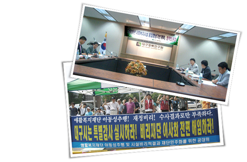 ´ÜÁö Â÷ÀÌÁ¡Àº »çȸº¹Áö½Ã¼³ ±âº»°èȹÀÇ °æ¿ì, ¿ì¸®º¹Áö½Ã¹Î¿¬ÇÕ µî Áö¿ªÀÇ Á¦½Ã¹Î»çȸ´ÜüµéÀÌ ½Ã¼³ºñ¸®ÀÇ ¿¹¹æ°ú Åõ¸í¼º È®º¸¸¦ À§ÇØ Áö¼ÓÀûÀ¸·Î ´ë±¸½Ã¿¡ ¿ä±¸ÇÑ °á°ú ´ë±¸½Ã°¡ ¹Þ¾Æµé¿© ±âº»°èȹÀ» ¼ö¸³ÇÑ Ãø¸éÀÌ °ÇÑ ¹Ý¸é À뱂 ¹× ÀÚ¸³»ýȰ ¿å±¸Á¶»ç´Â 2008³â ±¹Á¤°¨»ç¿¡¼ ÁöÀûµÈ Àå¾ÖÀλýȰ½Ã¼³ ³» ºñÁ¤»óÀûÀ¸·Î ³ôÀº ¾Æµ¿»ç¸Á·ü(ÀϹݾƵ¿ÀÇ 28¹è)°ú »ýȰ½Ã¼³³»ÀÇ °ú´Ù¾à¹°º¹¿ë ¹× ÀαÇÄ§ÇØ»ç·Ê°¡ Ã˹ߵǾî Àü±¹ÀûÀ¸·Î ½Ç½ÃµÈ Á¡ÀÌ´Ù. ÀÌ·¯ÇÑ º¯È¿¡µµ ºÒ±¸ÇÏ°í ¾ÖȰº¹ÁöÀç´Ü ÀαÇÄ§ÇØ ¹× ºñ¸®»ç°ÇÀº ÇØ°áÀÇ ½Ç¸¶¸®¸¦ ãÁö ¸øÇÑ Ã¤ ¾ç½É¼±¾ðÀ» ÅëÇØ ºñ¸®¸¦ °í¹ßÇÑ »çȸº¹Áö»çµéÀÌ 1³â ³Ñ°Ô ÇØ°íÀÚ º¹Á÷°ú °øÀÍÀÌ»çȸ ±¸¼º µîÀ» ¿ä±¸ÇÏ¸ç ½ÃÀ§¸¦ Çϰí ÀÖ´Ù. ´ë±¸½Ã´Â Áö±Ý±îÁö 1½ÉÆÇ°á(7¿ù24ÀÏ)À» º¸°í ´ë±¸½Ã ÀÚü °¨»ç°á°ú¸¦ °ø°³ÇÏ´Â µî º¸´Ù Àû±ØÀûÀ¸·Î ¹®Á¦¸¦ ÇØ°áÇϰڴٴ ÀÇÁö¸¦ ¿©·¯ ¹ø õ¸íÇßÀ¸³ª, ±× ¾à¼ÓÀ» Áöų Áö ¿©ºÎ´Â ¿©ÀüÈ÷ ºÒÅõ¸íÇÏ´Ù. ÇöÀç ¹úÀÌÁö°í ÀÖ´Â ½Ã¼³¹®Á¦¿¡ ´ëÇØ¼ ¼Ó¼ö¹«Ã¥ÀÎ ´ë±¸½Ã°¡ ½Ã¼³Á¤Ã¥À» Àüȯ½ÃŰ±â¿¡´Â ¿©ÀüÈ÷ ¿ªºÎÁ·ÀÌ´Ù. ´ë±¸½Ã Áö¿ª»çȸ Áß½ÉÀÇ Å»½Ã¼³ Á¤Ã¥ÀÇÁö´Â?