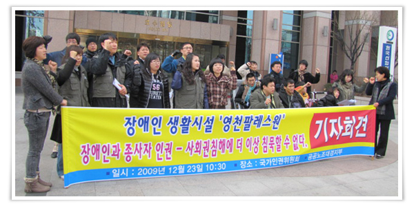 Àü±¹°ø°ø¼ºñ½º³ëµ¿Á¶ÇÕ ´ë°æÁö¿ªº»ºÎ¿Í ½Ã¹Î»çȸ´ÜüµéÀº 12¿ù23ÀÏ(¼ö) ¿ÀÀü10½Ã30ºÐ ±¹°¡ÀαÇÀ§¿øÈ¸ ´ë±¸»ç¹«¼Ò ¾Õ¿¡¼ ±âÀÚȸ°ßÀ» ¿°í »çȸº¹Áö¹ýÀÎ CÀç´Ü »êÇÏ Àå¾ÖÀÎ »ýȰ½Ã¼³(°æºÏ ¿µÃµ)ÀÇ »ýȰÀÎ ¹× Á¾»çÀڵ鿡 ´ëÇÑ ÀαÇÄ§ÇØ¸¦ ±ÔźÇϰí ÀαÇÀ§¿¡ ÁøÁ¤¼¸¦ Á¢¼öÇß´Ù.