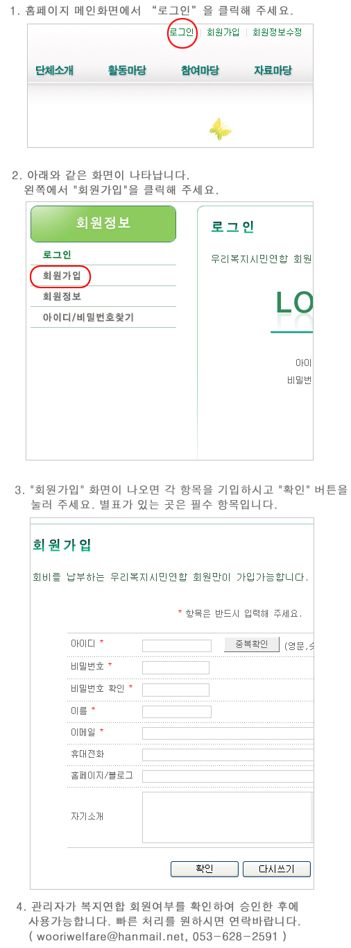 ¿ì¸®º¹Áö½Ã¹Î¿¬ÇÕ È¨ÆäÀÌÁö¿¡ ·Î±×ÀÎÀ» Ŭ¸¯ÇÑ ÈÄ "ȸ¿ø°¡ÀÔ"ÇÏ¿© ¾ÆÀ̵ð¿Í ºñ¹Ð¹øÈ£¸¦ »ý¼ºÇÏ¼Å¾ß ÇÕ´Ï´Ù. [Áß¿ä»çÇ×] - "ȨÆäÀÌÁö ȸ¿ø°¡ÀÔ"ÀÌ È¸ºñ¸¦ ³³ºÎÇÏ´Â ´Üü¿¡ °¡ÀÔÇÏ´Â °Í°ú È¥µ¿µÉ ¼ö ÀÖÀ¸¹Ç·Î ¾Æ·¡ ¼³¸í¿¡ µû¶ó Áֽñ⠹ٶø´Ï´Ù.