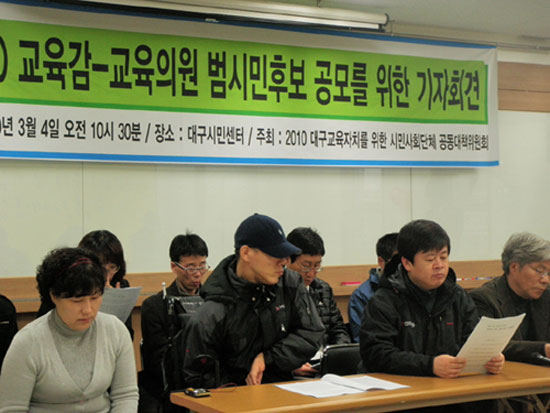2010³â 6¿ù 2ÀÏ Áö¹æÀÚÄ¡¼±°Å´Â ¿ª»ç»ó óÀ½À¸·Î ±³À°°¨°ú ±³À°ÀÇ¿øµµ ÁÖ¹ÎÁ÷¼±À¸·Î µ¿½Ã¼±°ÅÇÕ´Ï´Ù. ÀÌ¿¡ ´ë±¸Áö¿ª 76°³ ´Üü·Î ±¸¼ºµÈ ¡®2010 ´ë±¸ ±³À°ÀÚÄ¡¸¦ À§ÇÑ ½Ã¹Î»çȸ´Üü °øµ¿´ëÃ¥À§¡¯¿¡¼´Â »ç±³À°․°æÀï±³À° ¹Ý´ë, ±³À° ºÒÆòµî ÇØ¼Ò, ±³À° °ø°ø¼º °ÈÀÇ ±âº»¹æÇâ¿¡¼ ¾Æ·¡ÀÇ Á¤Ã¥À» ½ÇÇöÇÒ ¹ü½Ã¹Î È常¦ °ø¸ðÇÕ´Ï´Ù.