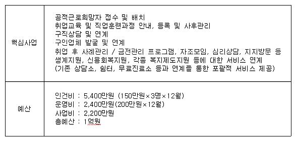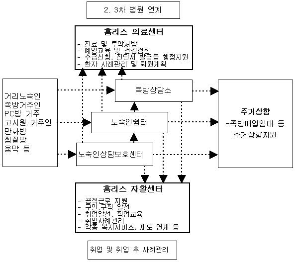 ÇöÀç ³ë¼÷Àλó´ãº¸È£¼¾ÅÍ, ½°ÅÍ, Âʹæ»ó´ã¼Ò µîÀ» ÀÌ¿ëÇÏ´Â ³ë¼÷ÀÎ, Âʹæ°ÅÁÖÀεé Áß ÀϺδ ½ÇÁ÷À¸·Î ÀÎÇÑ ³ë¼÷À§ÇèÀ» ¿¹¹æÇϱâ À§ÇØ, ȤÀº ³ë¼÷»óȲÀ» Å»ÇÇÇϱâ À§ÇÑ ÀÀ±Þ ¹æÆíÀ¸·Î °ø°ø±Ù·Î, Ưº°ÀÚȰ±Ù·Î µîÀÇ °øÀû ÀÏÀÚ¸®¿¡ ¿ì¼±¹èÄ¡¸¦ ¹Þ¾Æ ÀÏÀ» Çϰí ÀÖ´Ù. ÀÀ±Þó¹æ ¼º°ÝÀÇ ÀÏÀÚ¸®ÀÌÁö¸¸ ´Ü±âÀûÀ¸·Î³ª¸¶ ¸Å¿ì À¯¿ëÇÏ°Ô ÀÌ¿ëµÇ°í ÀÖ´Ù. ±×·¯³ª ±×³ª¸¶µµ Á¤ºÎ¿¹»ê, °¢ ±¸Ã»º° ÇÒ´çÀοøÀÇ Â÷ÀÌ µîÀ¸·Î ÀÎÇØ¼ ±× ÀοøÀ̳ª Á¦°ø½Ã±â°¡ ¸Å¿ì Á¦ÇÑÀûÀÌ´Ù. À̵éÀÇ º¸´Ù ±Ùº»ÀûÀÎ ÀÚȰÀ» À§Çؼ´Â °øÀû ÀÏÀÚ¸®¸¦ ÅëÇØ ÃÖ¼ÒÇÑÀÇ °æÁ¦Àû À§±â¸¦ ±Øº¹ÇÑ ÀÌ ÈÄ, Àå±âÀûÀÎ Á÷¾÷¾ÈÁ¤À» À§ÇÑ Á÷¾÷±³À°, Ãë¾÷Áö¿ø µîÀÇ ¼ºñ½º°¡ º´ÇàµÇ¾î¾ß Çϸç, À̸¦ À§Çؼ´Â ÇöÀç °¢ ±â°üµéÀÌ ¸Ã°í ÀÖ´Â Ãë¾÷ÇÁ·Î±×·¥ ¼öÁØ È¤Àº ´ÜÀ§»ç¾÷ ¼öÁØÀÇ ¾÷¹«µéÀ» ÃѰýÇØ¼ ³ë¼÷ÀÎÀÚȰÀ» À§ÇÑ Àü¹®ÀûÀÎ ±â°üÀÌ ÇÊ¿äÇÏ´Ù. ±âÁ¸ÀÇ Âʹæ»ó´ã¼Ò, ³ë¼÷Àλó´ãº¸È£¼¾ÅÍ, ½°ÅÍ µîÀº »ó´ã, »çÁ¤À» ÅëÇØ Ãë¾÷¿å±¸°¡ ÀÖ´Â À̵éÀ» Ȩ¸®½ºÀÚȰ¼¾ÅÍ¿Í ¿¬°èÇÔÀ¸·Î½á, º¸´Ù Àü¹®ÀûÀ̰í ÁýÁßÀûÀ¸·Î À̵鿡°Ô Ãë¾÷¿¡ ´ëÇÑ ¼ºñ½º¸¦ Á¦°øÇÒ Çʿ䰡 ÀÖ´Ù.
