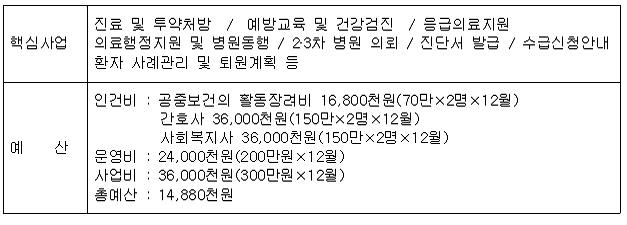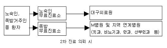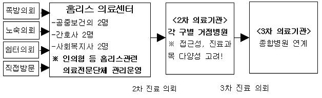 ¡à ³ë¼÷ÀÎ ÀǷἺñ½º Á¦°øÀ» À§ÇÑ ¡¸È¨¸®½º ÀÇ·á¼¾ÅÍ¡¹ ¼³Ä¡․¿î¿µ ÇöÀç ´ë±¸½Ã¿¡´Â Ȩ¸®½ºµéÀ» À§ÇÑ ¹«·áÁø·á¼Ò°¡ µÎ °÷¿¡ ¼³Ä¡µÇ¾î ¿î¿µµÇ°í ÀÖ´Ù. ´ë±¸Âʹæ»ó´ã¼Ò¿¡¼ ¿î¿µ ÁßÀÎ Âʹ湫·áÁø·á¼Ò(´ë±¸ ºÏ±¸ ³ë¿øµ¿ Mº´¿ø ³» ¼³Ä¡)¿Í ³ë¼÷Àλó´ãº¸È£¼¾ÅÍ¿¡¼ ¿î¿µ ÁßÀÎ ³ë¼÷Àι«·áÁø·á¼Ò(´ë±¸ ºÏ±¸ Ä¥¼ºµ¿ »ó´ãº¸È£¼¾ÅÍ ³» ¼³Ä¡)°¡ ÀÖ´Ù. °¢ Áø·á¼Ò¿¡´Â °øÁߺ¸°ÇÀÇ¿Í °£È£ÀηÂÀÌ ¹èÄ¡µÇ¾î ÀÖ´Ù. ÀÌµé µÎ Áø·á¼Ò¸¦ ÅëÇÕÇÏ¿© Ȩ¸®½º Áø·á¼¾ÅÍ·Î È®´ë ¿î¿µÇϰí, ¿î¿µÁÖü¿¡ À־µ º¸´Ù Àü¹®ÀûÀÎ ÀÇ·á´Üü°¡ °ü¸®․¿î¿µÇÔÀ¸·Î½á Ȩ¸®½ºµéÀ» À§ÇÑ Àü¹®ÀûÀÎ ÀÇ·á±â°üÀ¸·Î ¿î¿µµÉ Çʿ䰡 ÀÖ´Ù. ´õºÒ¾î ±âÁ¸ °øÁߺ¸°ÇÀÇ, °£È£»ç ¿Ü¿¡ ÀÇ·á°ü·Ã ÇàÁ¤, º¹Áö µîÀÇ ¾÷¹«¸¦ ¼öÇàÇÒ »çȸº¹ÁöÀηÂÀ» Ãß°¡¹èÄ¡ ÇÔÀ¸·Î½á ÁýÁßÀûÀ¸·Î ÀÇ·áÁö¿øÀ» ÇÒ ¼ö Àִ Ȩ¸®½º ÀÇ·áÁö¿øÃ¼°è¸¦ ÅëÇÕÇÏ¿© ¿î¿µÇÒ Çʿ伺ÀÌ ÀÖ´Ù. ¢º Ȩ¸®½º ÀÇ·á¼¾ÅÍ ¿î¿µ(¾È) ¡à ´ë±¸½Ã ³ë¼÷ÀÎ Áö¿øÃ¼°è °³¼±(¾È)